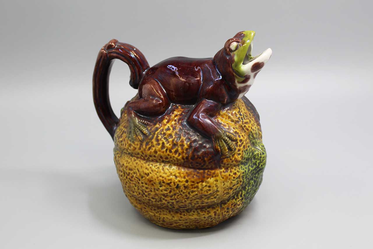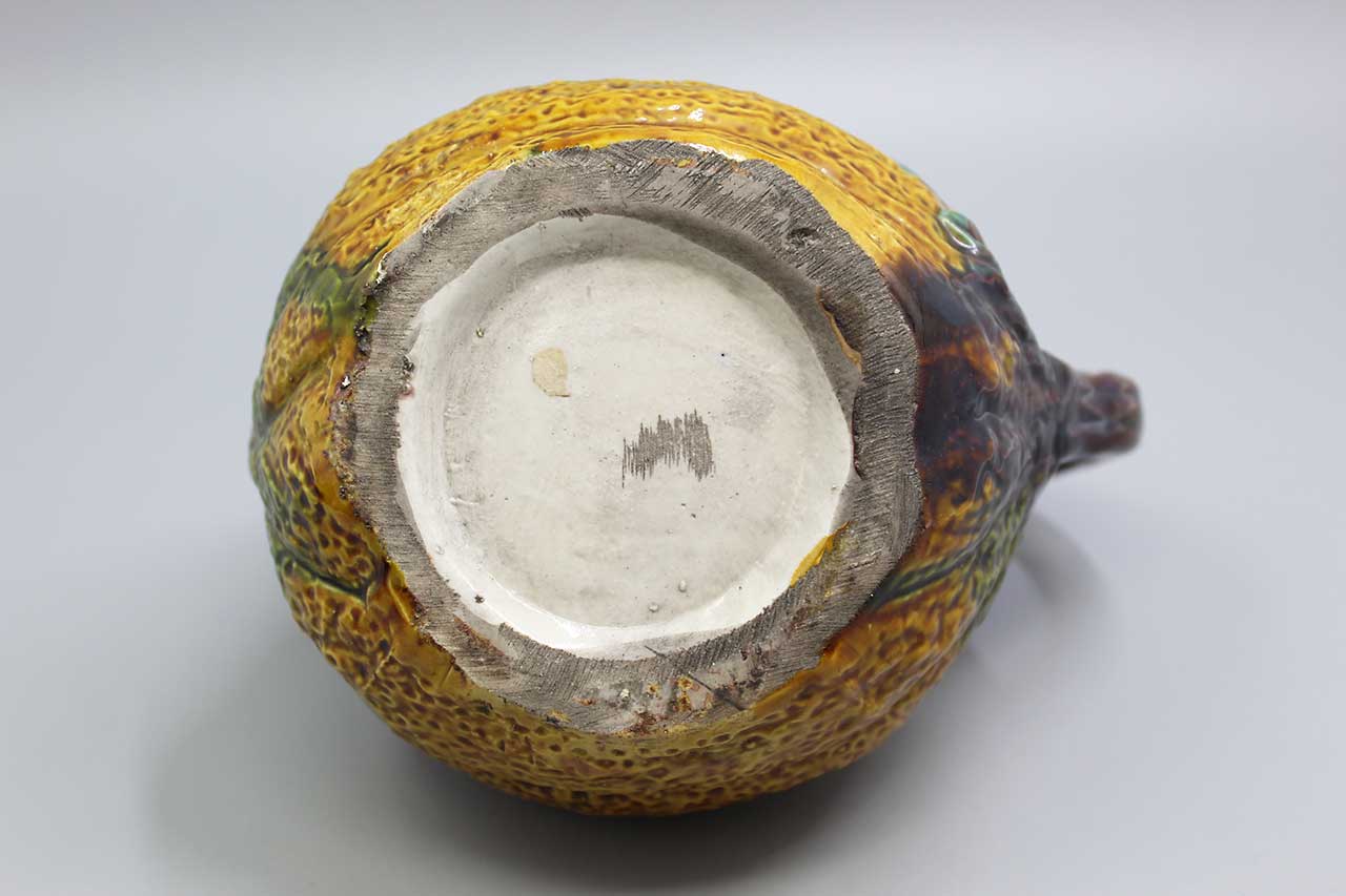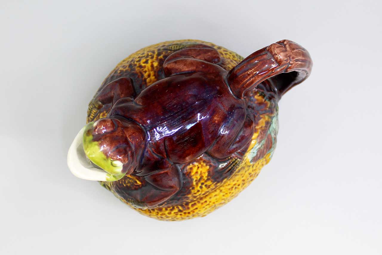 This unique teapot is sure to be a standout piece in any collection. With a ceramic material and a semi-gloss finish, it features a novelty lizard laying on a melon. The teapot has one compartment and comes with a handle in the shape of the lizard’s tail for easy pouring. I believe it was produced in the 1980s, this original piece is a must-have for any animal or dinosaur enthusiast. The orange color and Salamander/lizard character make it a fun addition to any kitchen or dining room. Whether you’re using it for tea or as a decorative piece, this vintage teapot is sure to impress.