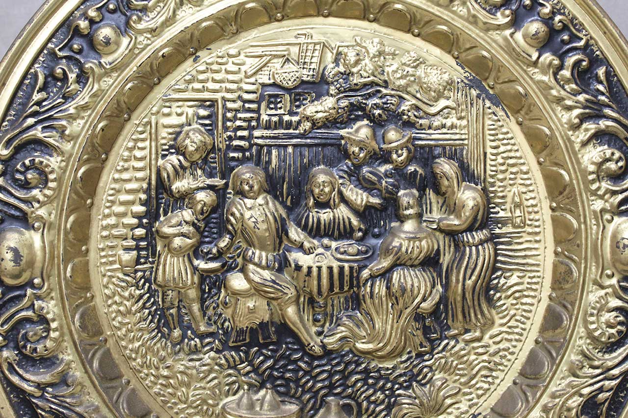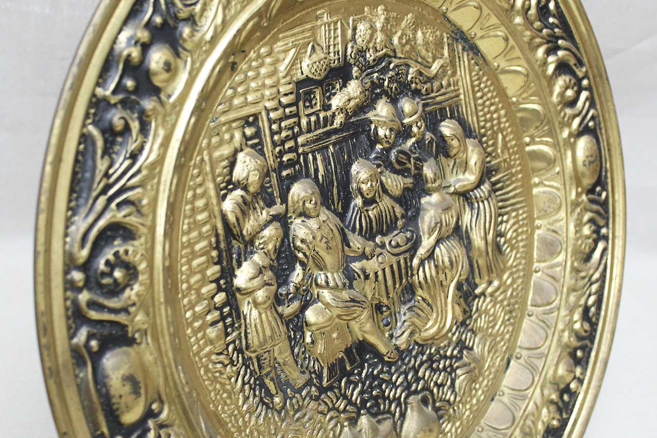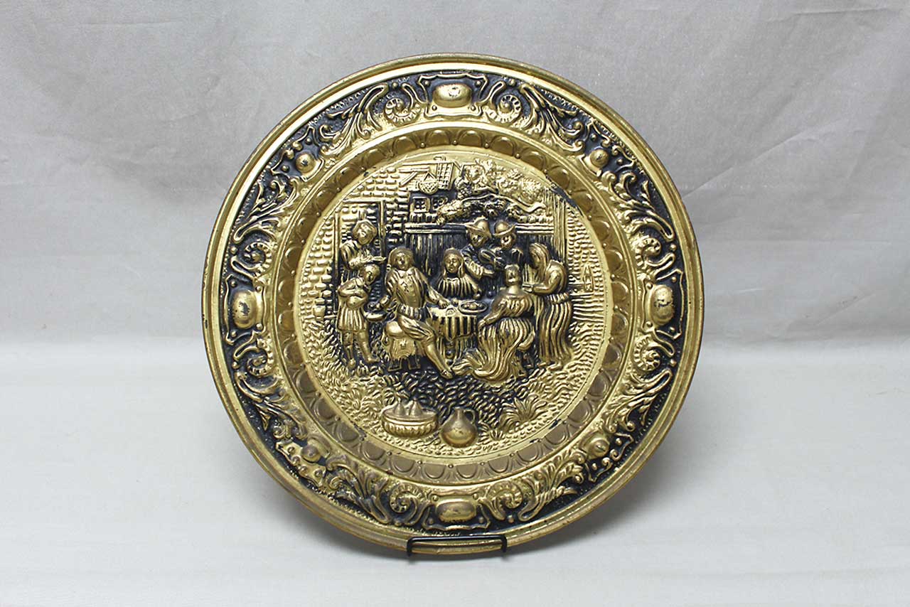 Vintage brass wall plate, dating from the mid-20th century, featuring a raised relief scene of a tavern interior. The scene depicts people gathered around a table, drinking and socializing, with details such as mugs, a hat, and brickwork adding to the ambiance. The plate is further adorned with an ornate border of floral and foliate designs.