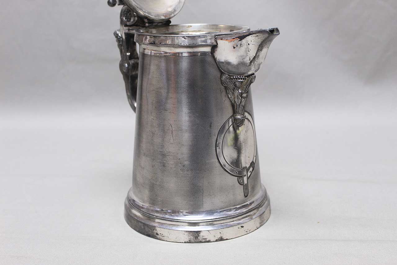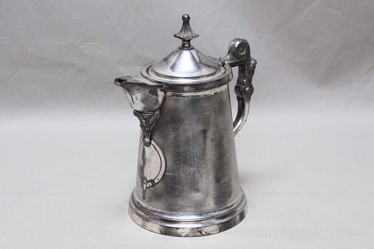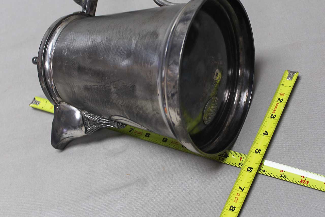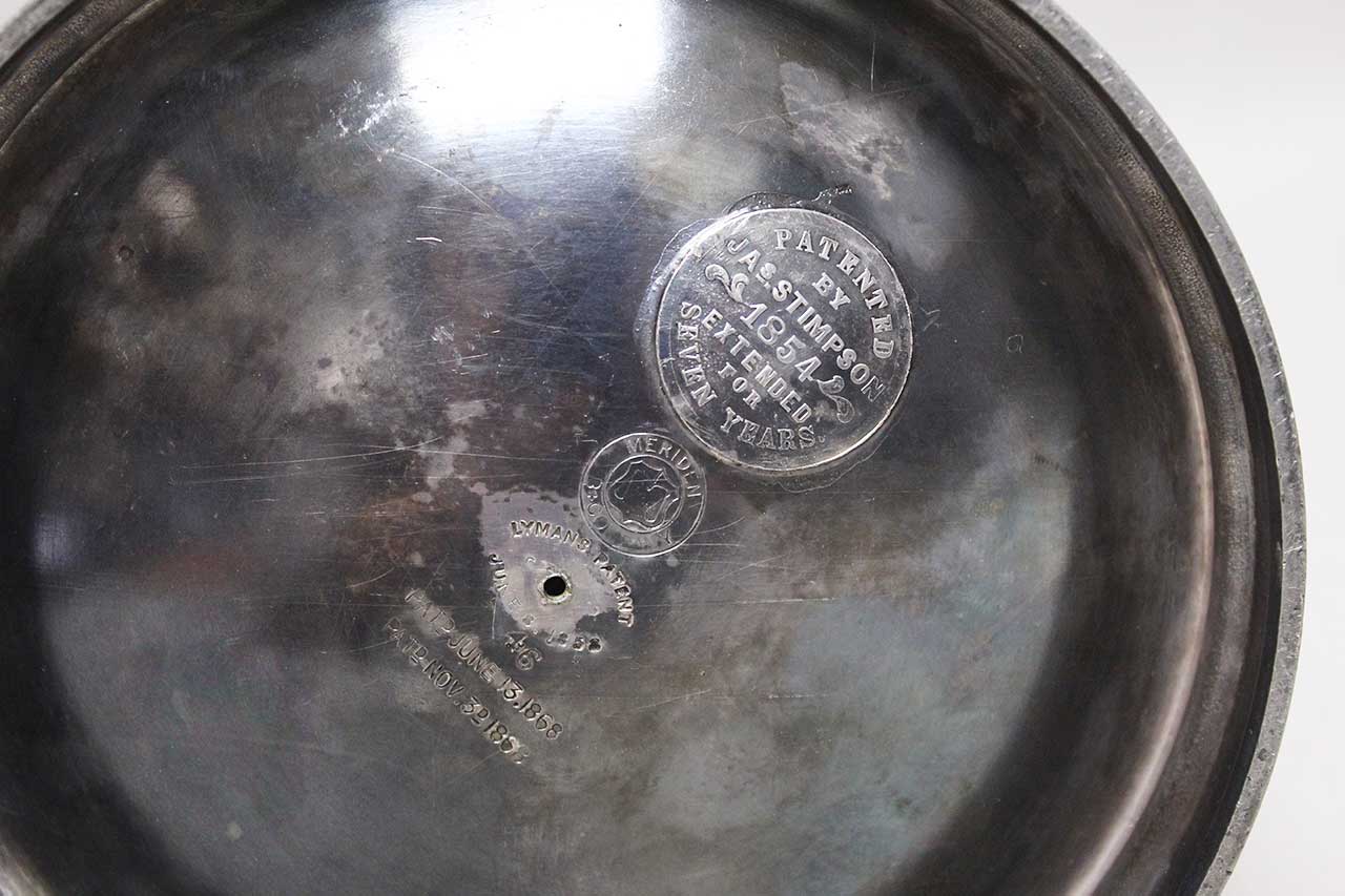 1868 Large Ice Water Picture Meriden Co. Has indentation on one side. Several markings on bottom of teapot including: Patented by JA S. Stimpson 1854 Extended for seven years; Meriden Company logo; Layman’s patent 1858; Patent June 13, 1868; Patent Nov 3d 1868. Height approximately 12 inches. Heavily worn condition.