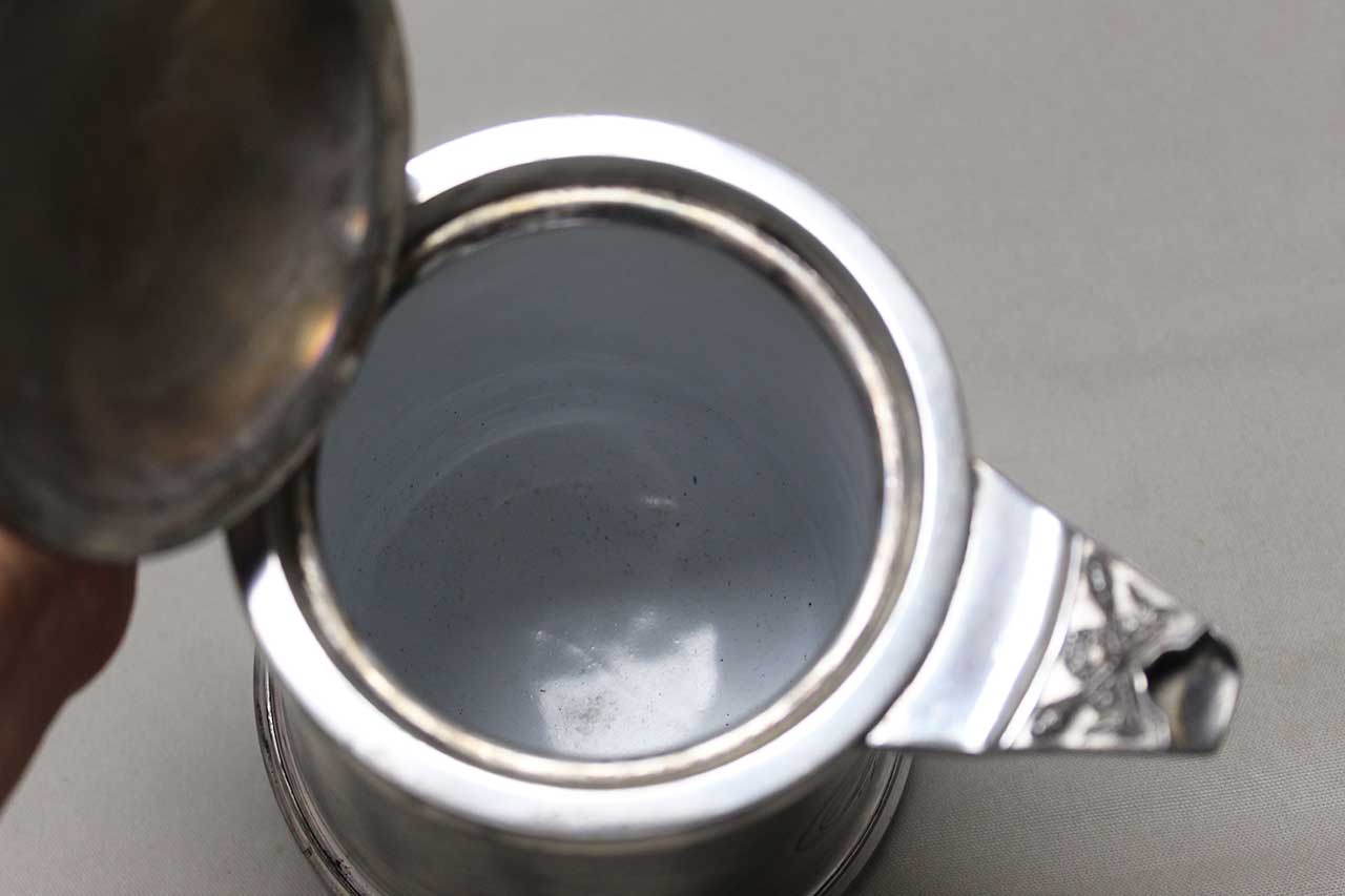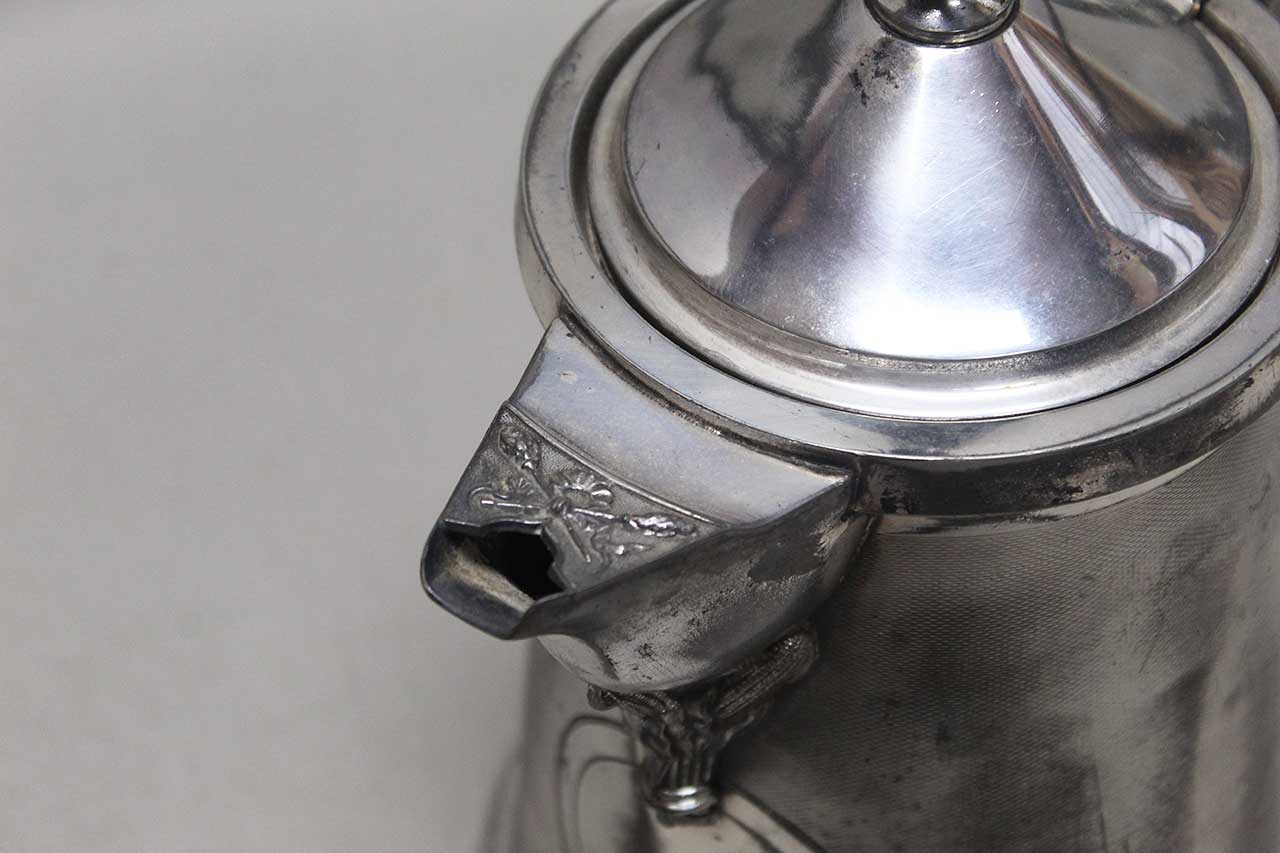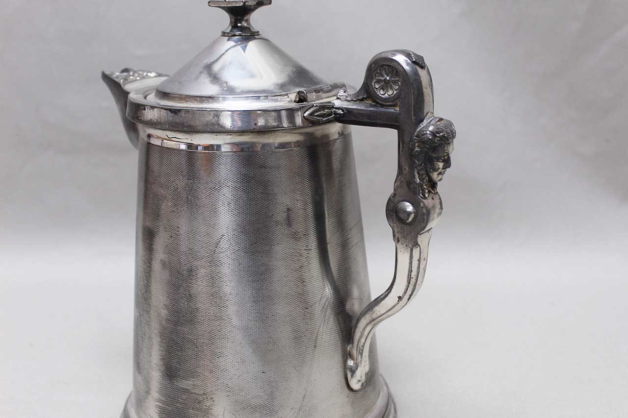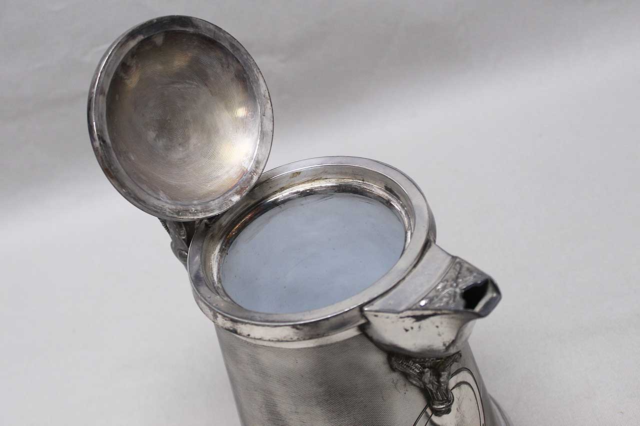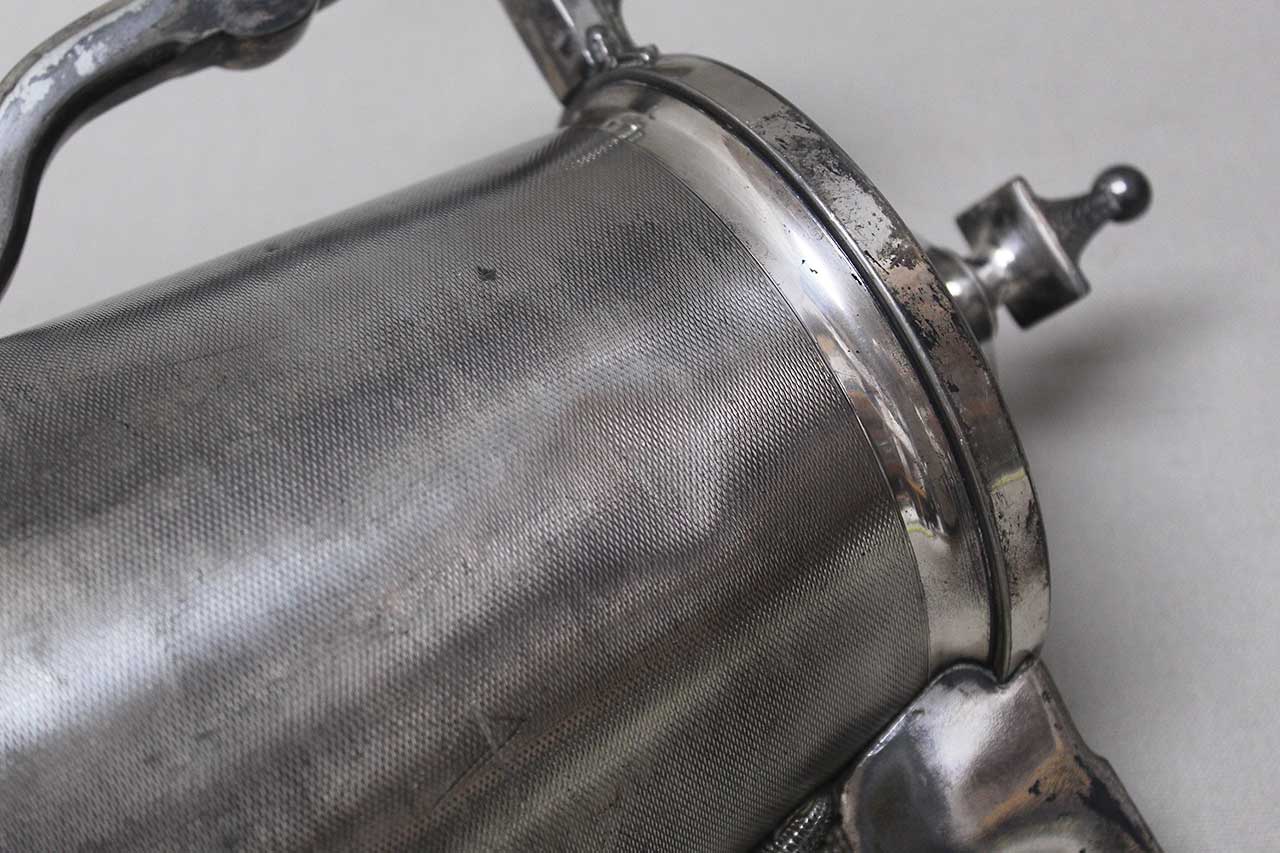 1868 Large Ice Water Picture Meriden Co. Has indentation on one side. Several markings on bottom of teapot including: Patented by JA S. Stimpson 1854 Extended for seven years; Meriden Company logo; Layman’s patent 1858; Patent June 13, 1868; Patent Nov 3d 1868. Height approximately 12 inches. Heavily worn condition.