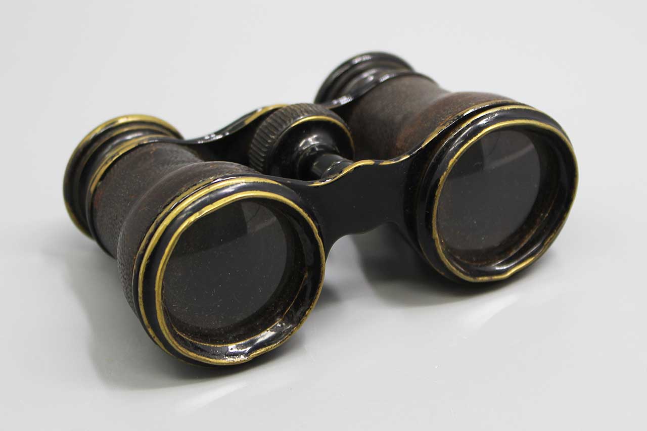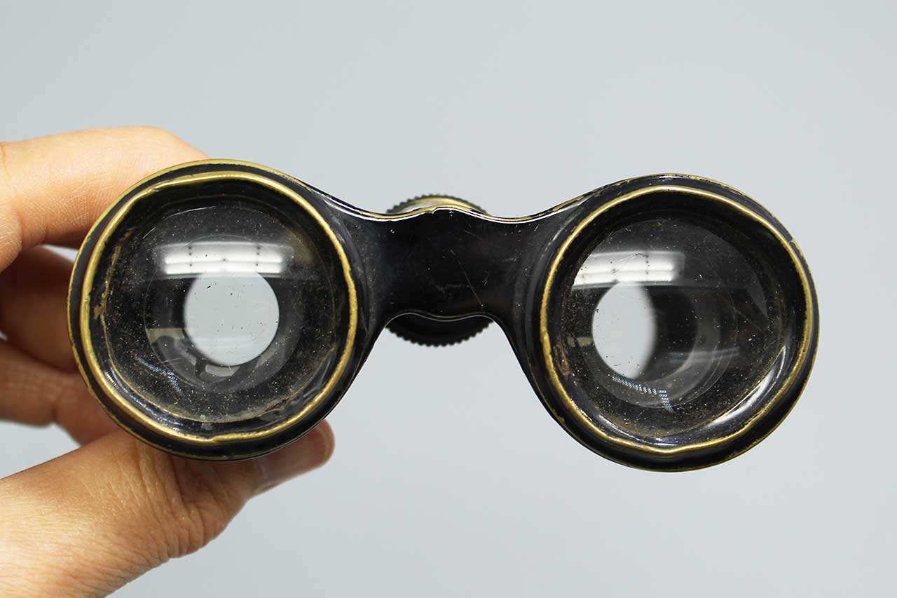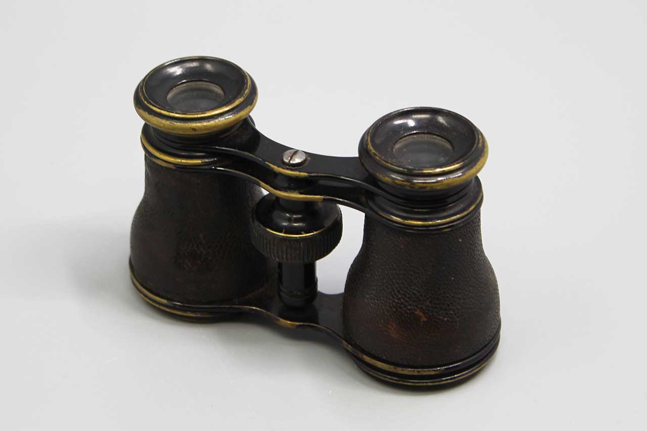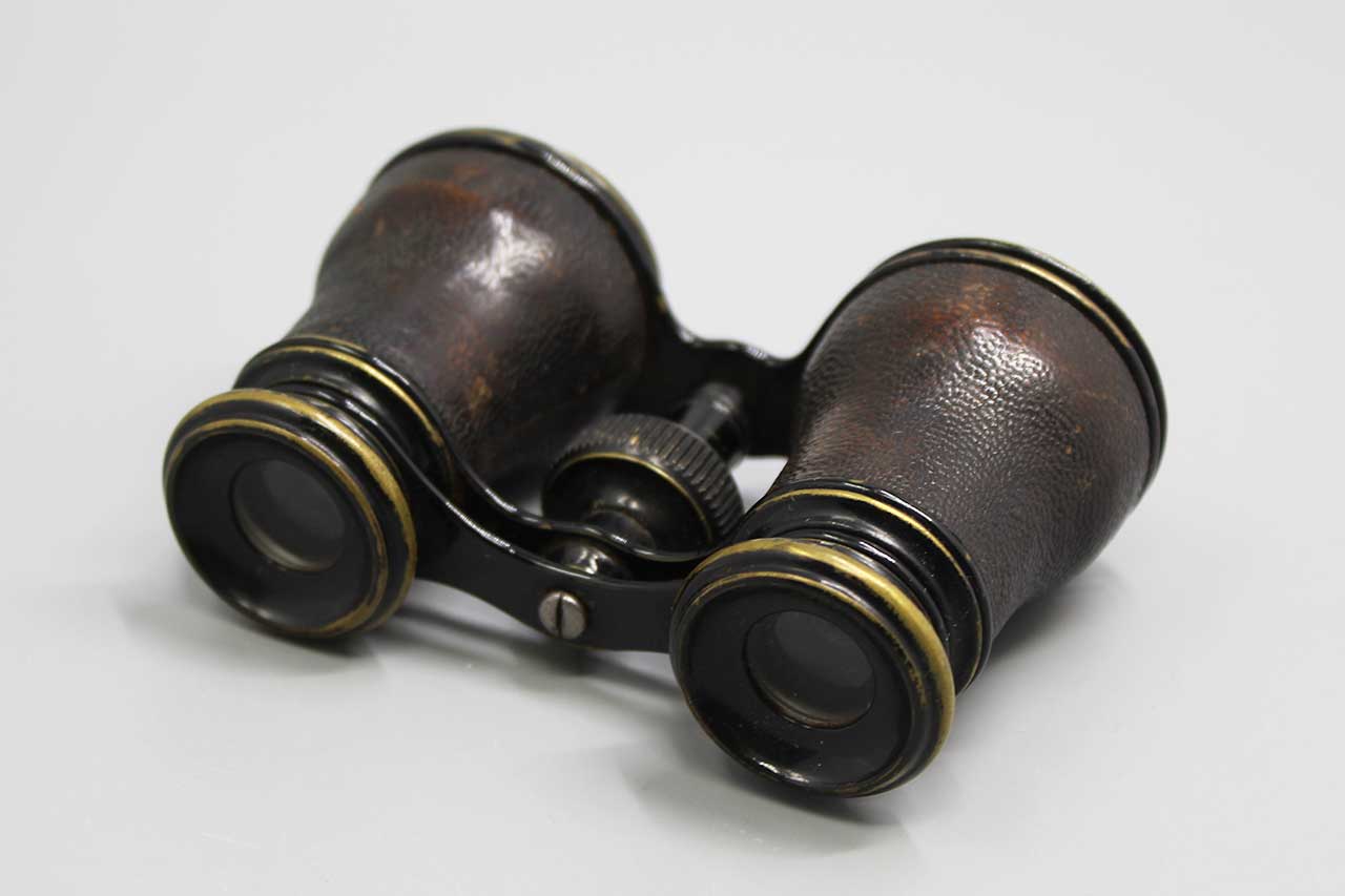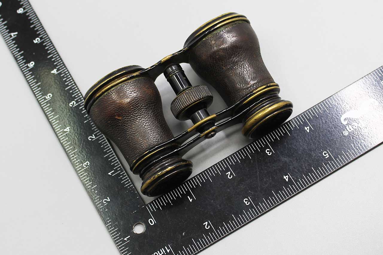 Antique Opera Glasses (Binoculars). Brass base material with leather covering. Optics in decent condition with some black specs. Most likely 1800s to early 1900s. Heavily worn condition.