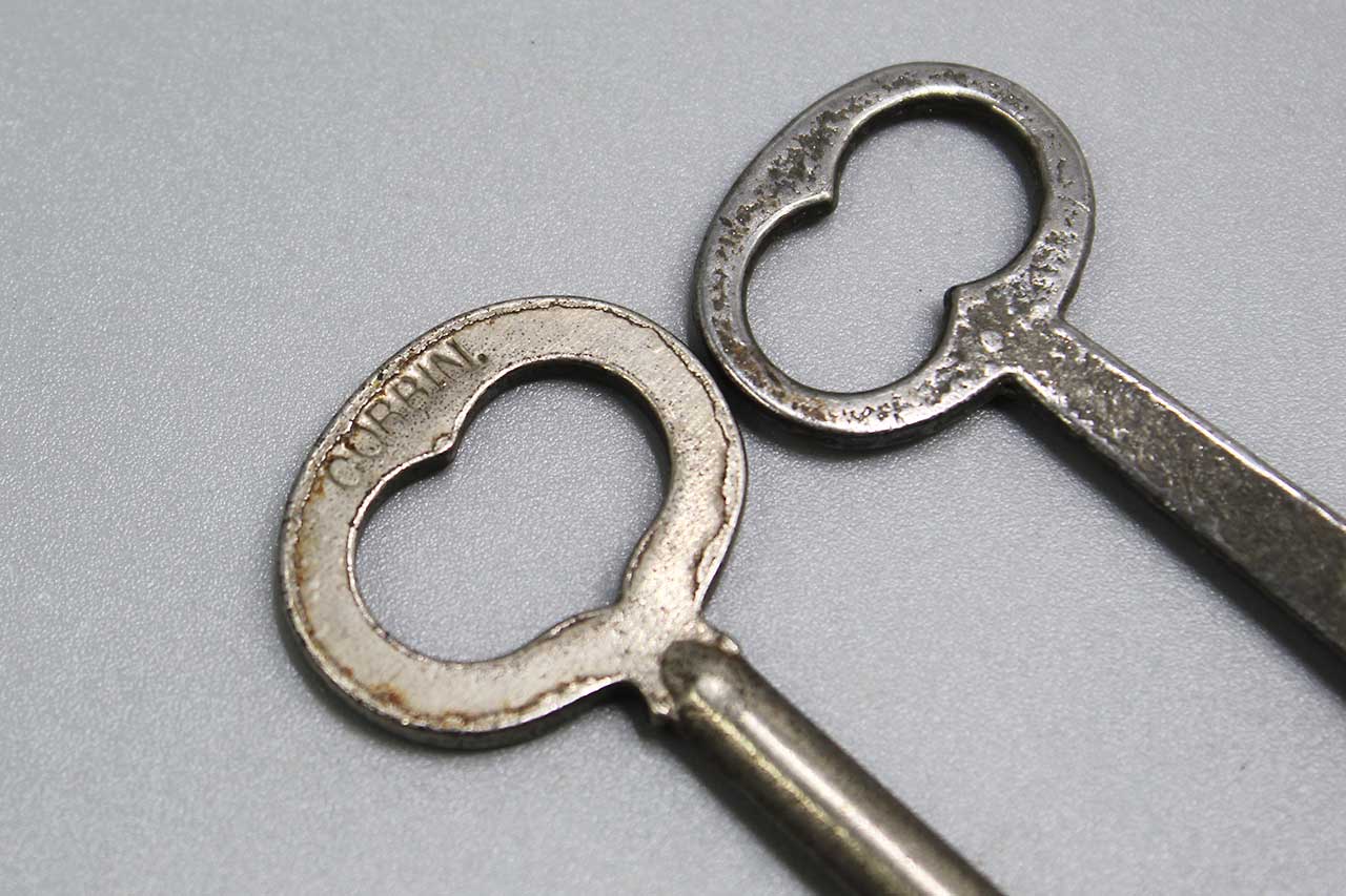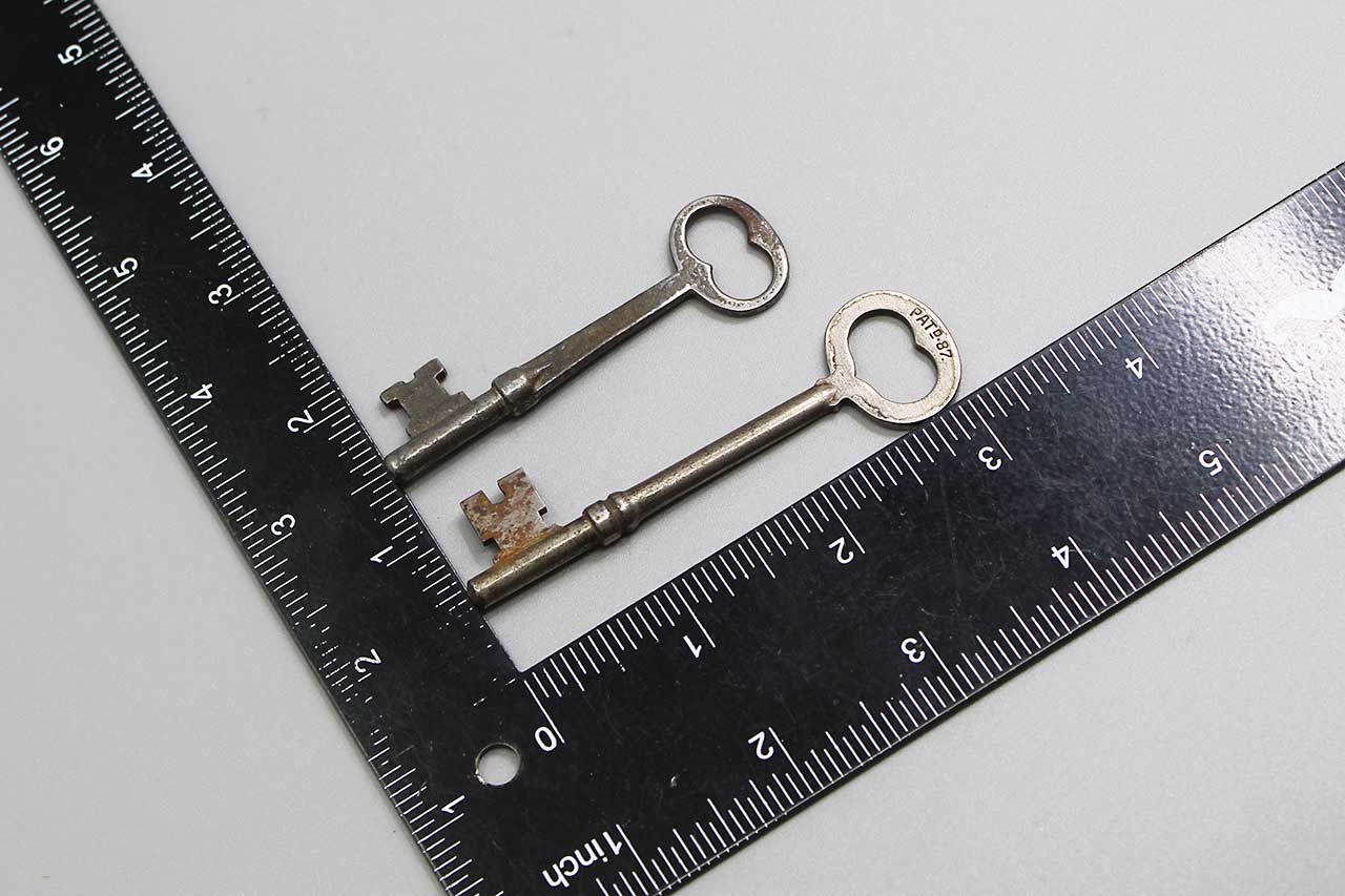 Two Railroad Caboose Keys. One key marked “Corbin” on one side and “Pat’d 87” on other side. Size of one key approximately 3 inches in length and other key about 2 3/4 inches in length. Very worn condition.