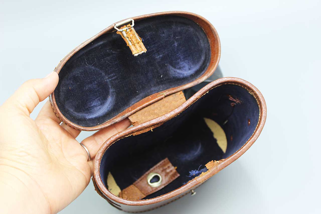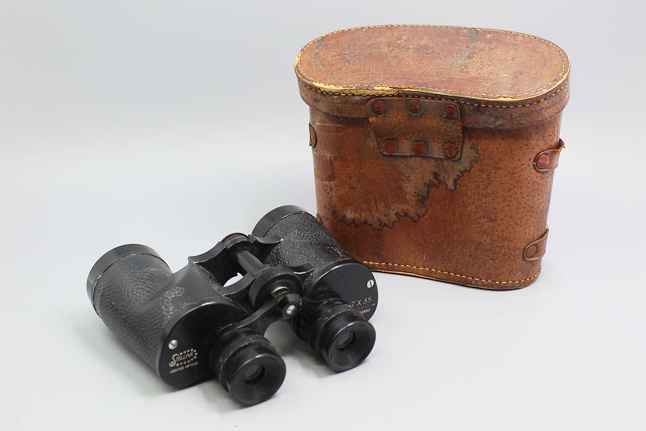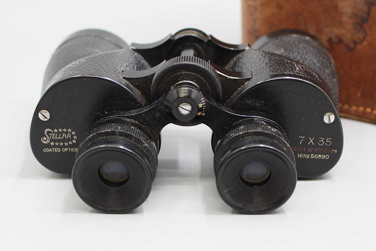 Vintage Binoculars with case. Binoculars marked: Stellar Coated Optics, 7×35 No 56890. Case is very heavily worn and pull down tab broken. Optics seem decent. Overall, worn condition.