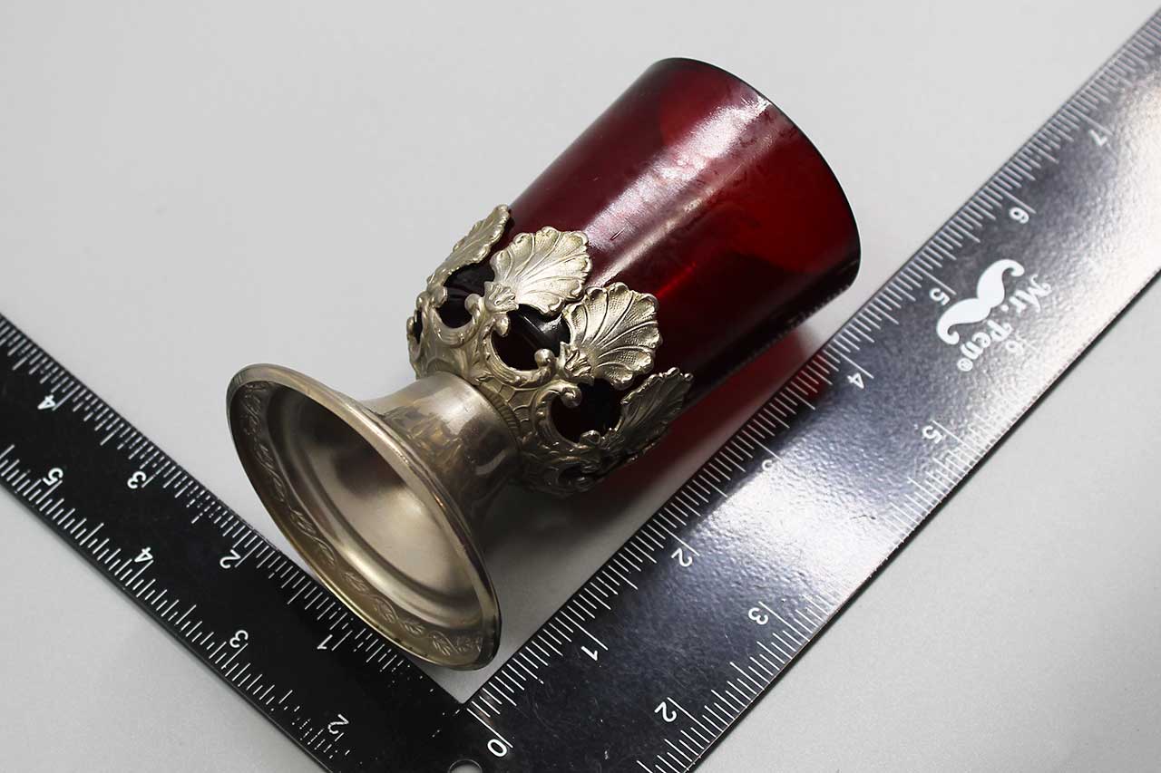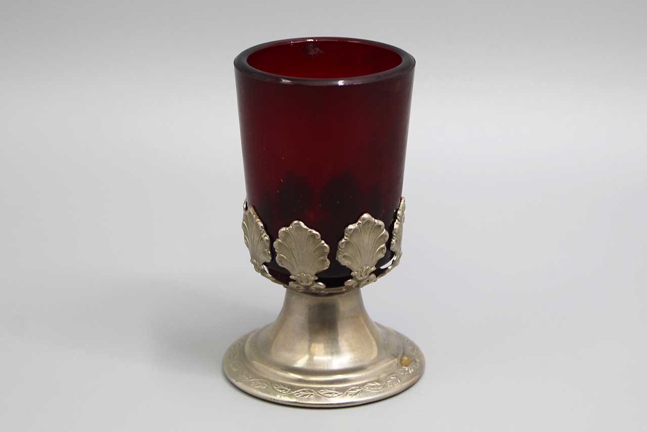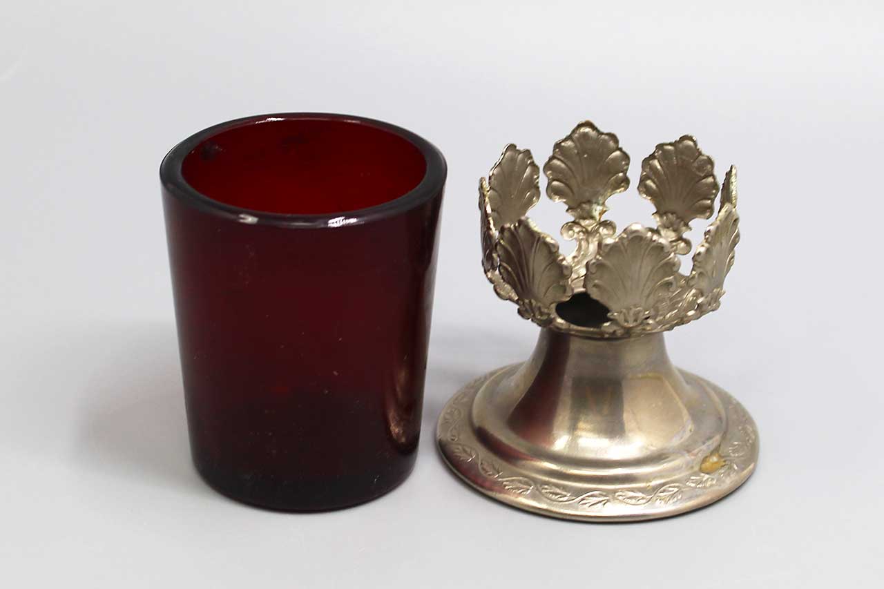 Vintage Red Glass Candle Holder. Height approximately 4 1/2 inches. Worn condition.