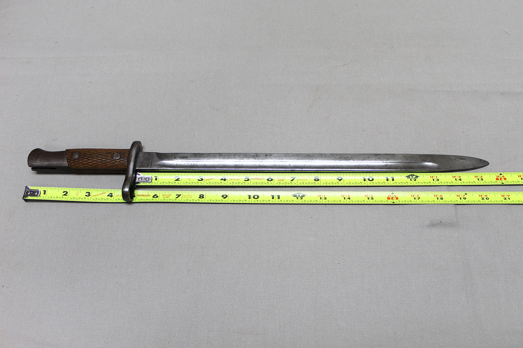 Spanish Artillery M1913 Bayonet. No Scabbard. Checkered wood grips in good condition. Marker marked on blade ricasso: Arilleria Fca Nacional Toledo, marker mark is quite worn. This one has the lowest serial number I have seen, serial number “236”. Blade approximately 15 1/2 inches in length, about 20 1/2 inches overall length. Blade in good basic condition.