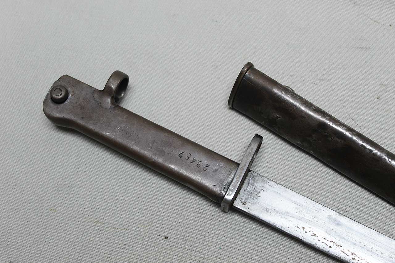 WW1 German Ersatz Bayonet. Serial numbered on grip: 23457. Approximately 10-inch blade. Probably a Turkish cut-down conversion. Very heavily worn condition.