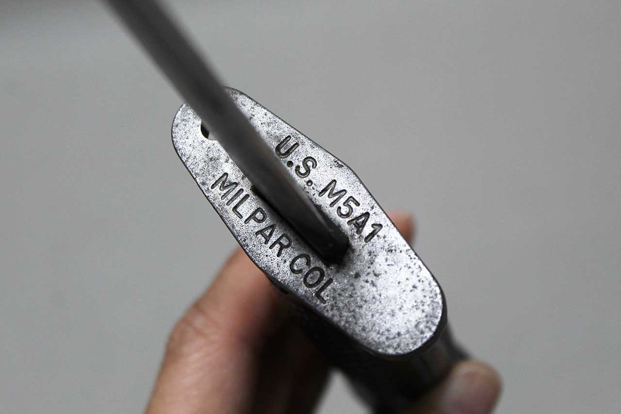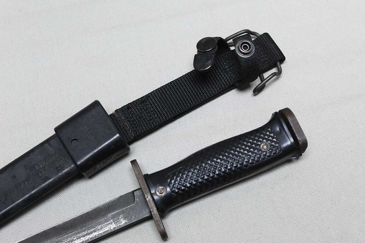 United States Army M5A1 Bayonet. Stamped US M5A1 Milpar Col under cross guard area. U.S. M10 scabbard. Decent condition blade that has been sharpened especially near tip area and measures approximately 6 5/8 inches. Heavily worn condition.