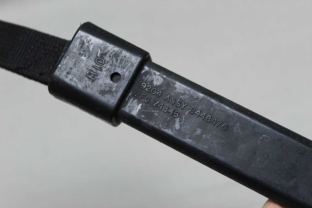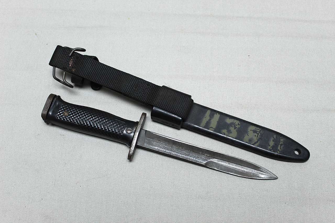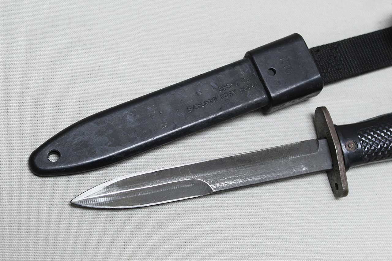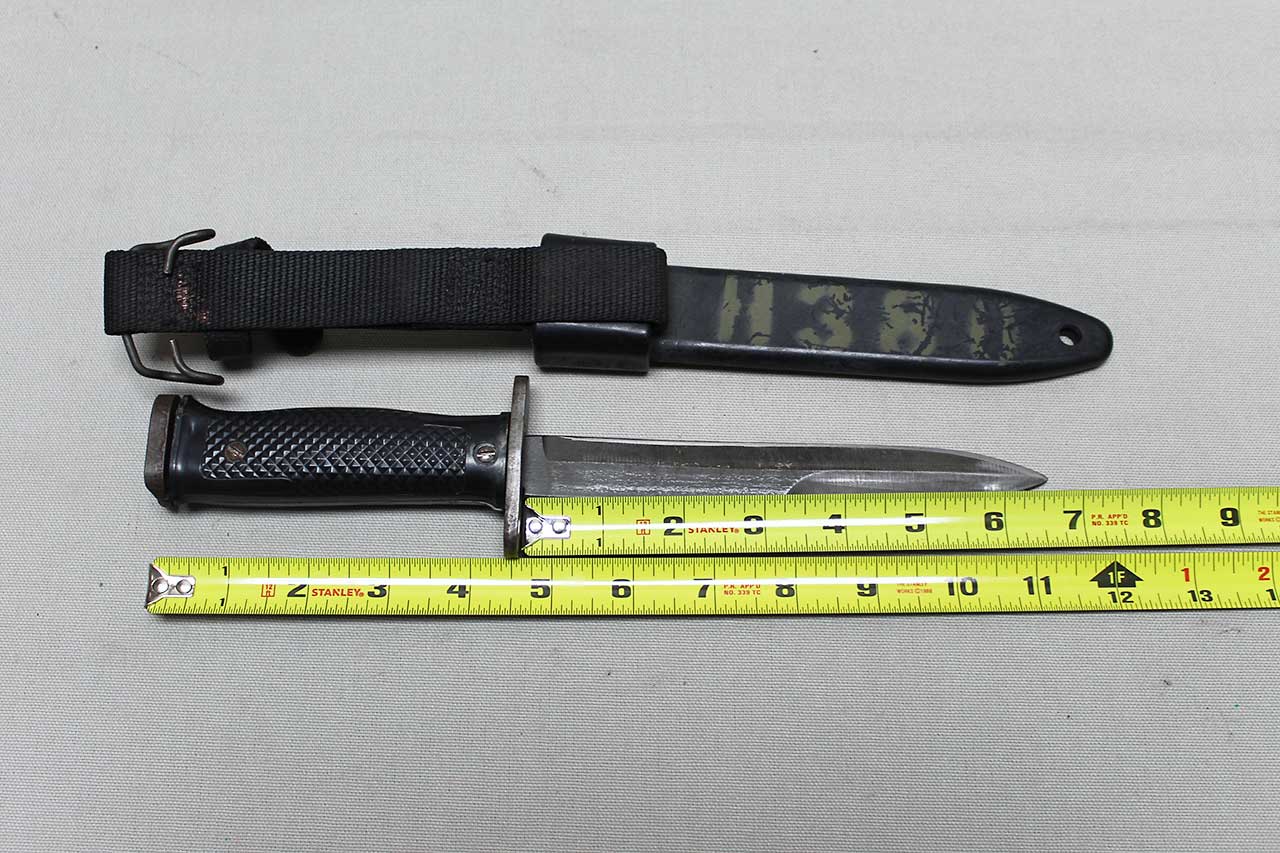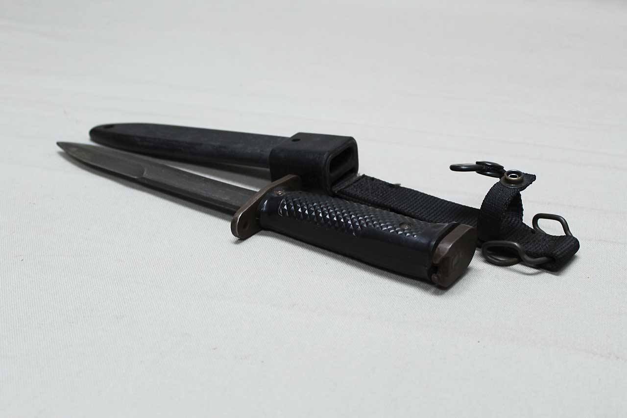 Additional Notes: The U.S. M5 bayonet has a 6 3/4 inch blade, and overall length is 11 1/2 inches. The blade has one side sharpened for its full length and three inches of the other side are sharpened. There is a large push button release on one side. The M5 fits only the M1 and does not interchange with any other firearms. There were three different patterns made: M5, M5-1, and M5A1. The grips are checkered black molded plastic and all metal parts are a dark gray parkerized finish. There are no markings on the blade. The manufacturer name or initials and “US M5” (or other model) will be found stamped under the cross guard. Many M5 family of bayonets were made in Korea after the Korean War and these will have “K” stamped in place of the “US”. Manufacturers included Aerial Cutlery, Jones & Dickinson Tool, Imperial Knife, Utica Cutlery, and Columbus Milpar & Mfg. The M5A1 was manufactured during the 1960s and was the last bayonet made for the M1 Garand.