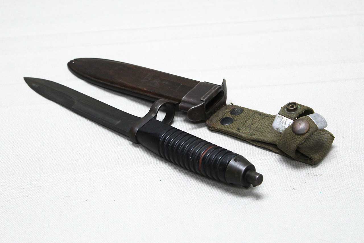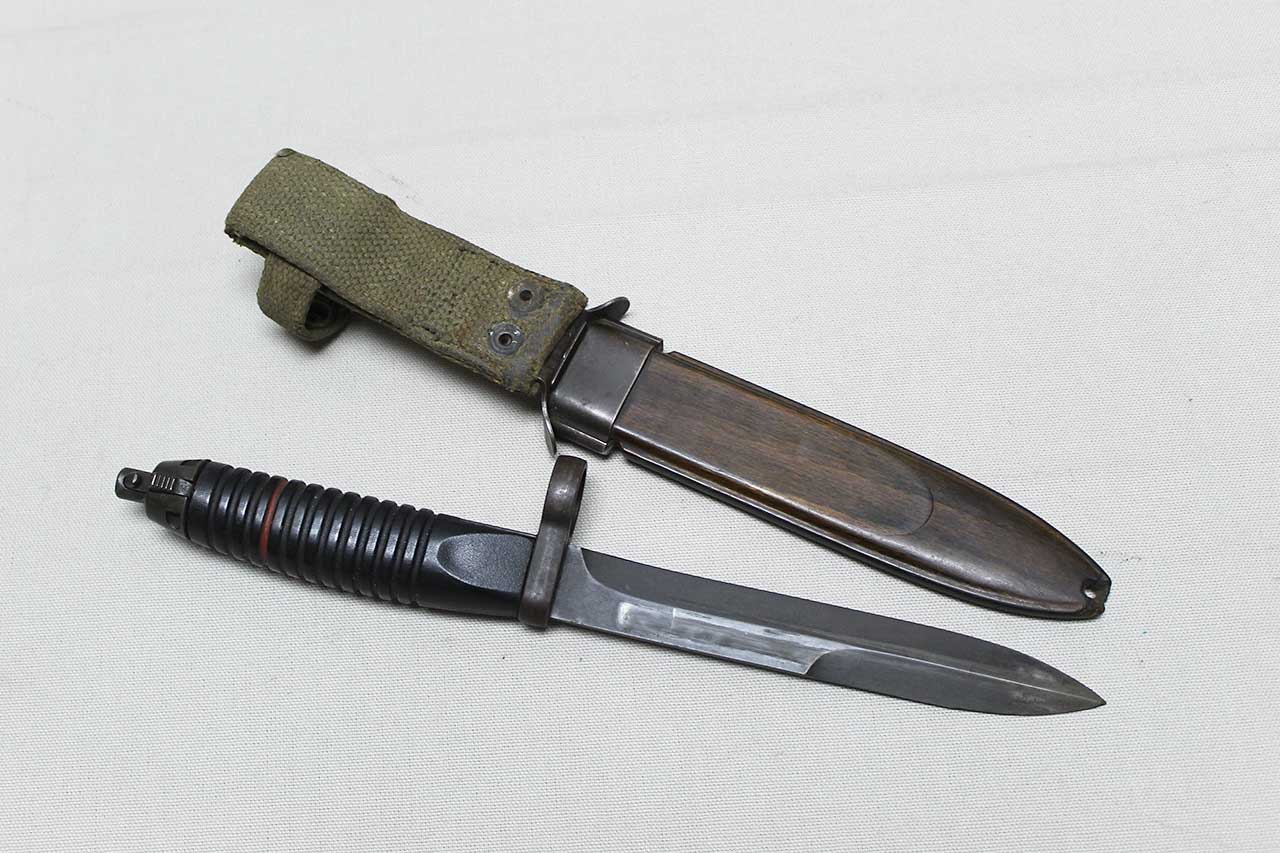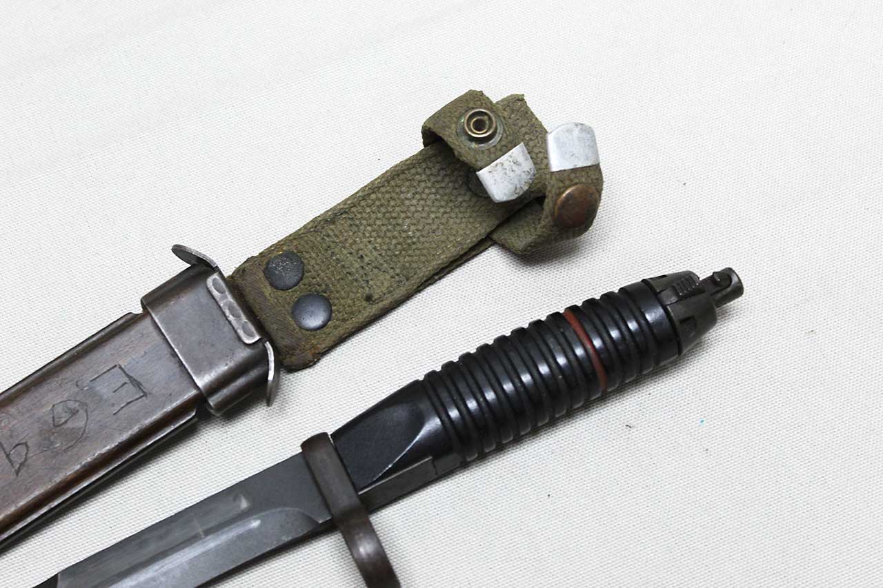 Additional Notes: The early-production German G3 bayonet and scabbard made by Heckler & Koch. These were introduced in 1959 and adopted by the German Bundeswehr. These bayonets used a blade patterned after the WW2 U.S. M1 Carbine design and featured a 12-groove black plastic handle with the release located at the 9 o’clock position when viewed from the rear. The metal parts are Parkerized on these from the factory including the blade, and they were all un-marked. The early production examples came with a unique scabbard which appears to be wood, however, is actually wood-grained plastic-polymer.