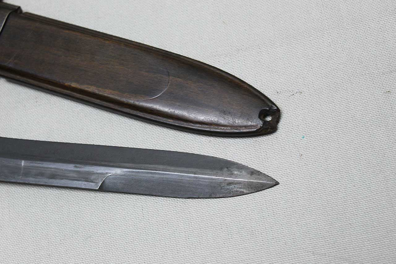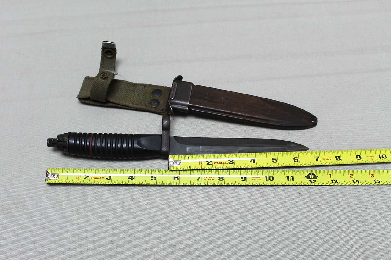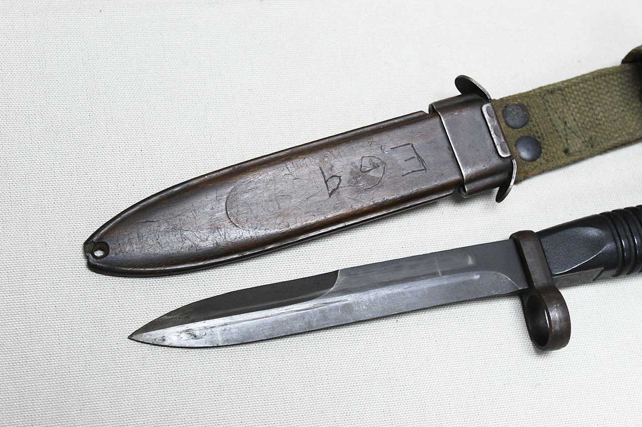 Additional Notes: The early-production German G3 bayonet and scabbard made by Heckler & Koch. These were introduced in 1959 and adopted by the German Bundeswehr. These bayonets used a blade patterned after the WW2 U.S. M1 Carbine design and featured a 12-groove black plastic handle with the release located at the 9 o’clock position when viewed from the rear. The metal parts are Parkerized on these from the factory including the blade, and they were all un-marked. The early production examples came with a unique scabbard which appears to be wood, however, is actually wood-grained plastic-polymer.