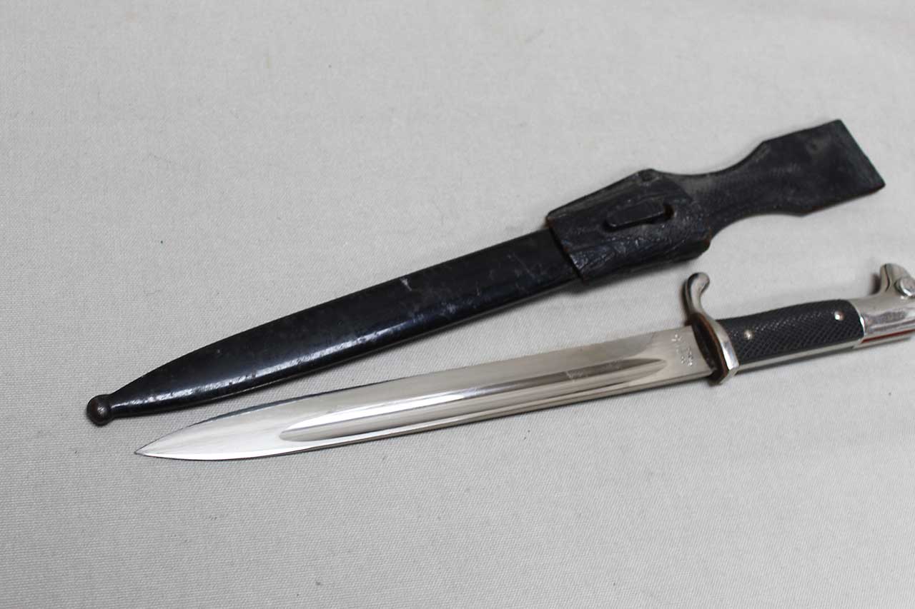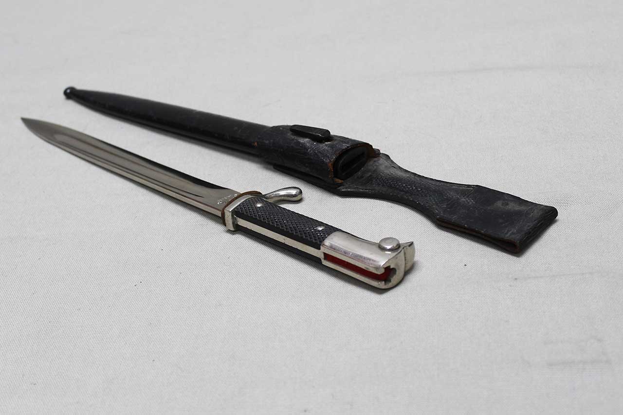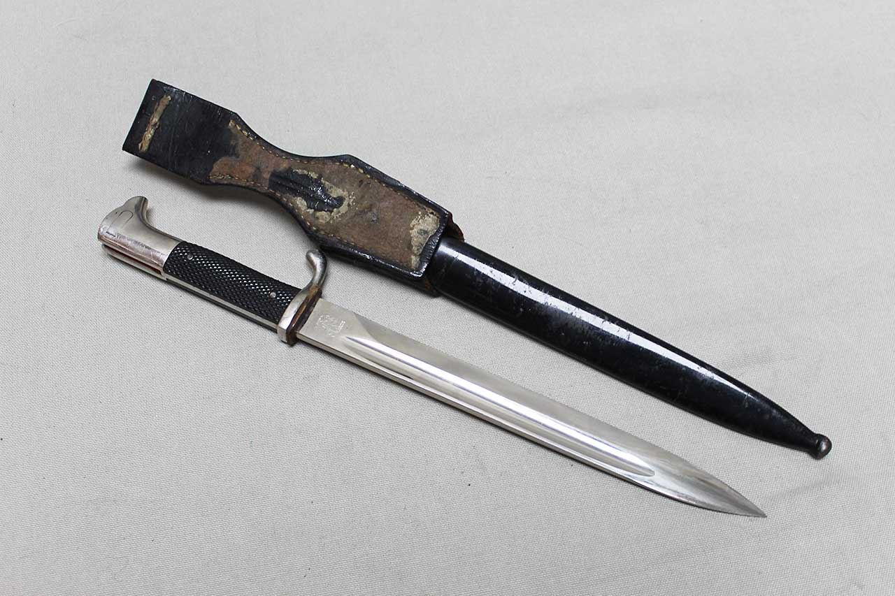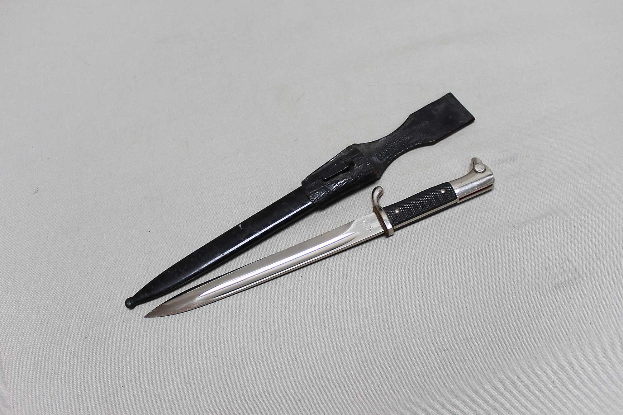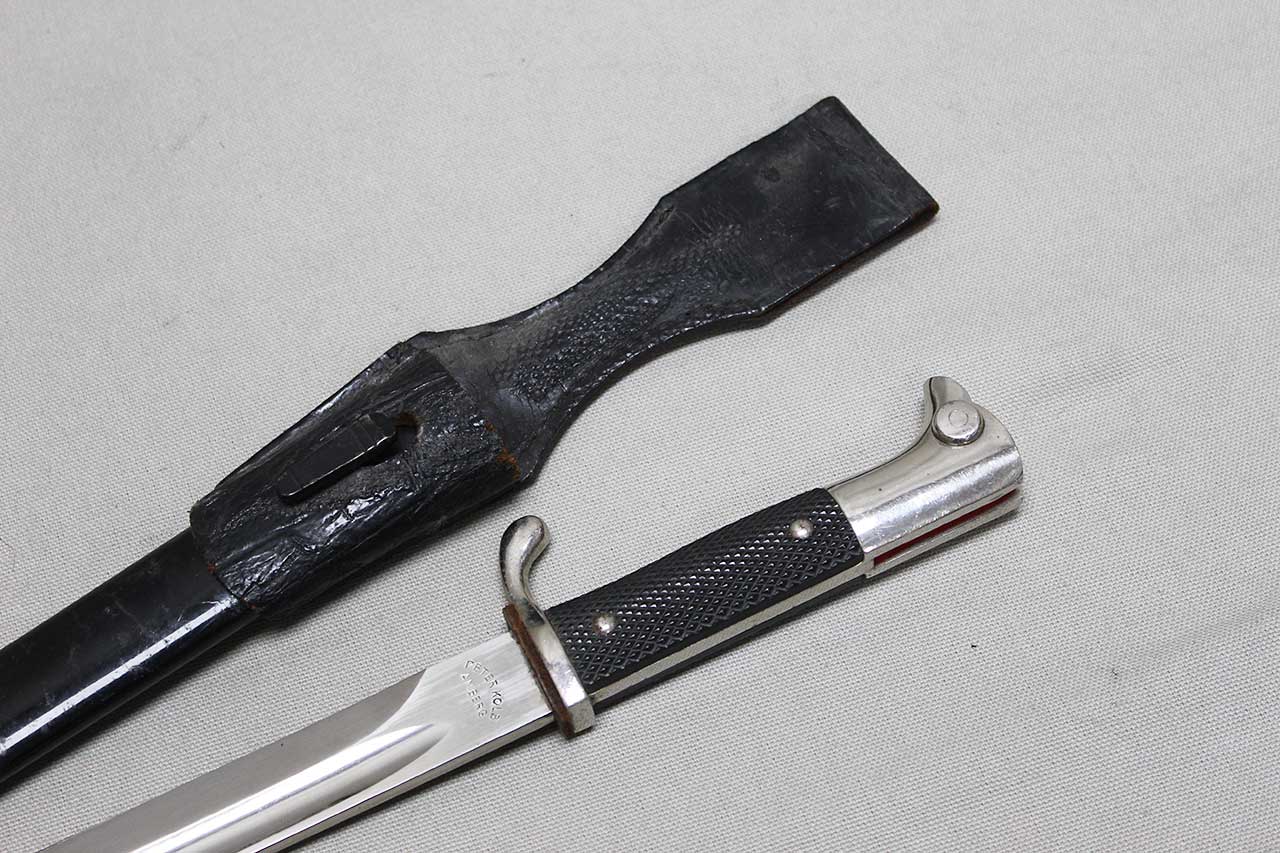 Additional Notes: The WW2 German Army Dress Bayonet was a ceremonial version of the standard K98 bayonet, designed for parade and dress occasions rather than combat. These bayonets were often nickel-plated, featuring stag or bakelite grip plates and a black-painted scabbard. Unlike functional bayonets, they lacked a sharpened edge and were primarily ornamental. Collectors often seek maker-marked examples from Solingen manufacturers like E. Pack & Söhne, Alcoso, and Robert Klaas. Some versions included etched blades with unit insignia or personalized engravings. Occasionally, a troddel (bayonet knot) was attached to the hilt to indicate the rank or branch of the wearer.