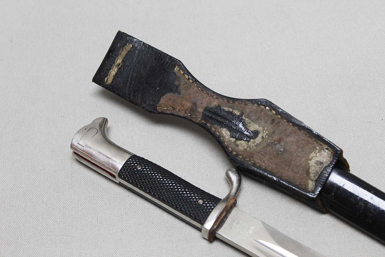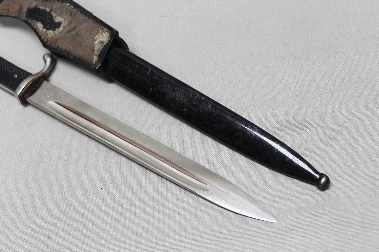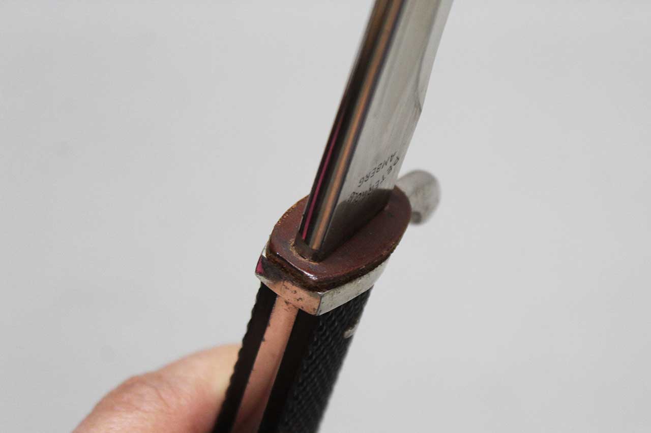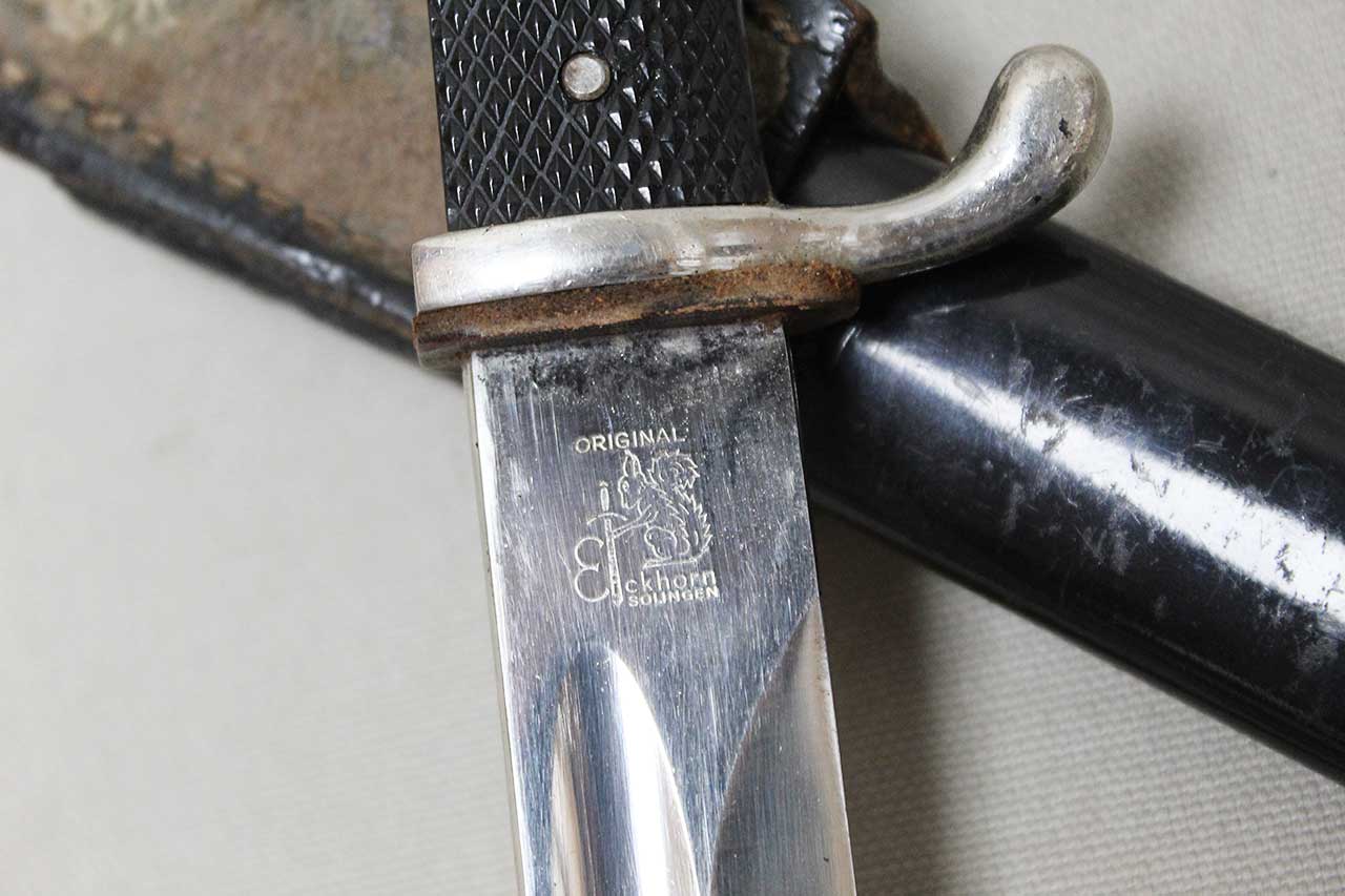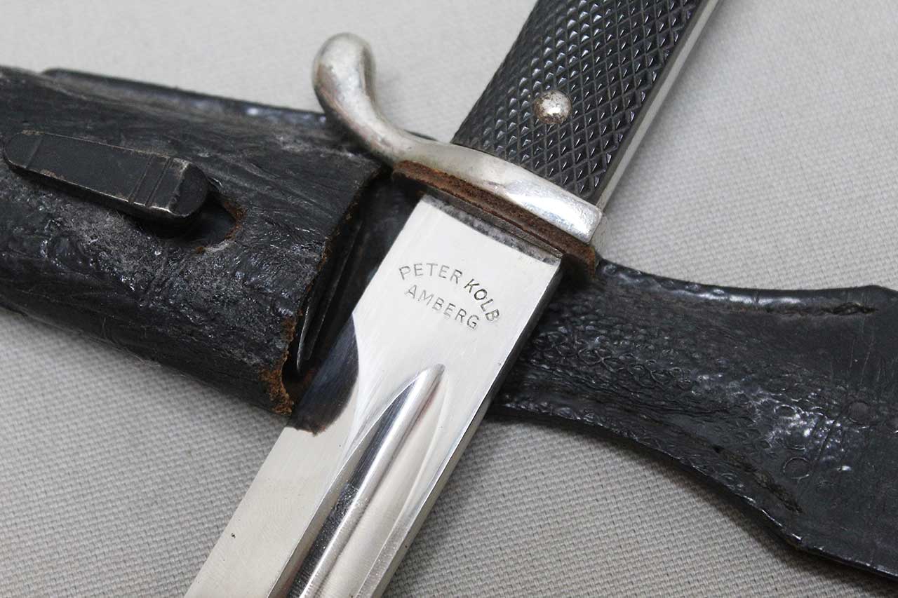WW2 German Army long dress bayonet with frog. Marker marked on one side of the blade ricasso with the logo for Eickhorn Solingen and marked on the other side of the blade ricasso with the distributor mark for Peter Kolb Amberg. Nice clean blade, good fittings and grip. Good condition scabbard. The red felt buffer pad still in bayonet slot. A lot of heavy wear to the leather bayonet frog. Blade length approximately 9 3/4 inches. Nice condition ww2 German dress bayonet with rarely seen distributor mark.