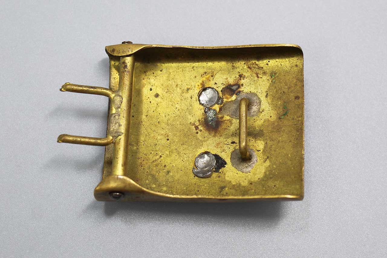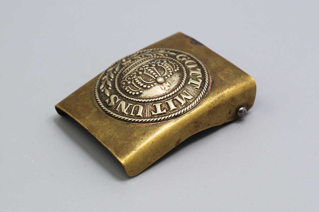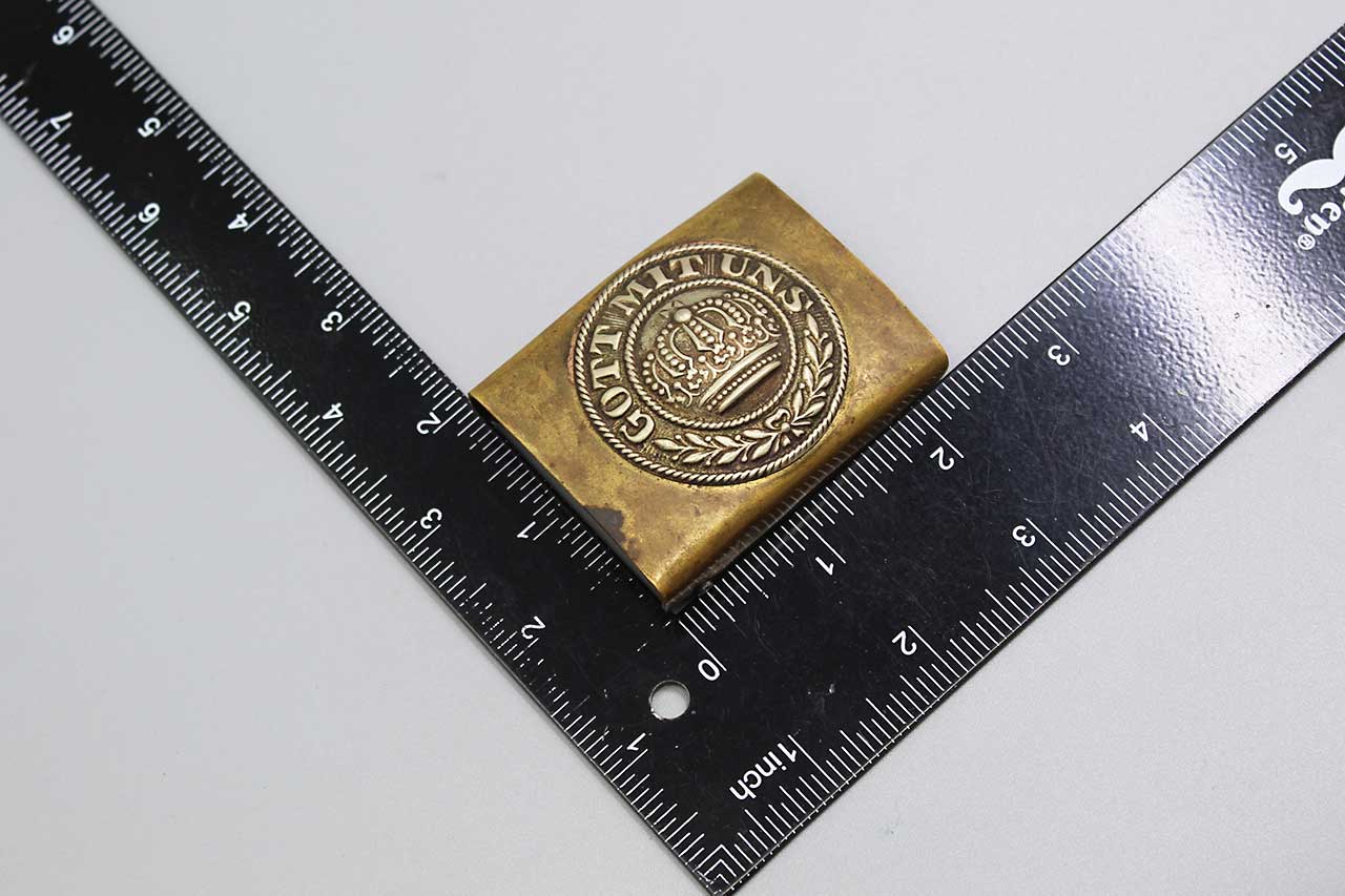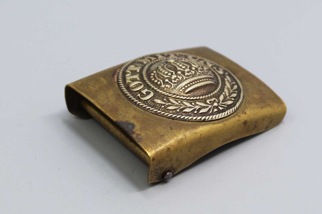 Imperial German M1895 Prussian EM/NCO buckle. Brass based buckle. Separately applied nickel center. Motto in center of buckle: “Gott Mits Uns” (God with Us). Worn condition.