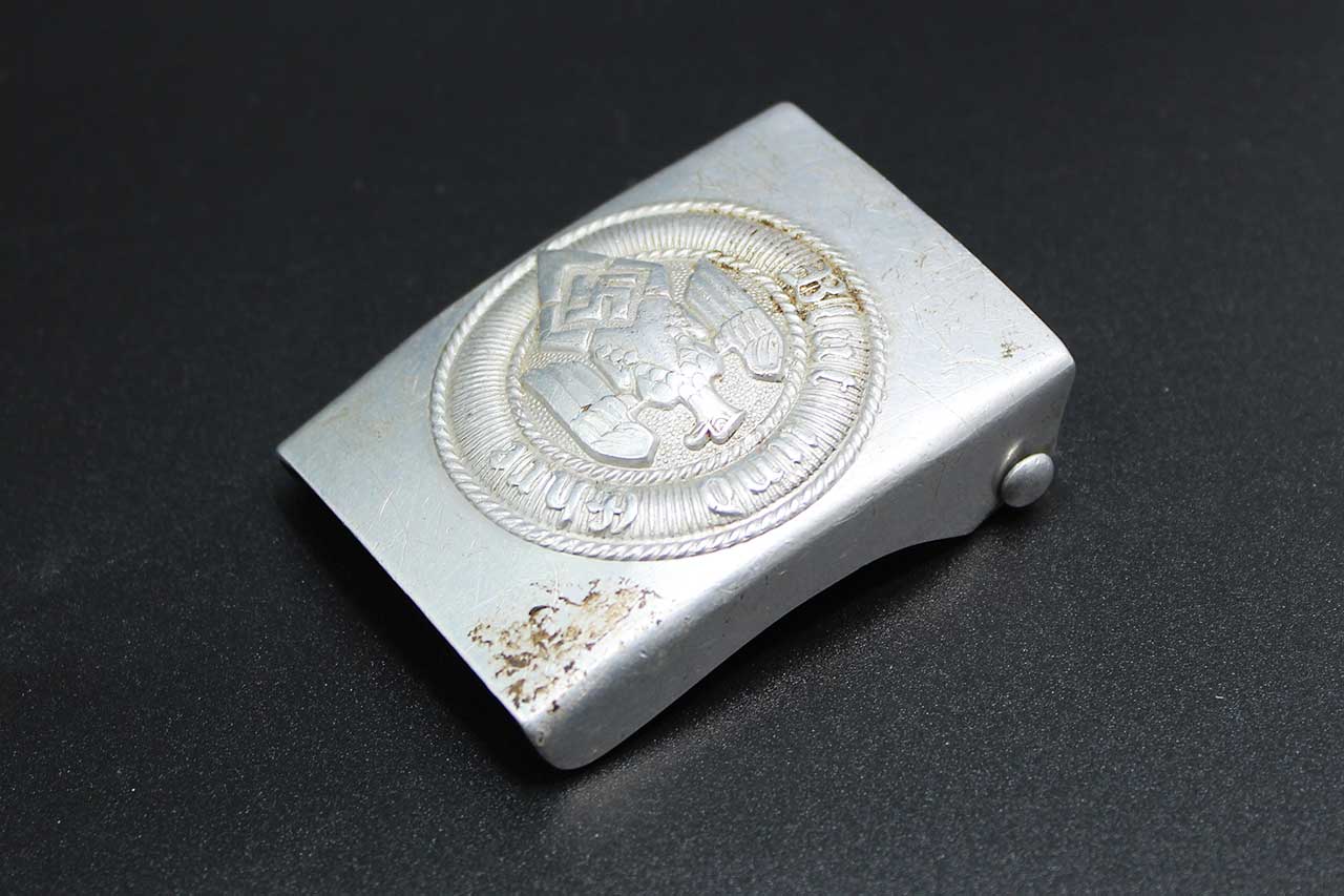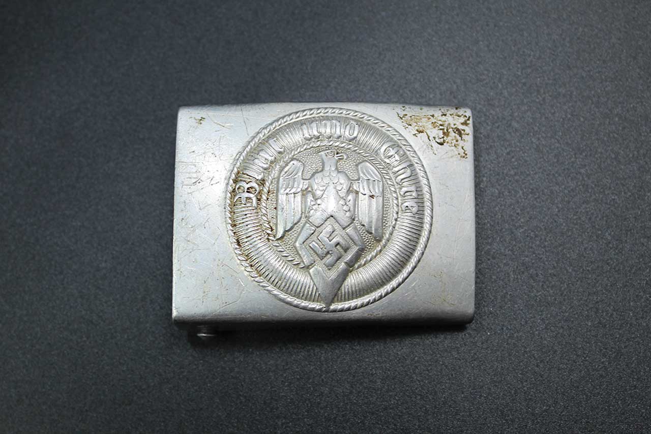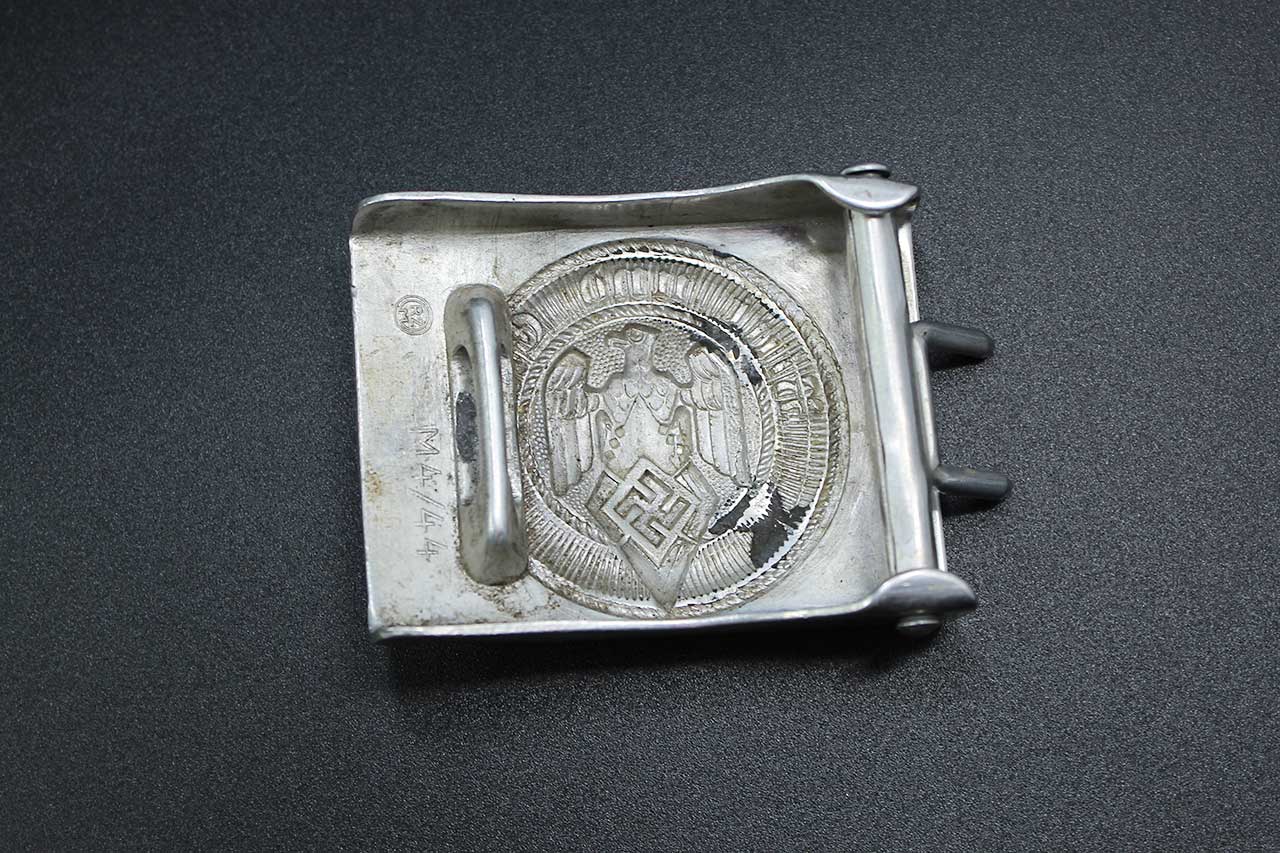 WW2 German HJ (Hitlerjugend) Buckle. Motto on front of buckle “Blut und Ehre” (Blood and Honor). Aluminum-alloy based buckle. Marker marked on back RZM M4/44 (for the marker of Paul Cramer & Co). Worn condition.