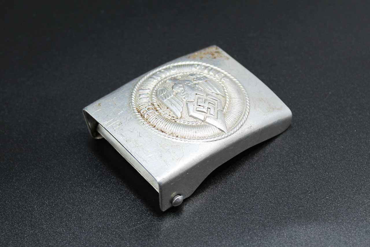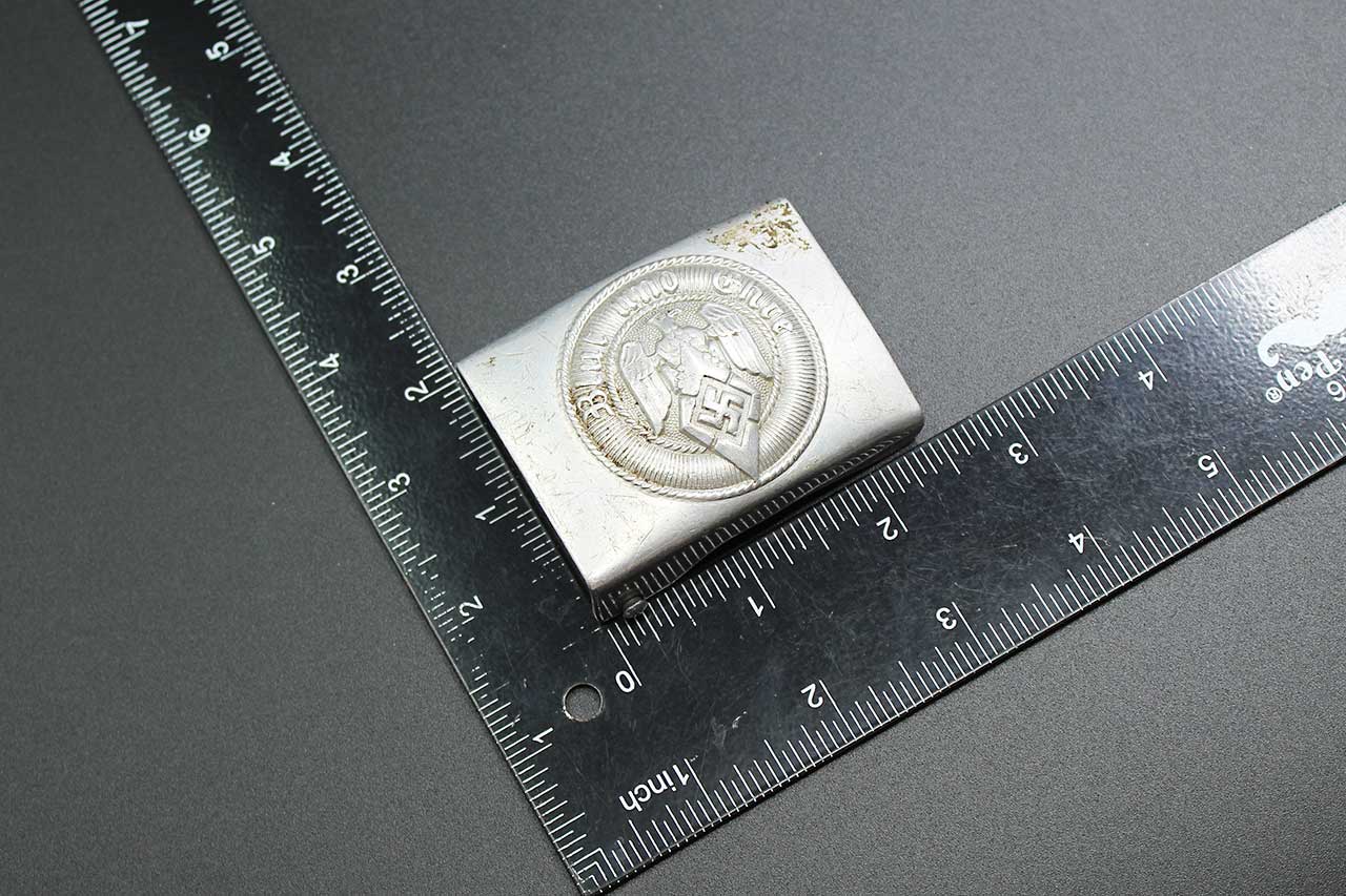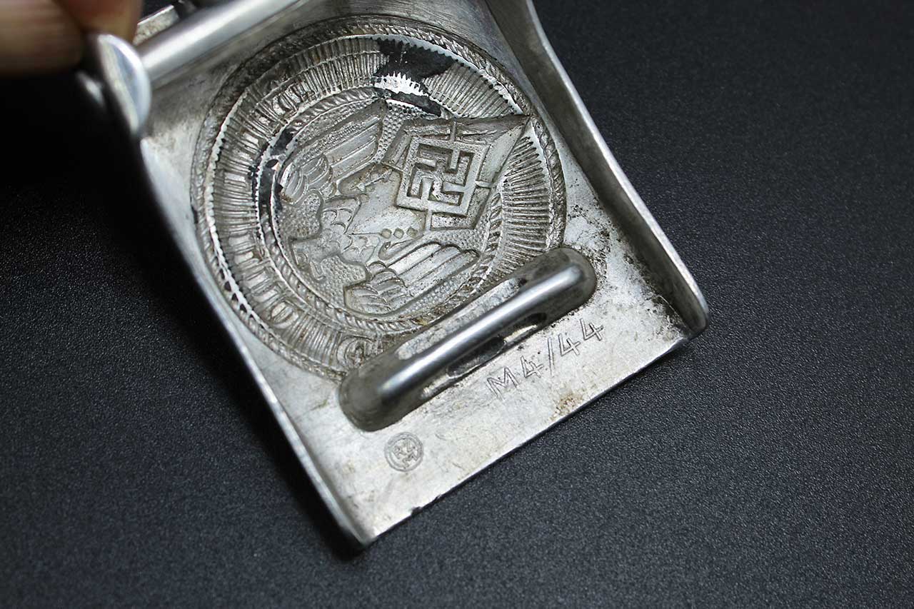 WW2 German HJ (Hitlerjugend) Buckle. Motto on front of buckle “Blut und Ehre” (Blood and Honor). Aluminum-alloy based buckle. Marker marked on back RZM M4/44 (for the marker of Paul Cramer & Co). Worn condition.