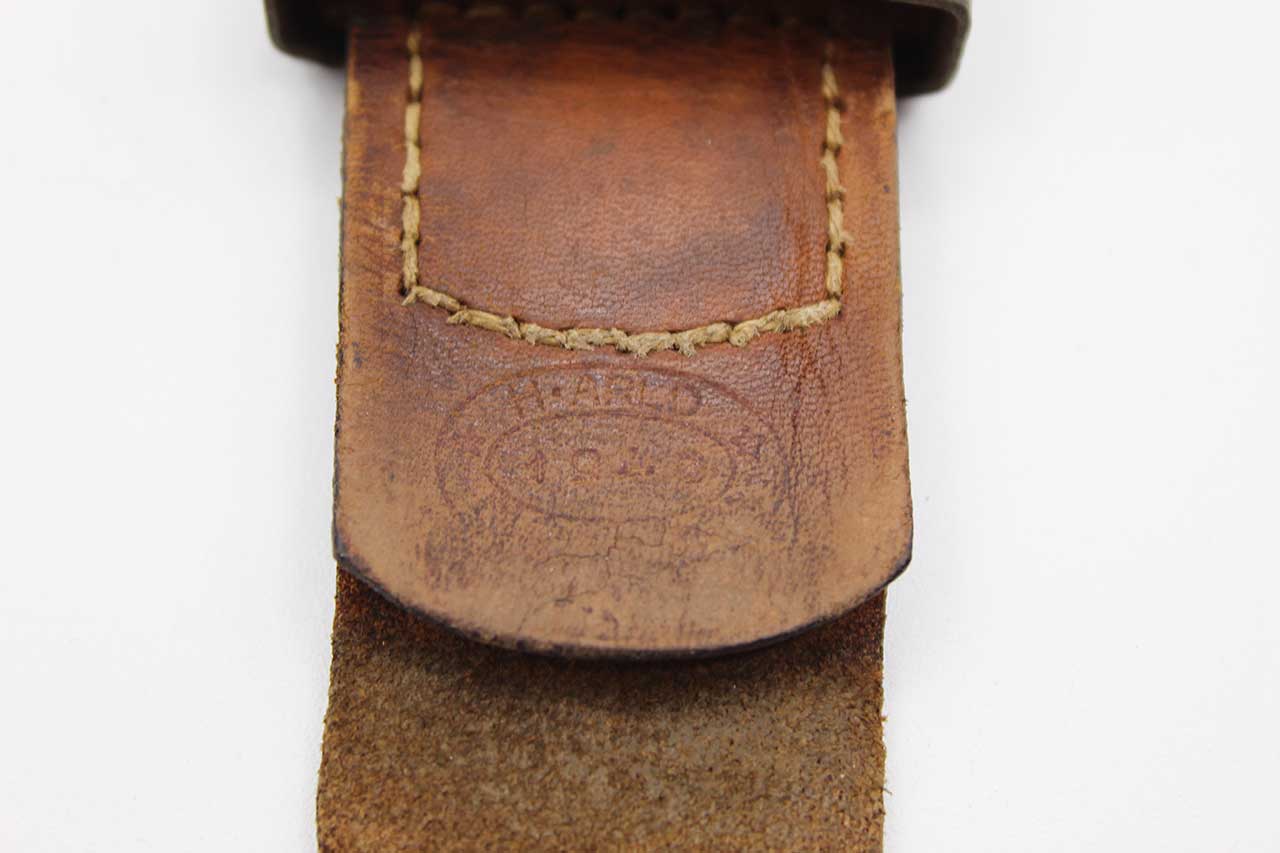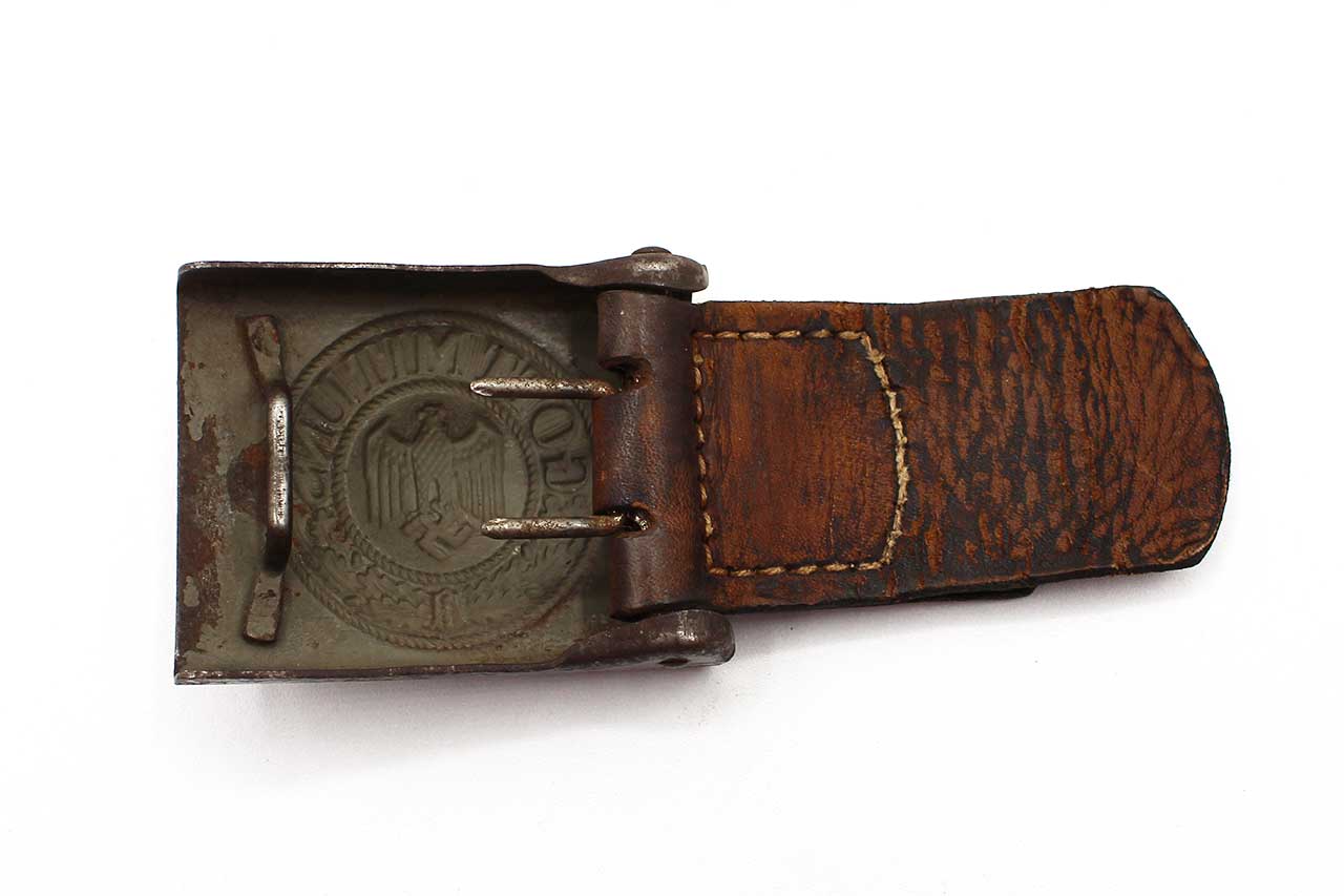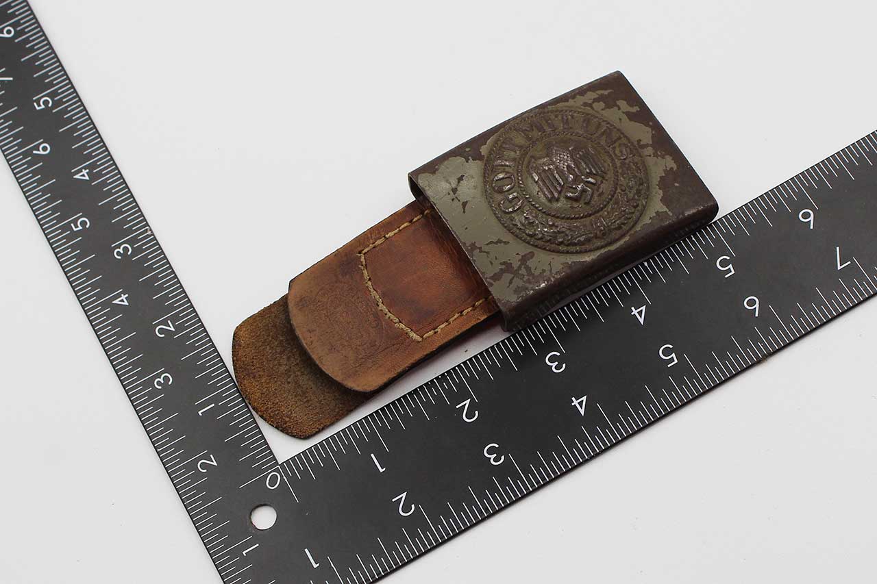 WW2 German Army EM/NCO Combat Buckle with tab. The leather tab is marker marked H. Arld Nuremberg and dated 1940. Steel based 1940 pattern combat buckle. Some of the field gray-green paint remaining on front of buckle. Worn condition.