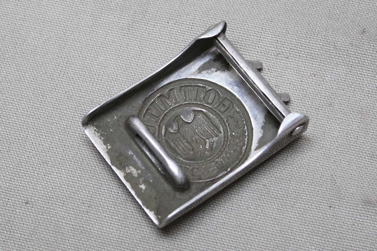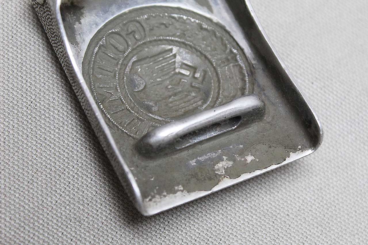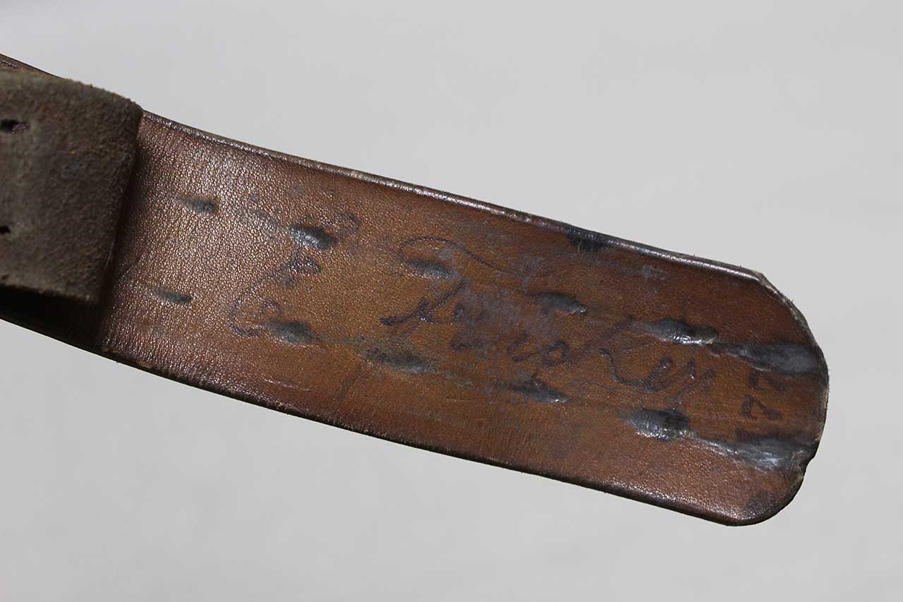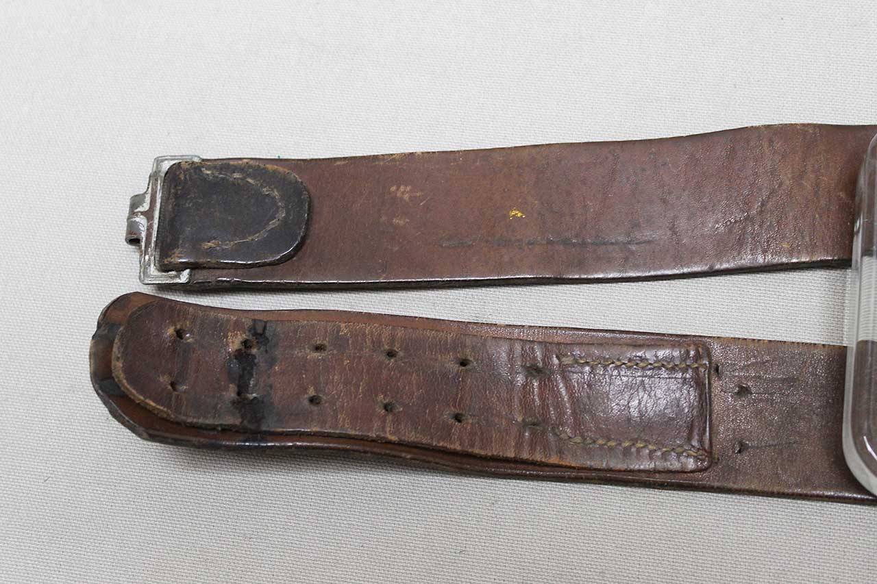 WW2 German Army EM/NCO Combat Belt and Buckle. Aluminum-alloy based army combat buckle. Belt appears to be named and size marked. Very worn condition.