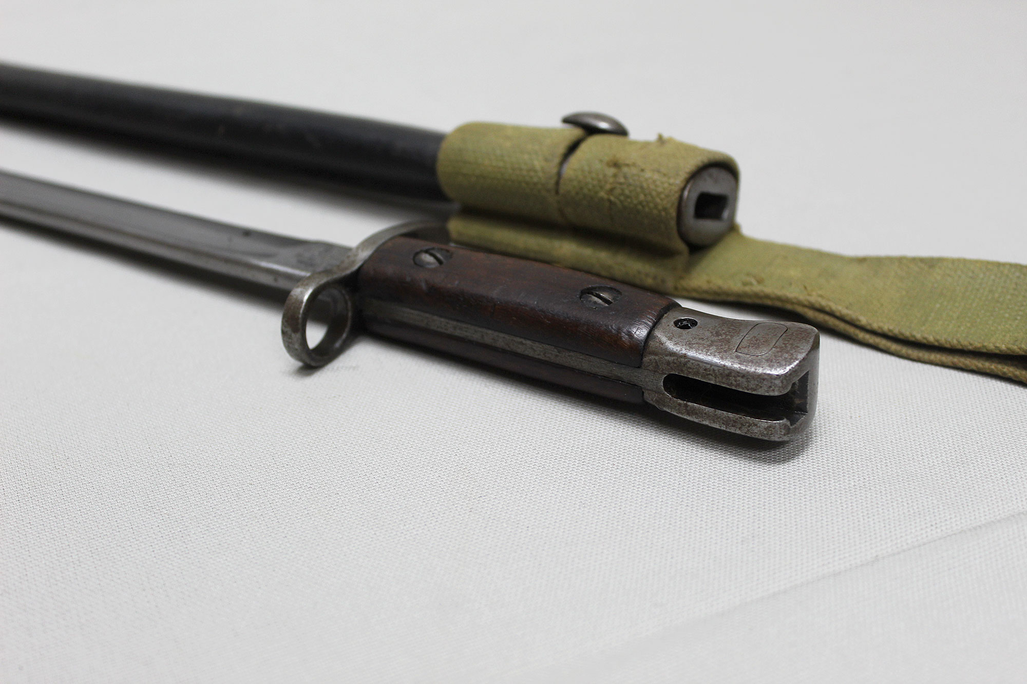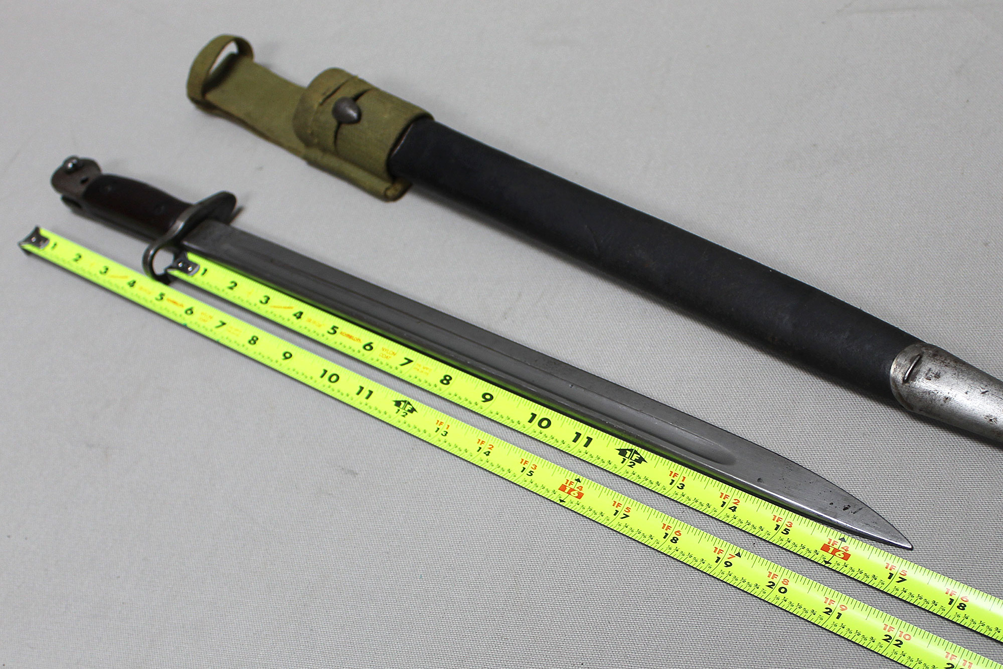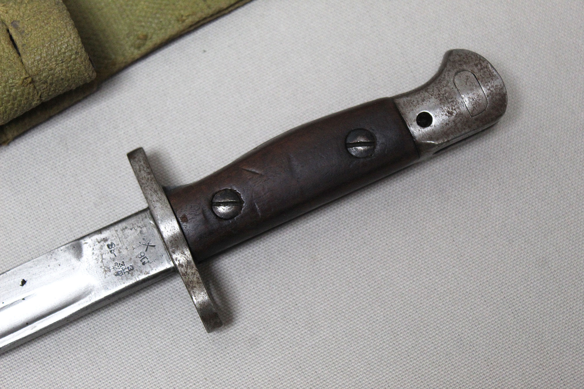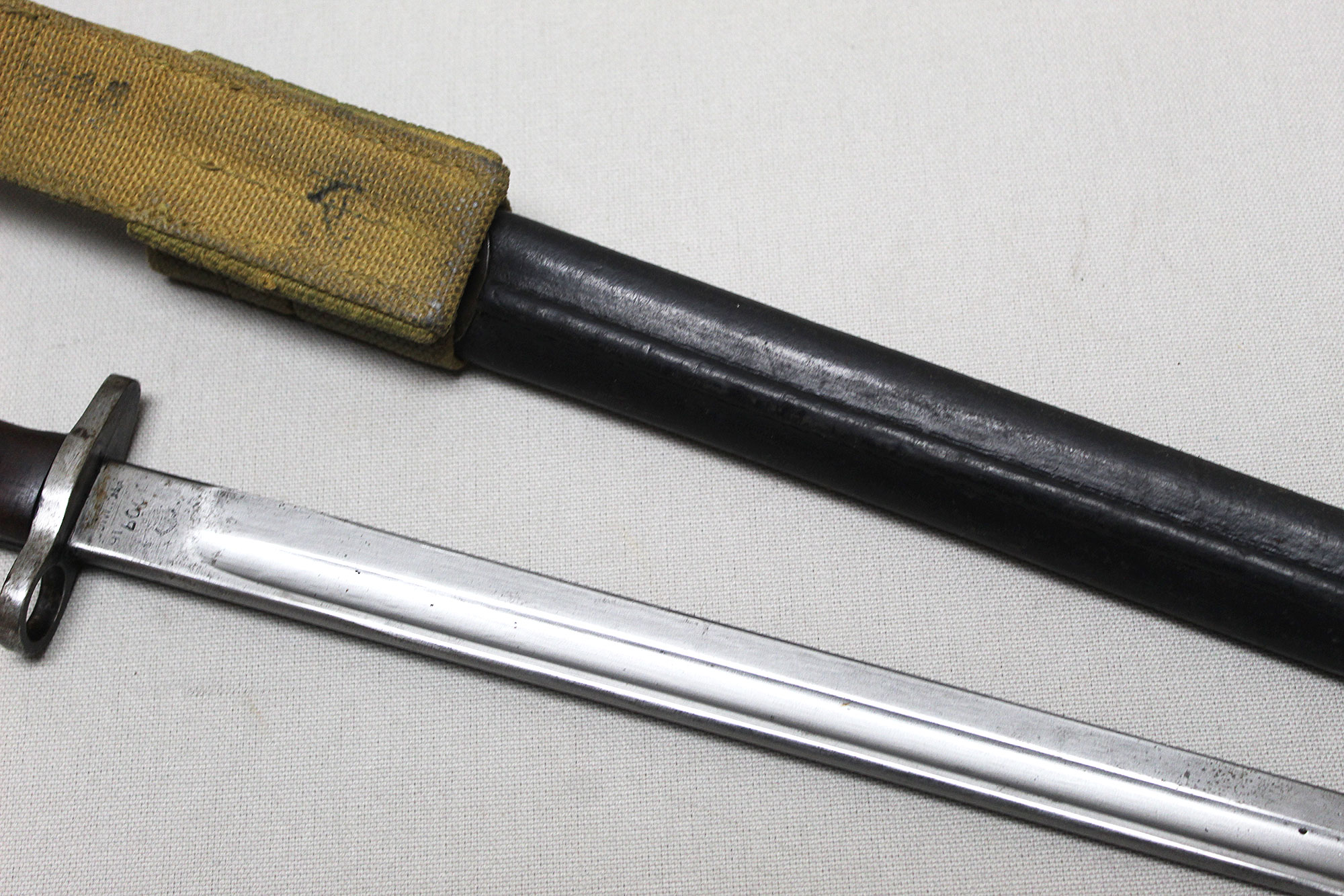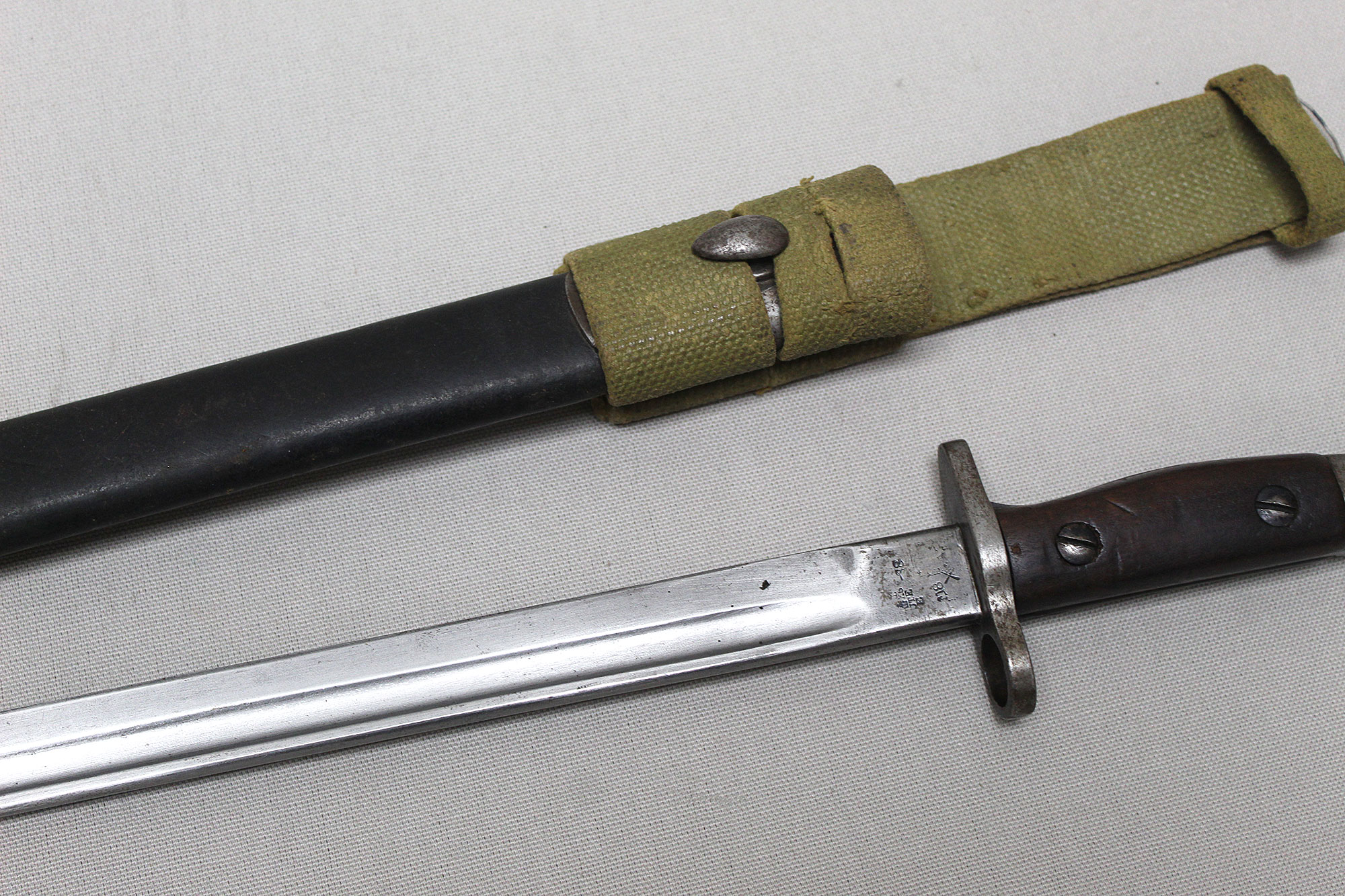 British 1907 Sanderson Bayonet with Web Frog. Overall, decent condition blade. Scabbard with a lot of wear, however, still ok. Marked on bottom scabbard fitting with R.E. mark. Stamped on one side of blade ricasso 1907 with large crown and several other markings. Also, has several other stampings on the other side of the blade ricasso including numbers, letters, small crown, and other symbols. The size of the blade is approximately 17 inches, overall length about 21 3/4 inches, and about 22 3/4 inches in scabbard. Worn condition.