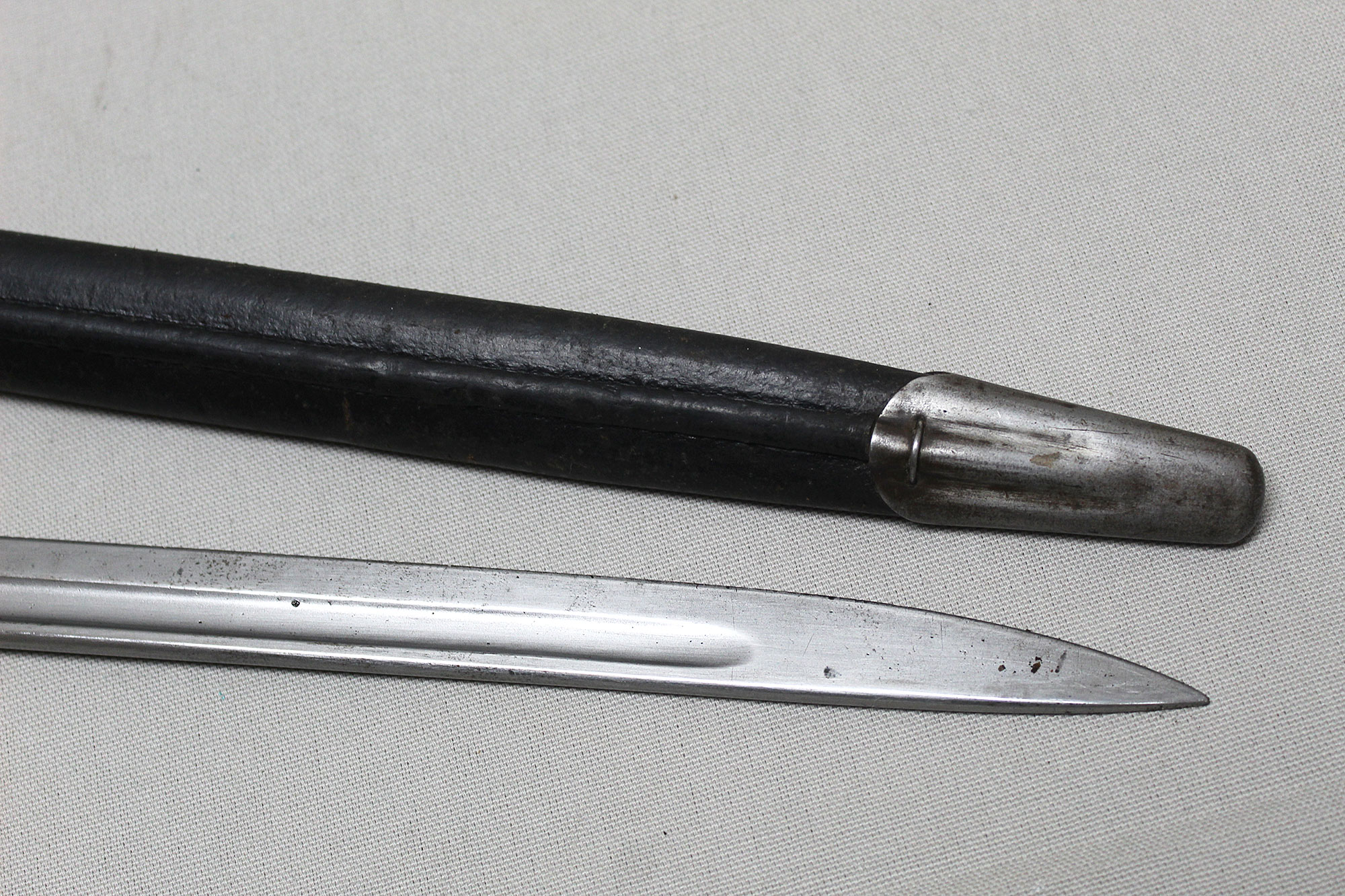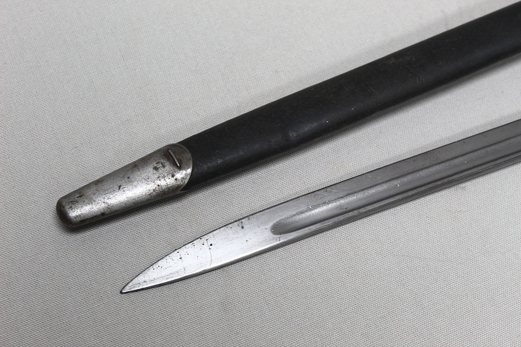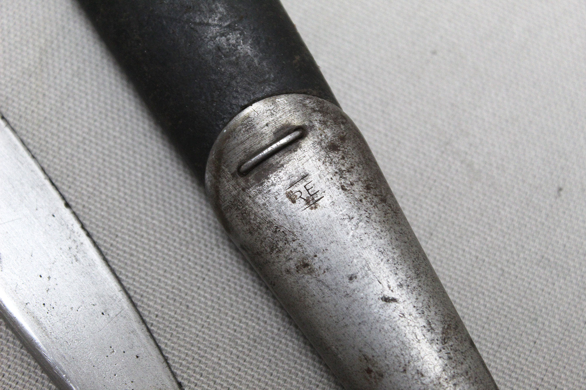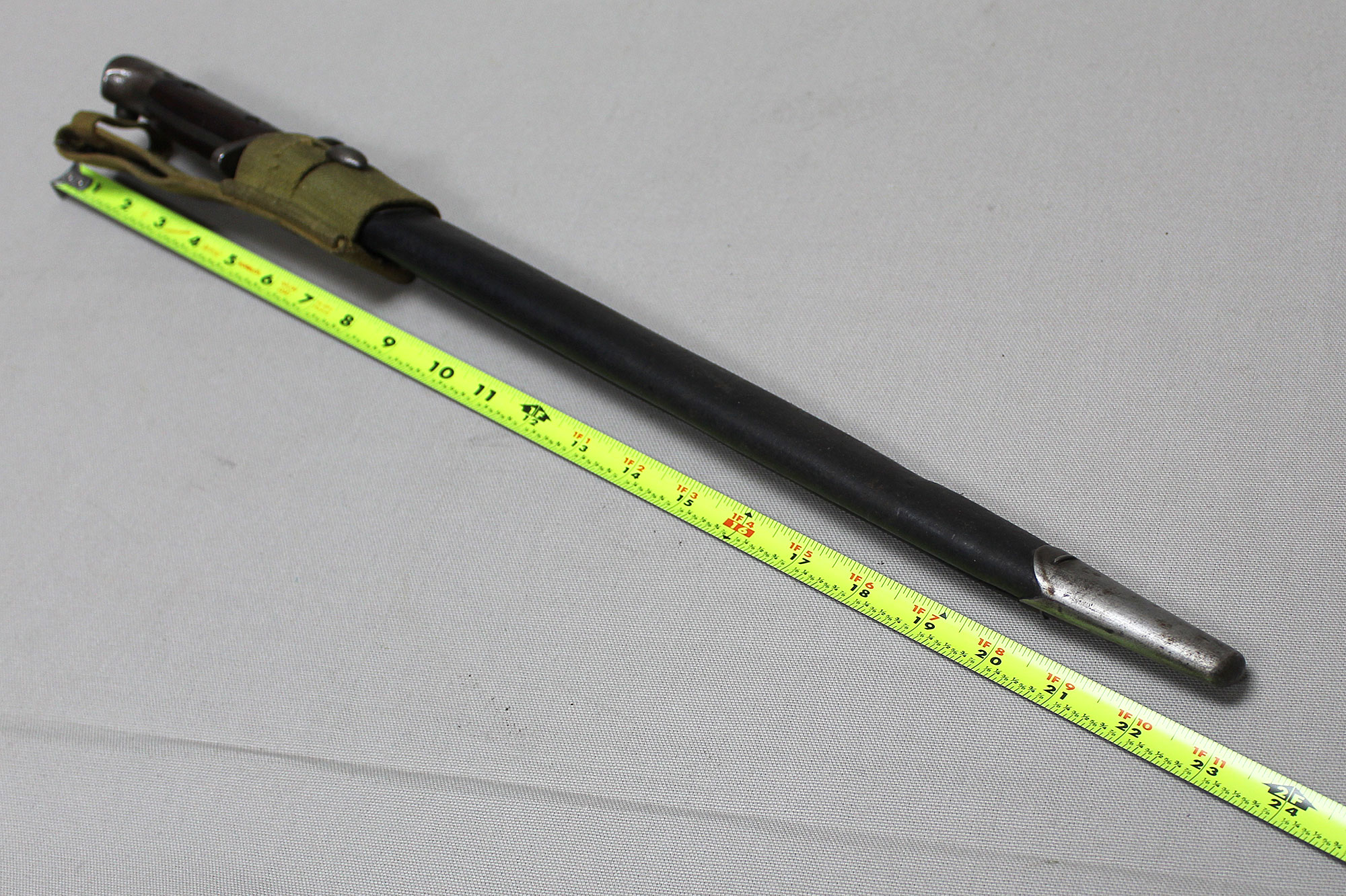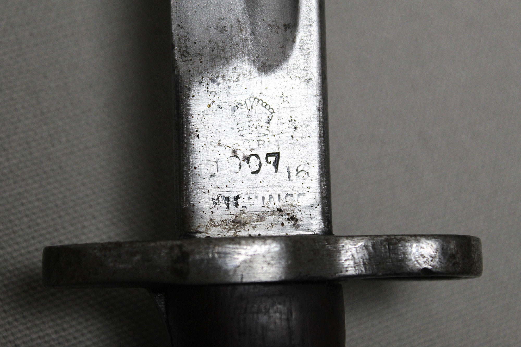 British 1907 Sanderson Bayonet with Web Frog. Overall, decent condition blade. Scabbard with a lot of wear, however, still ok. Marked on bottom scabbard fitting with R.E. mark. Stamped on one side of blade ricasso 1907 with large crown and several other markings. Also, has several other stampings on the other side of the blade ricasso including numbers, letters, small crown, and other symbols. The size of the blade is approximately 17 inches, overall length about 21 3/4 inches, and about 22 3/4 inches in scabbard. Worn condition.