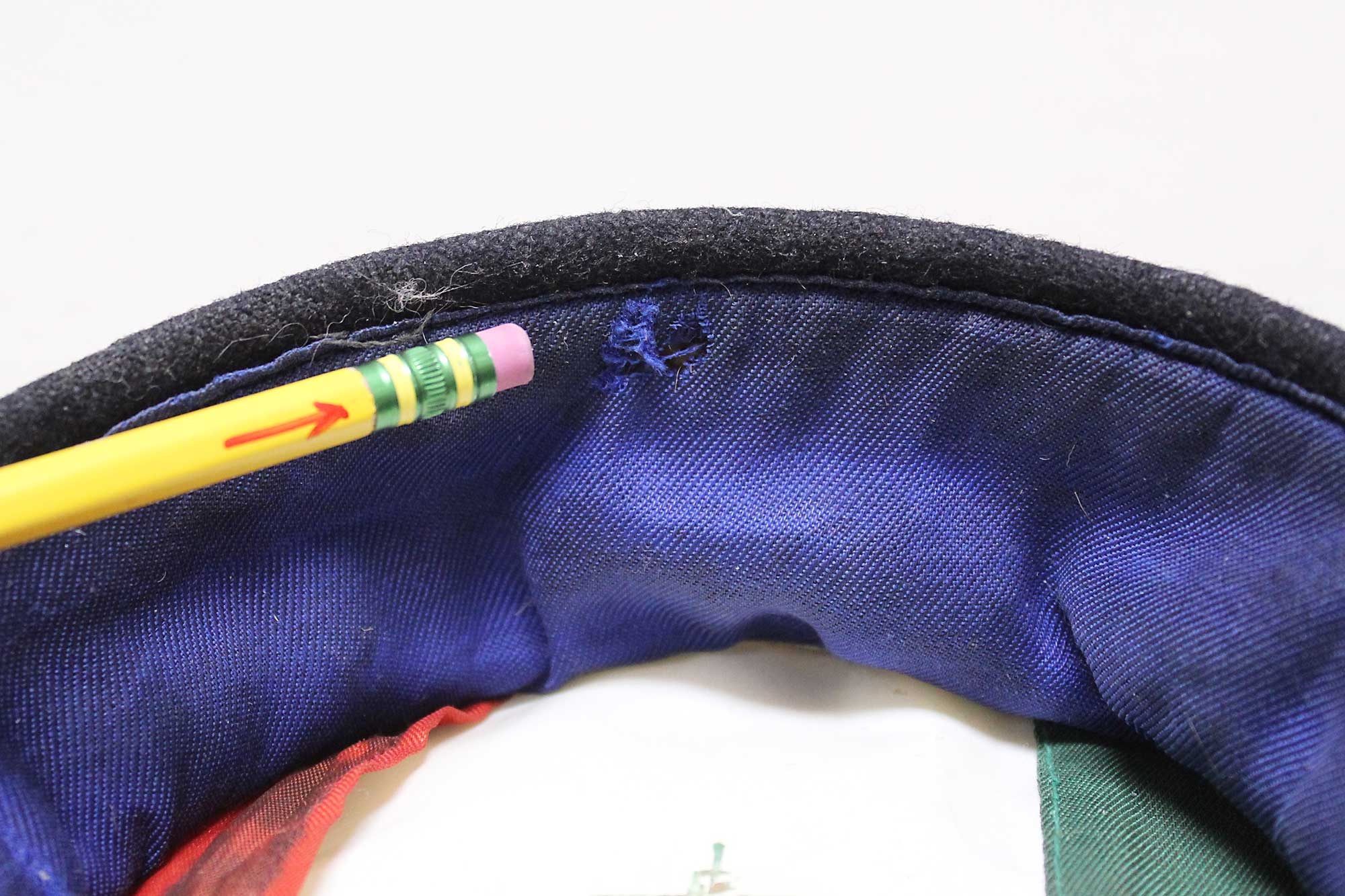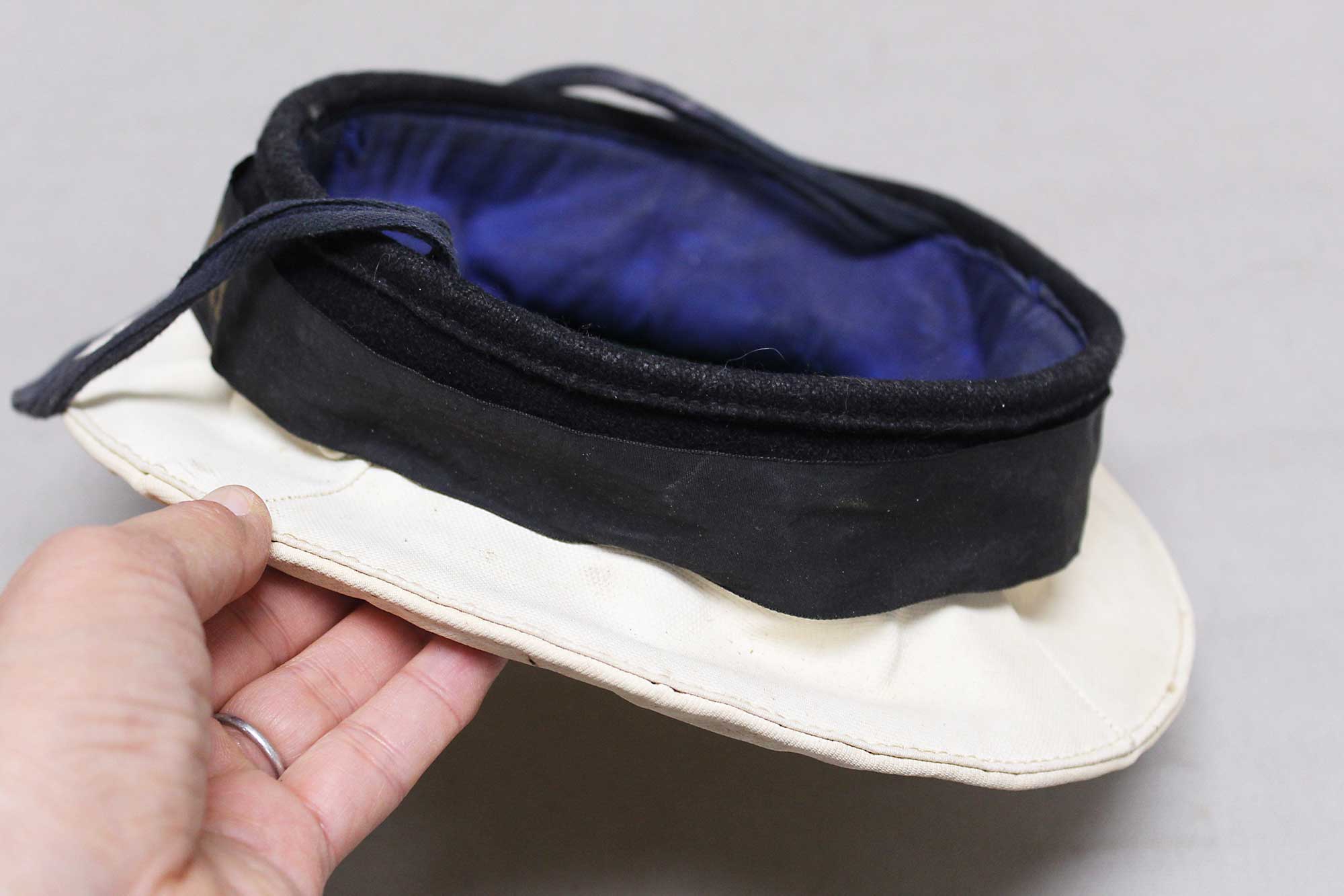 British Royal Navy “Pork Pie” Sailor Cap with HMS Leander cap tally. Marked inside of cap “Made in England” No size tags that I could find. Worn condition.