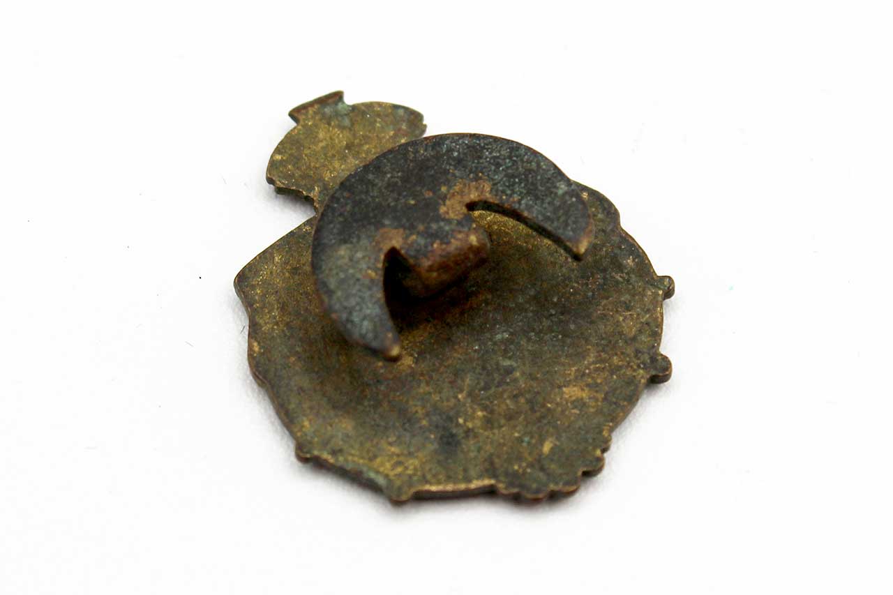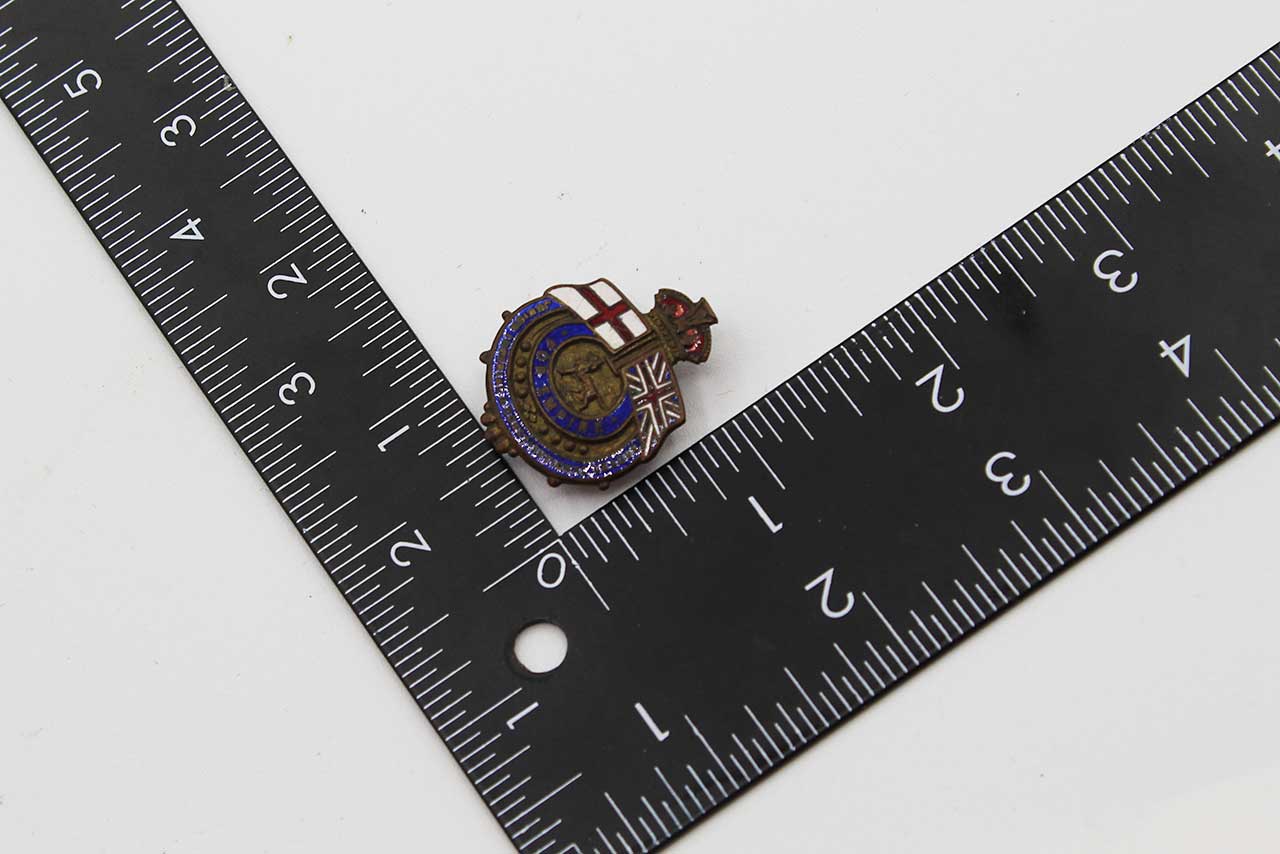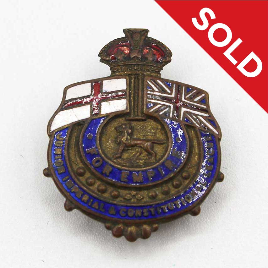 British small lapel pin. On top area has flag of St. George’s Cross and British Union Jack Flag. Wording on front of pin “For Empire” and “Junior Imperial Constitutional League”. Most likely 1930s-1940s era. Worn condition.