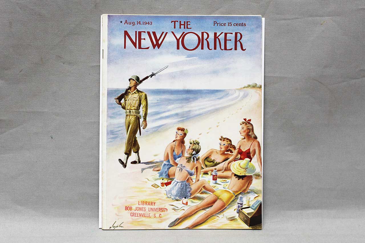 The New Yorker Magazine, August 14, 1943, complete issue in good shape. Constantin Alajalov illustrated the cover, which shows women sunbathing on the beach observing an MP with a rifle. The inner pages are crisp and clean, off-white, no writing, no creases, nothing missing, it’s tight to the staples; the cover shows slight wear at the crease. The back cover has a cut/crease. University Greenville SC red ink stamp on front cover. Worn and used condition.
