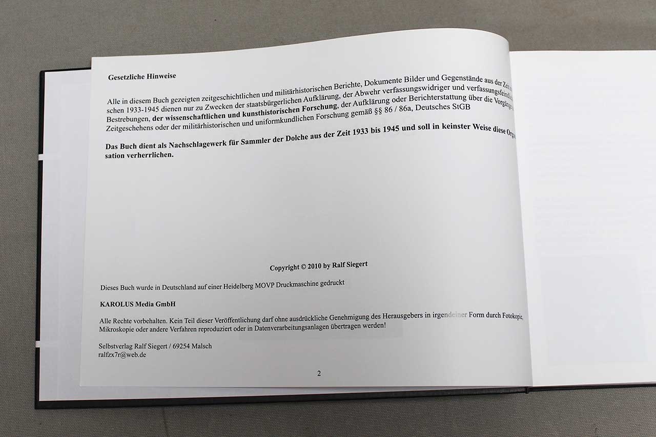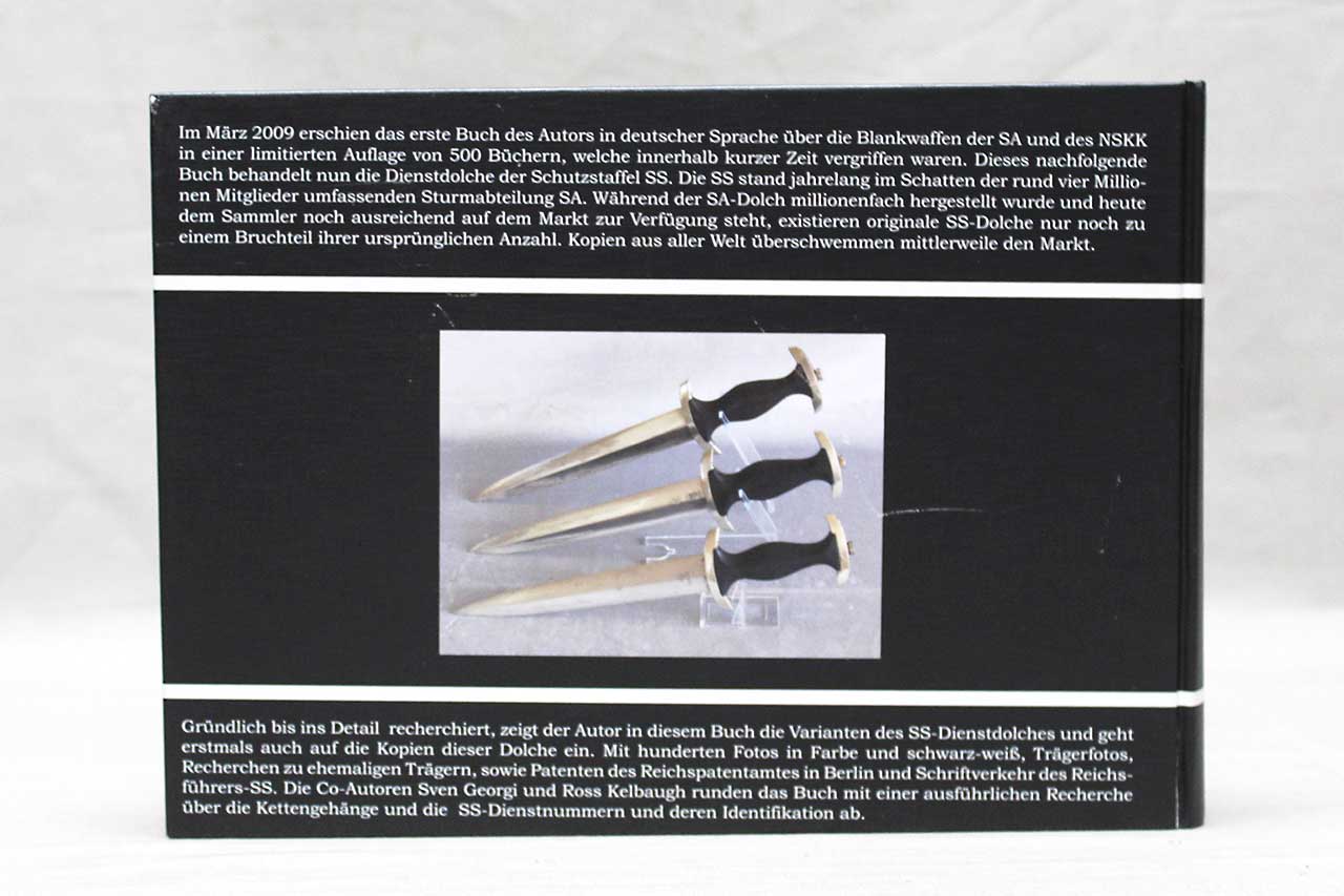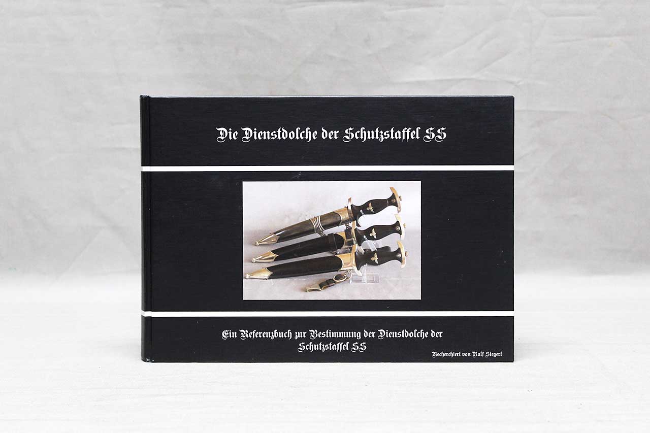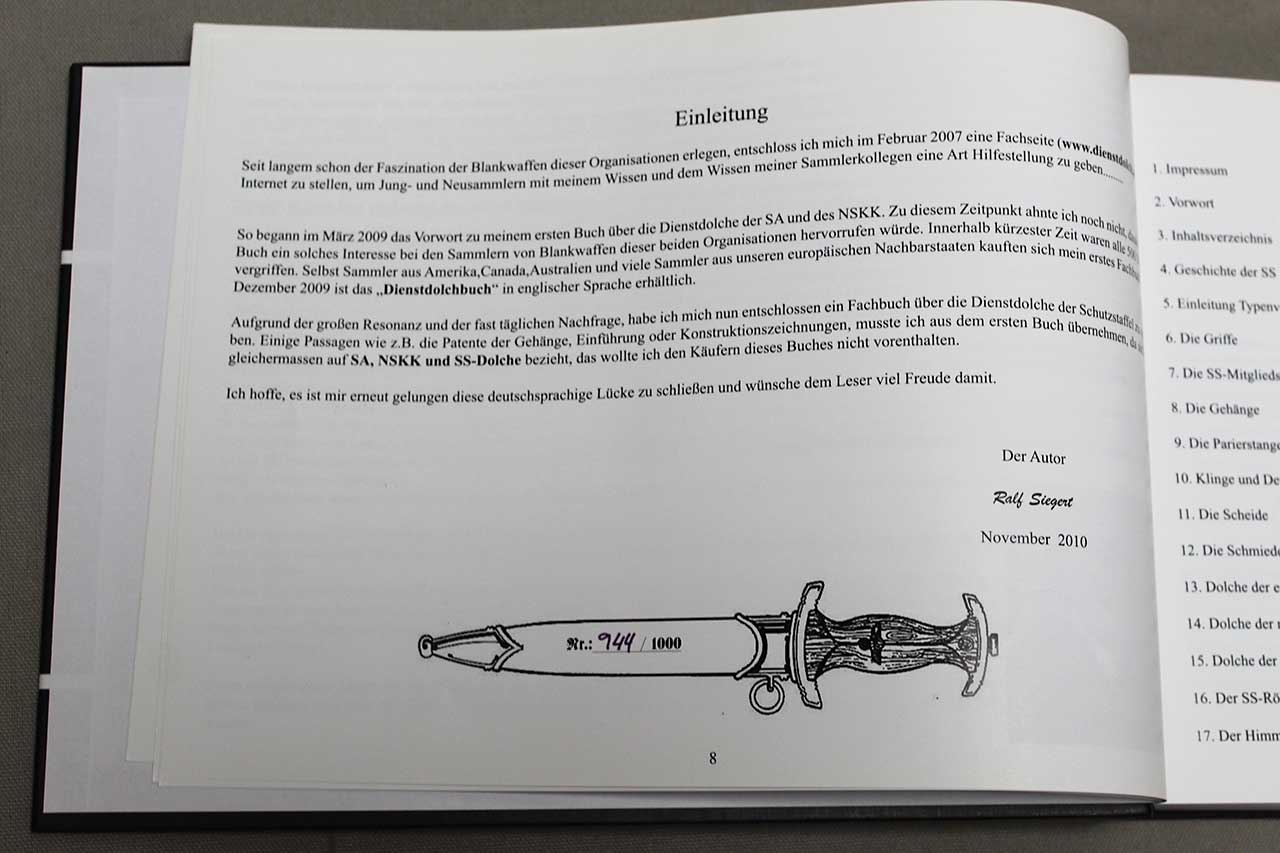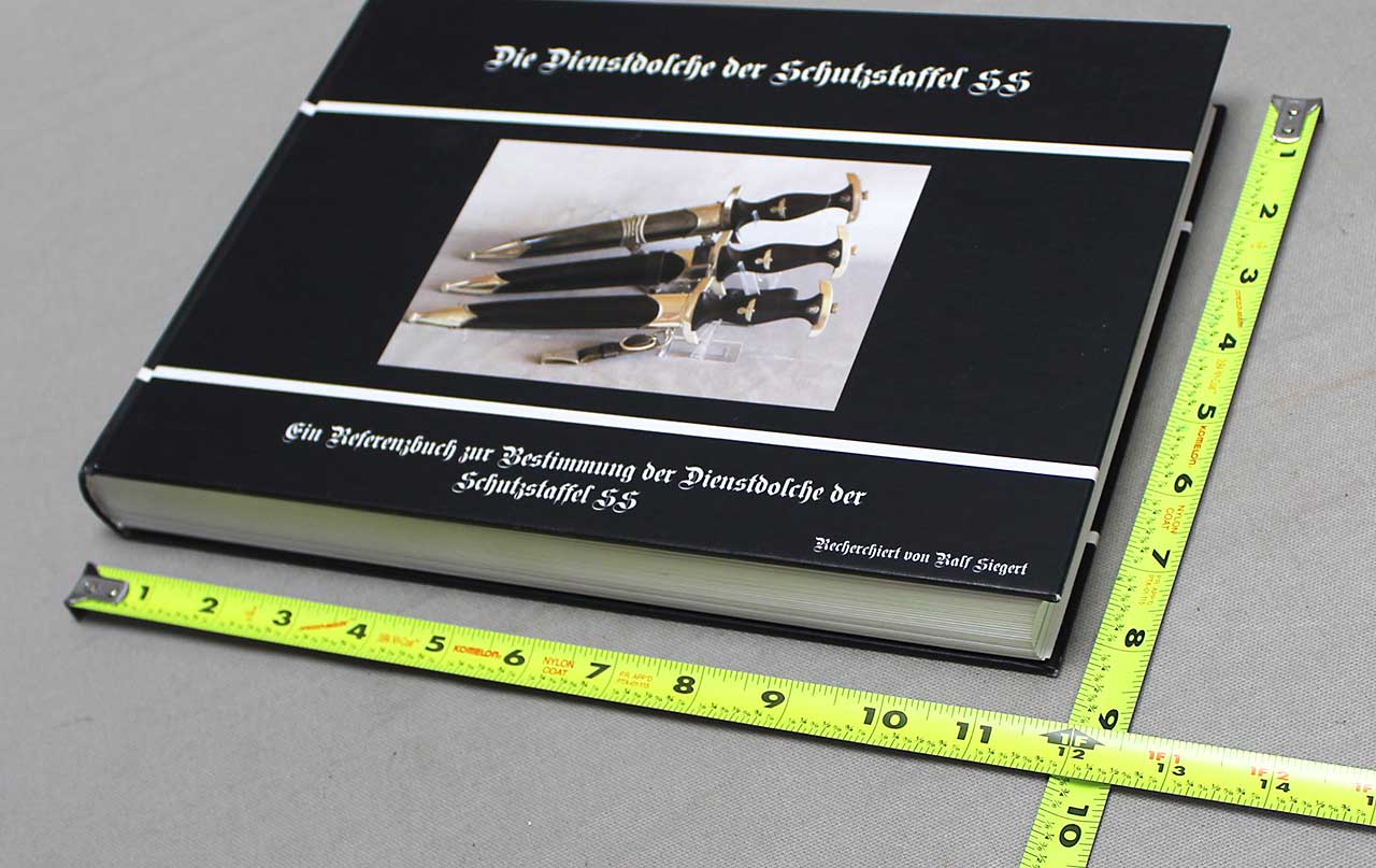 WW2 German SS Dagger Reference Book. German Language Edition. Limited Edition. Copyright 2010, numbered 944/1000. Size approximately 11 1/2 inches x 8 1/2 inches. The text in book is in German. Worn condition.