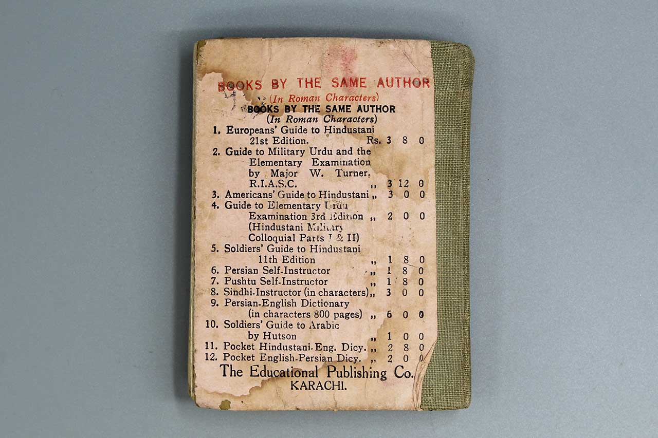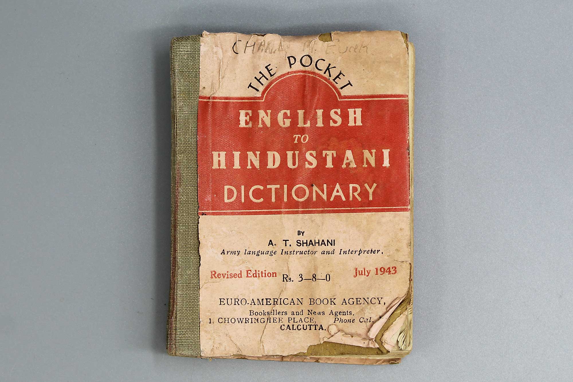 WW2 The Pocket English to Hindustani Dictionary. Revised Edition July 1943. Also, named on top front. Size approximately 5 inches x 3 inches. Heavily worn and water damaged condition.