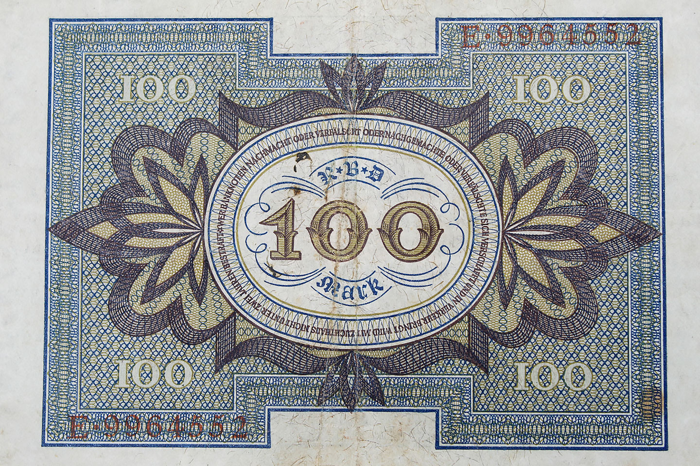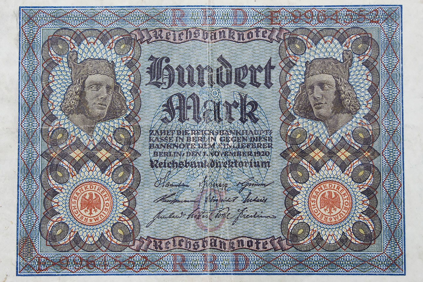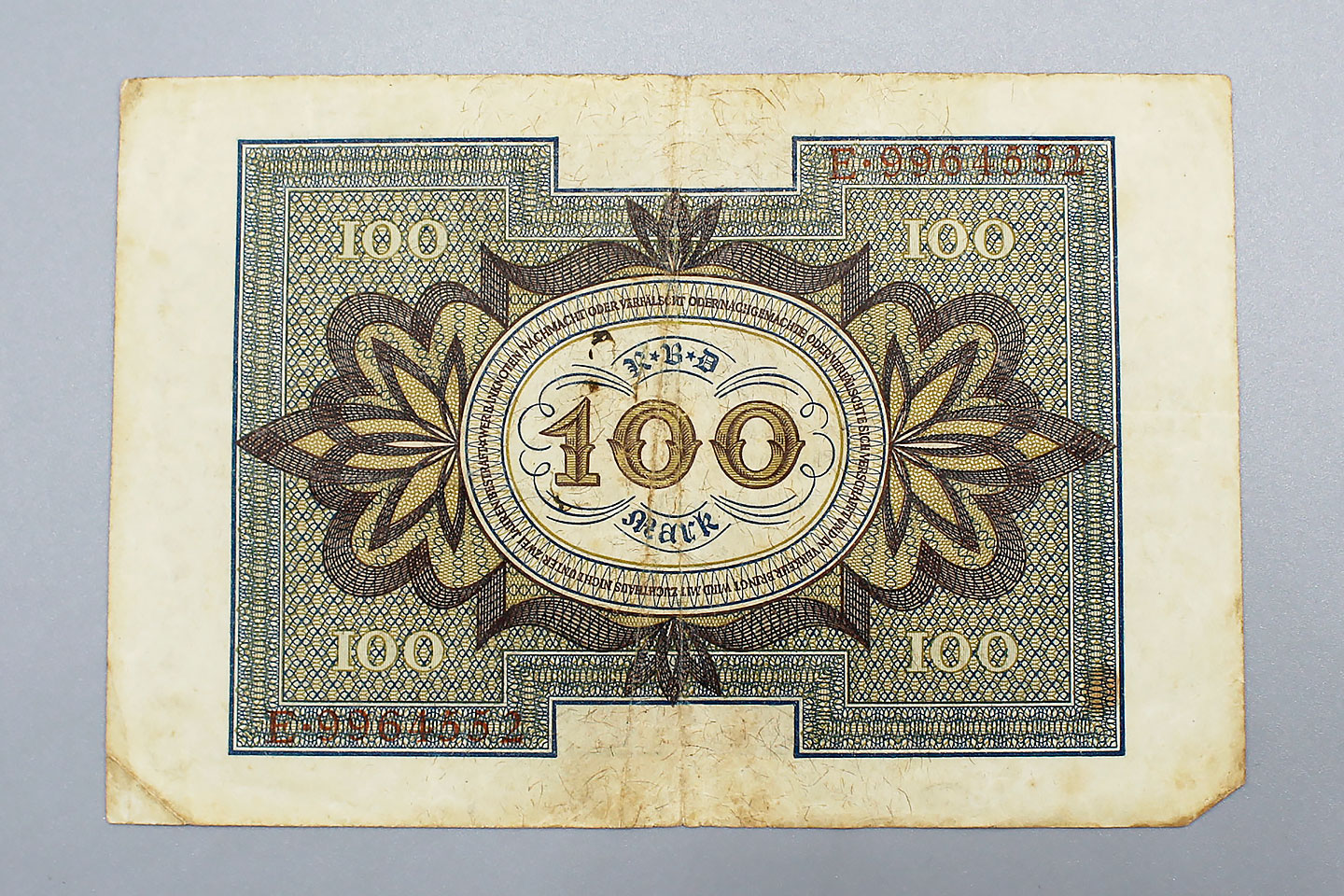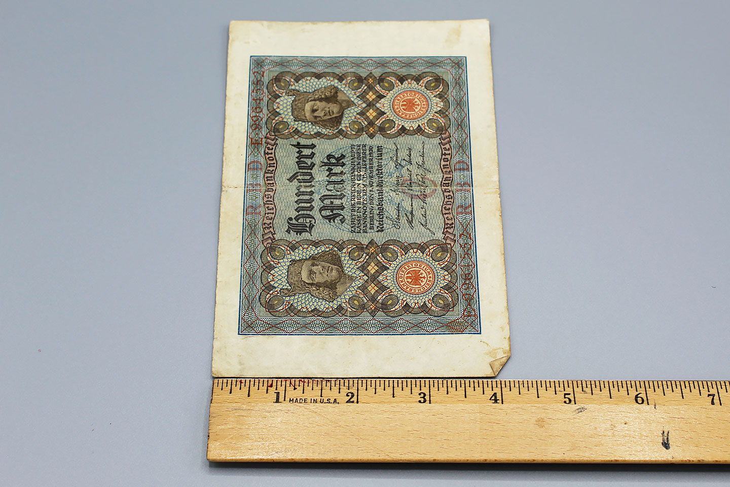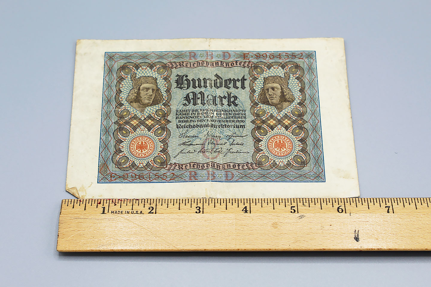 Imperial German 100 Reichsbanknote 1920. Size approximately 6 1/4 inches X 4 inches. Very worn and used condition.