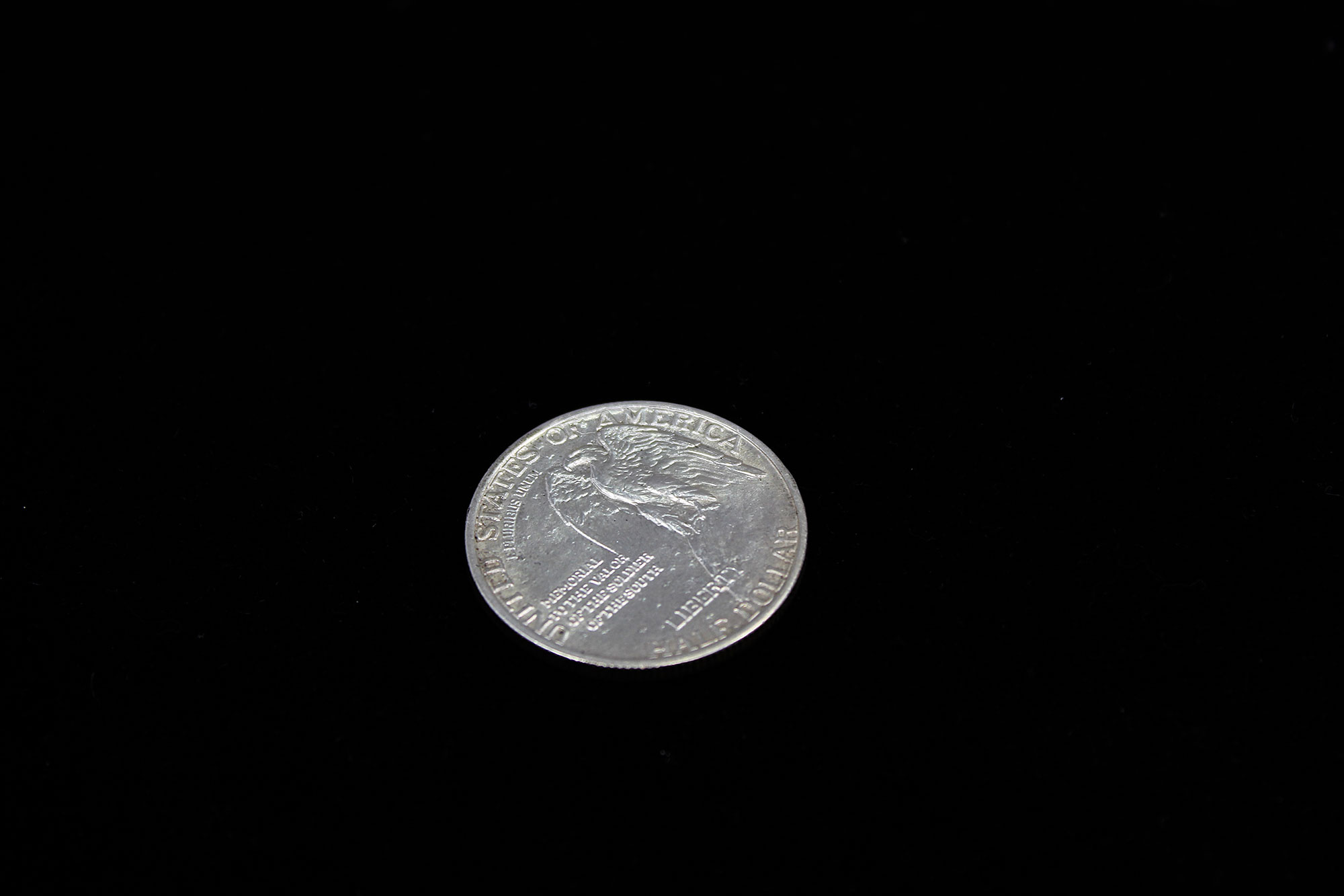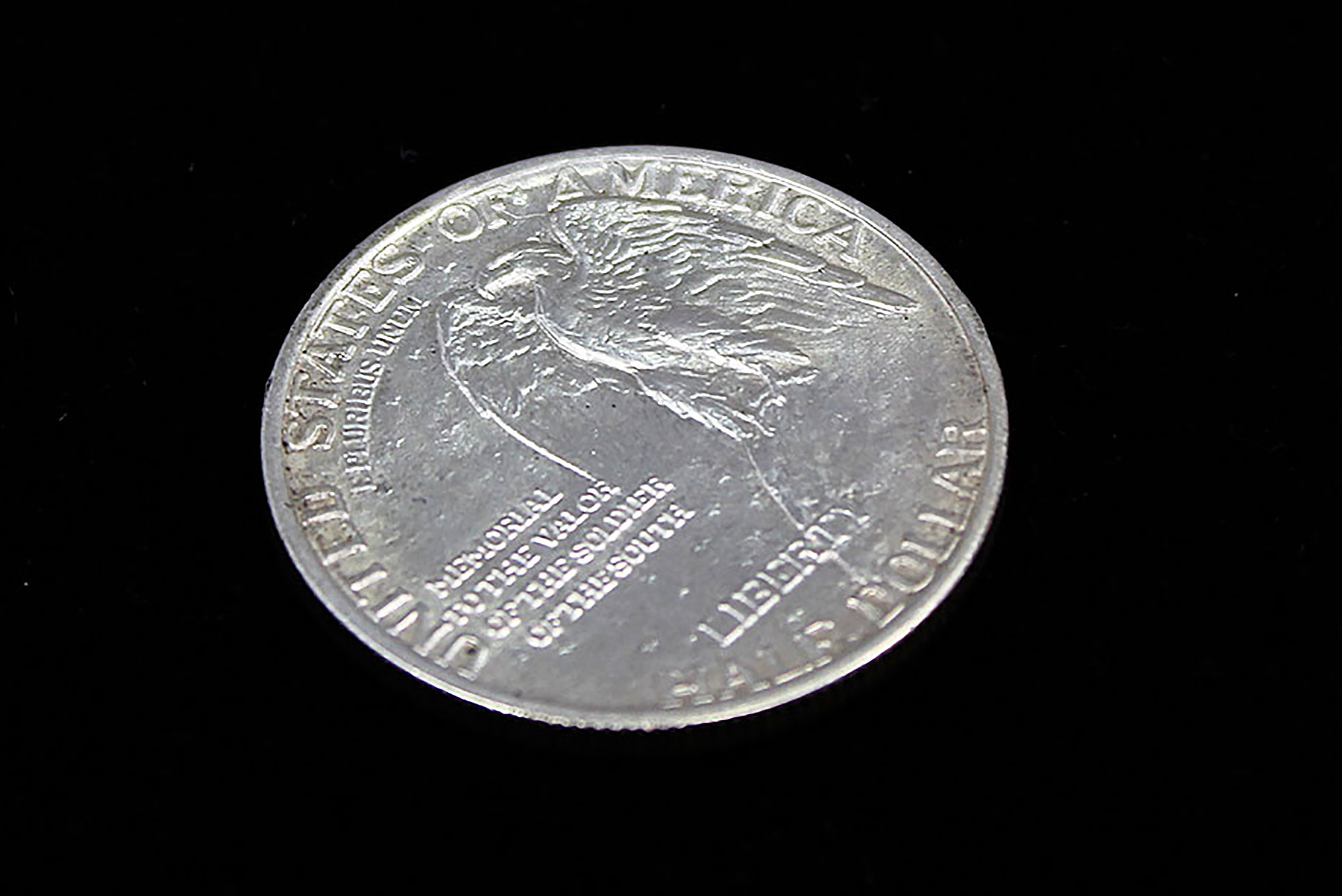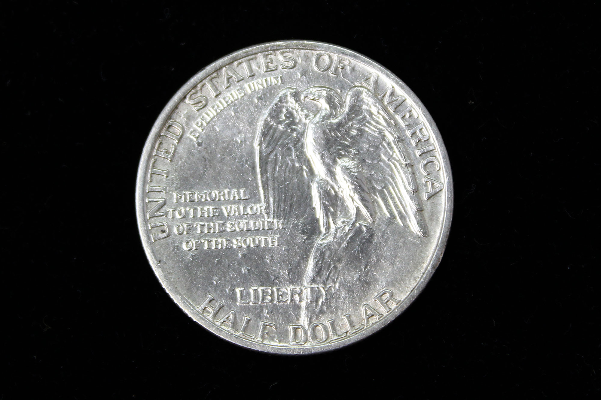 1925 Stone Mountain Half Dollar Commemorative Coin. The Stone Mountain Memorial half dollar was an American 50 cent piece struck in 1925 at the Philadelphia Mint. Its main purpose was to raise money on behalf of the Stone Mountain Confederate Monumental Association for the Stone Mountain Memorial near Atlanta, Georgia. Designed by sculptor Gutzon Borglum, the coin features a depiction of Confederate generals Robert E. Lee and Stonewall Jackson on the obverse and the caption “Memorial to the Valor of the Soldier of the South” on the reverse. Coin contains .900 silver.