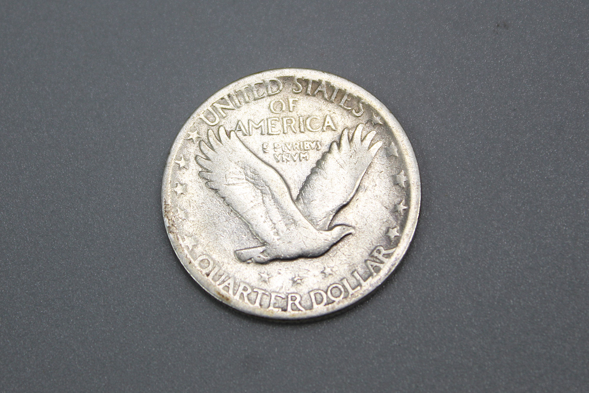 Additional Notes: The standing liberty quarter contains 0.17875 oz of Silver. Designed by Hermon MacNeil. The obverse depicts a militaristic Liberty walking through a gate and holding an olive branch and a shield. The reverse features an eagle in flight.