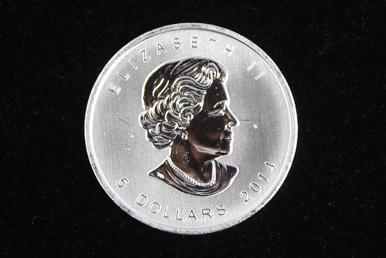 2014 Canadian Silver 5 Dollar Coin. Wildlife Series (Falcon). Canada 0.9999 Fine Silver 1 oz Argent Pur. The reverse of the coin shows the peregrine falcon. Sovereign coin backed by the Royal Canadian Mint.
