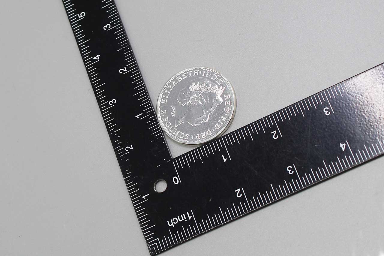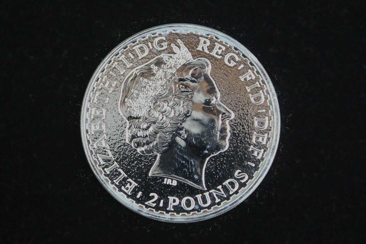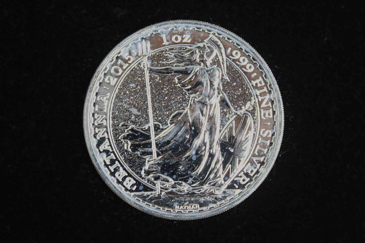 2015 Great Britian 1 oz Silver Britannia Coin. Produced by The Royal Mint, the Silver Britannia coin is UK legal tender and has a face value of 2 pounds. Contains 1 oz of silver. Worn condition.