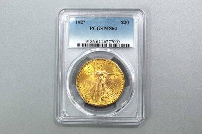 United States 1927 Saint-Gaudens Twenty Dollar ($20) Gold Double Eagle Coin PCGS MS64. Contains 0.9675 oz actual gold weight. Certified by PCGS (one of the top two coin grading services). PCGS encapsulation authenticates and protects the condition of the coin.