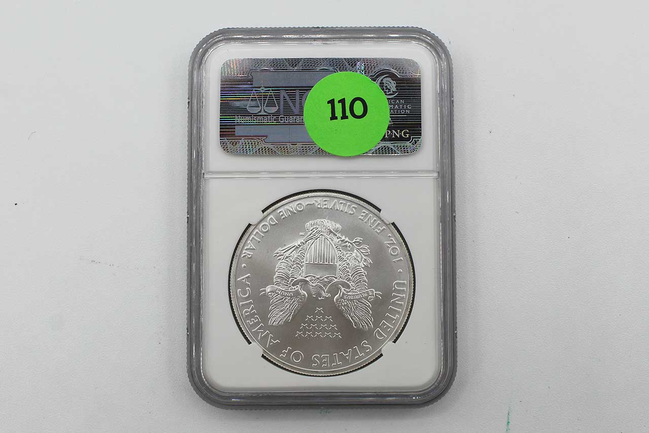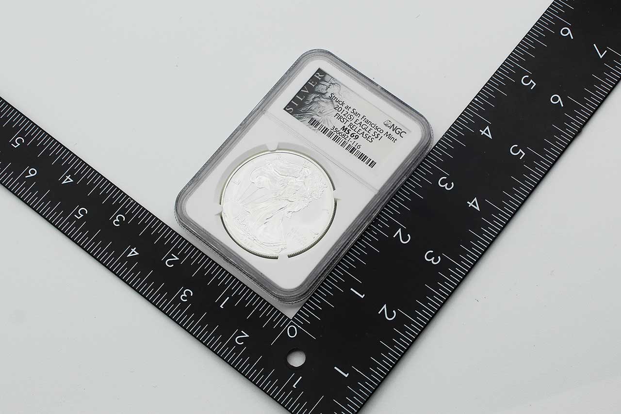 2012(S) American Silver Eagle One Dollar Coin NGC MS69. Silver Purity is 0.999, contains 1 troy oz of silver. Certified by NGC (one of the top two coin grading services). NGC encapsulation authenticates and protects the condition of the coin. Some wear to exterior plastic case.
