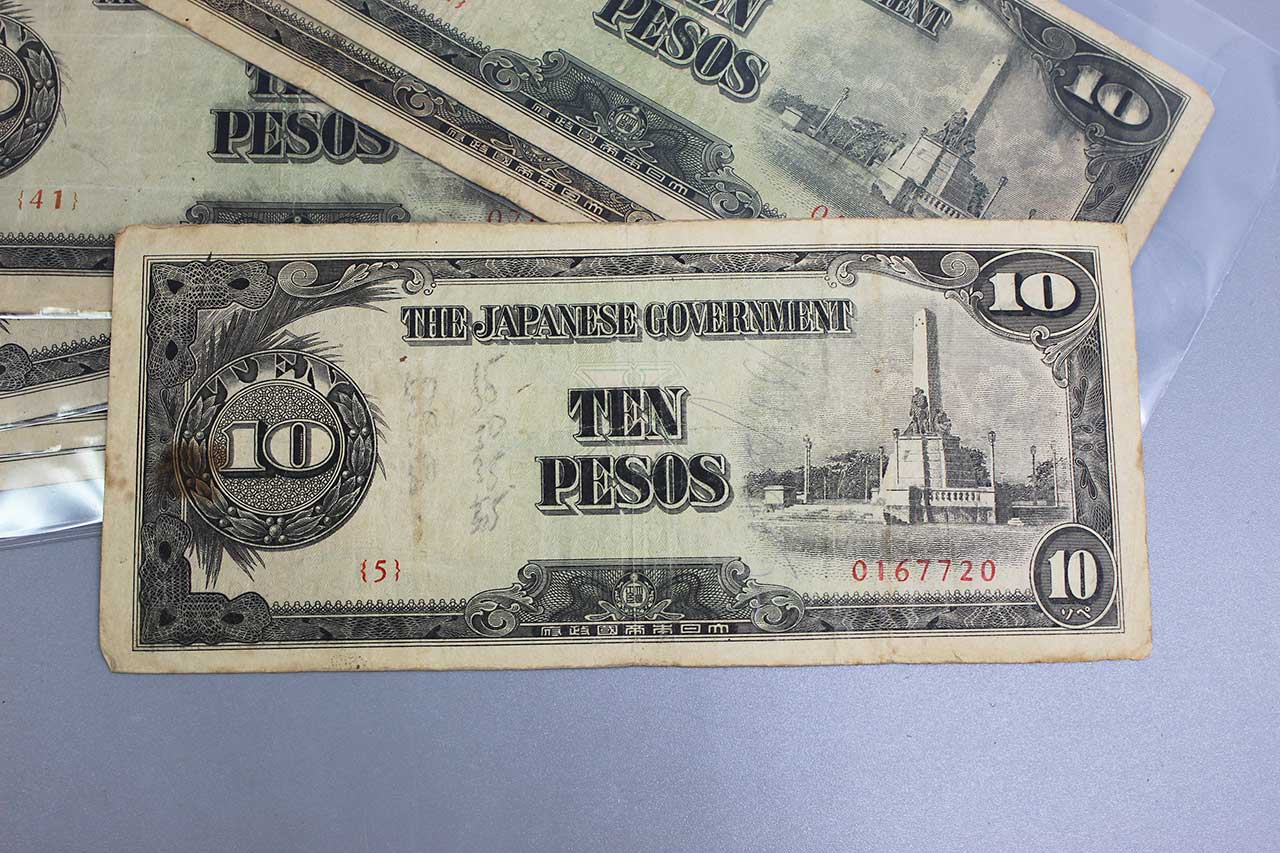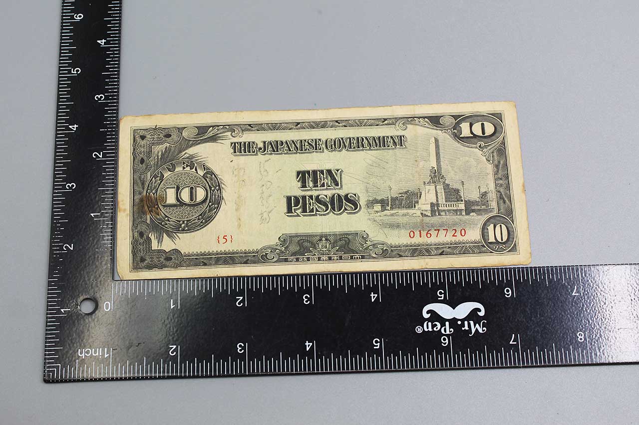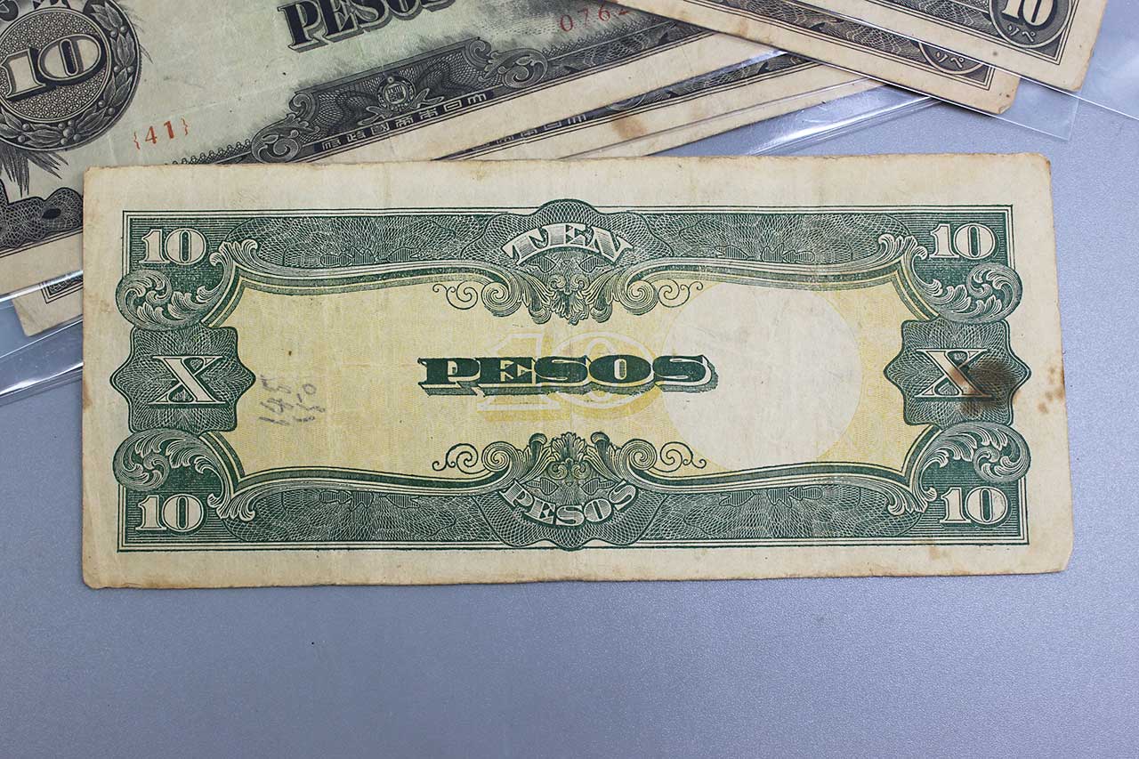 Japanese Government Currency or Japanese Invasion Money (JIM) 10 Pesos Currency. WW2 era. Price each. I have several of these as pictured. You will get one of the ones pictured or similar condition to ones pictured. 1940s (ww2) era. Worn and circulated condition. Price Each.