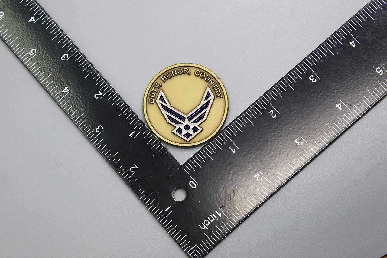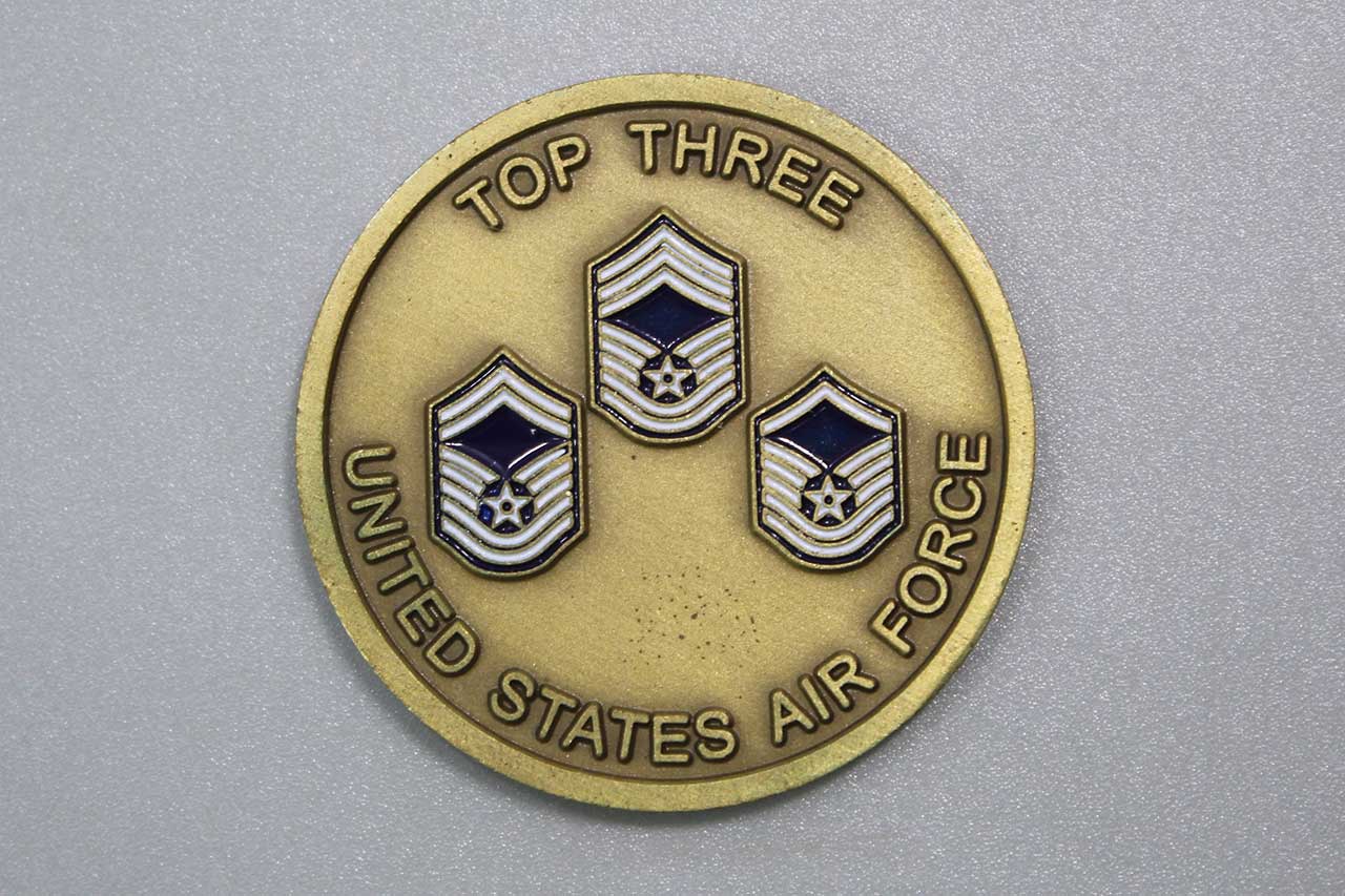 United States Air Force (USAF) Challenge Coin. Duty, Honor, Country. Top Three, United States Air Force. Size approximately 1 5/8 inches across. Worn condition.