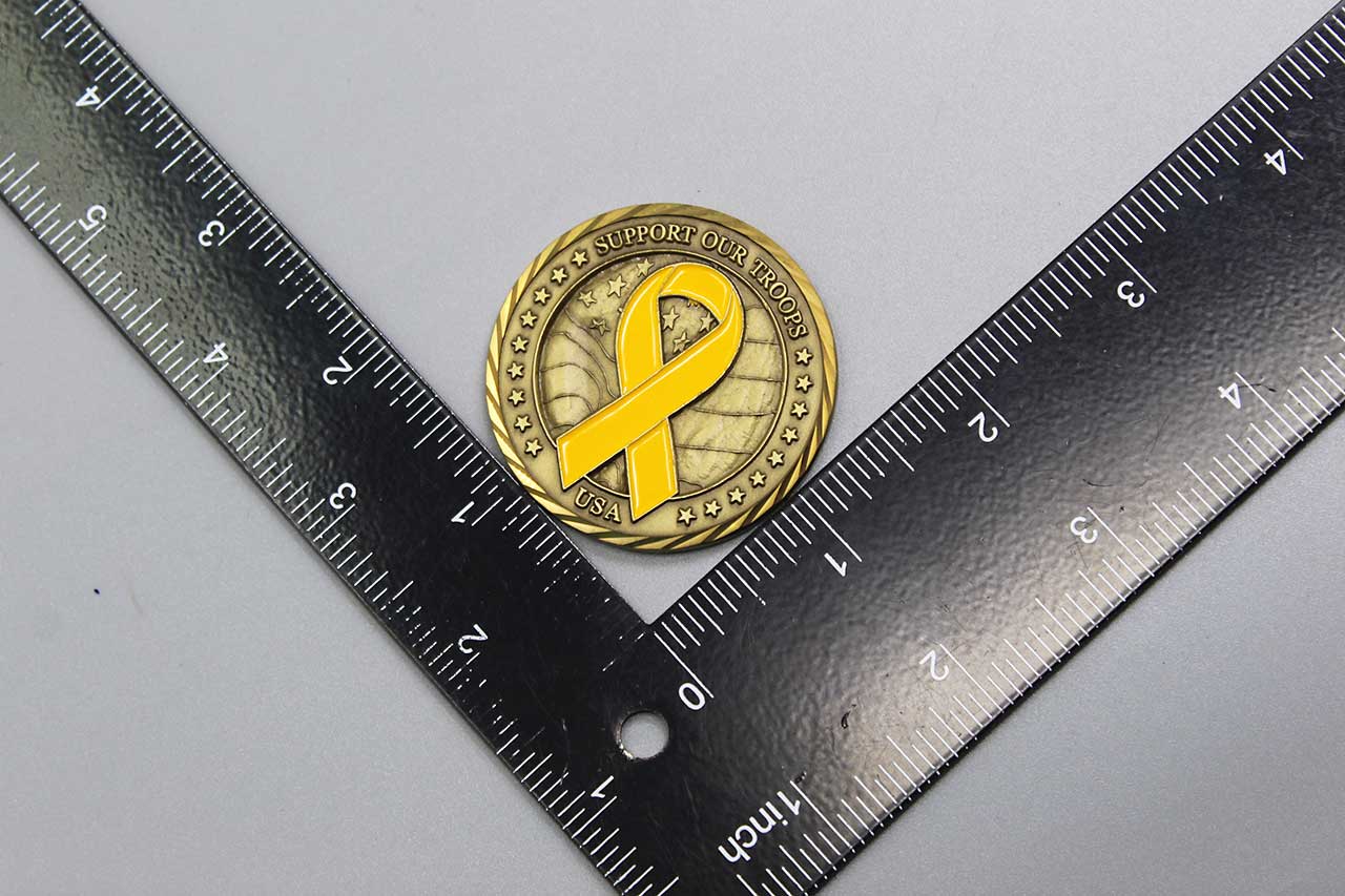 United States Challenge Coin. Yellow Ribbon. Support Our Troops USA. Size approximately 1 3/4 inches across. Worn condition.