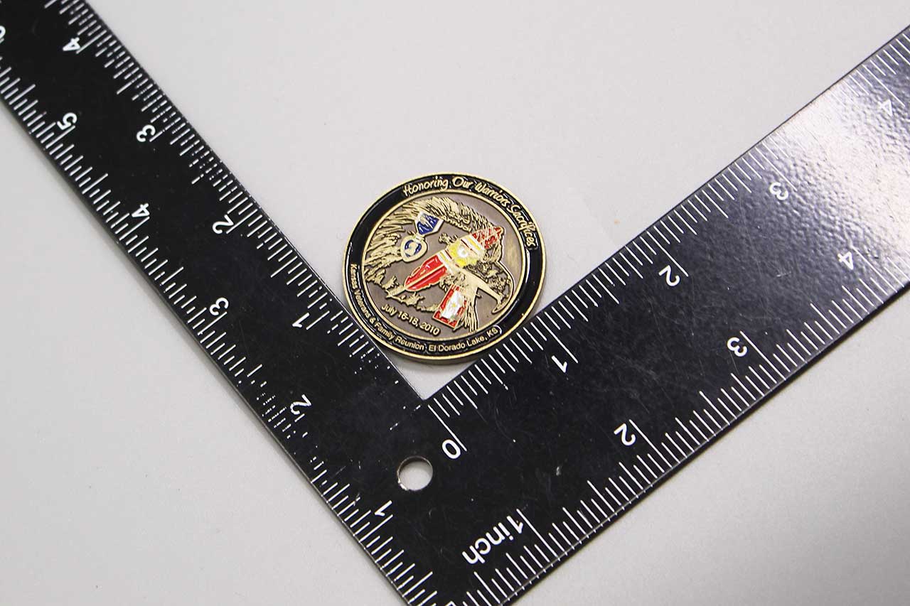 United States Challenge Coin. POW 23rd Annual Kansas Veterans & Family Reunion El Dorado Lake, KS July 16-18, 2010. Size approximately 1 1/2 inches across. Worn condition.