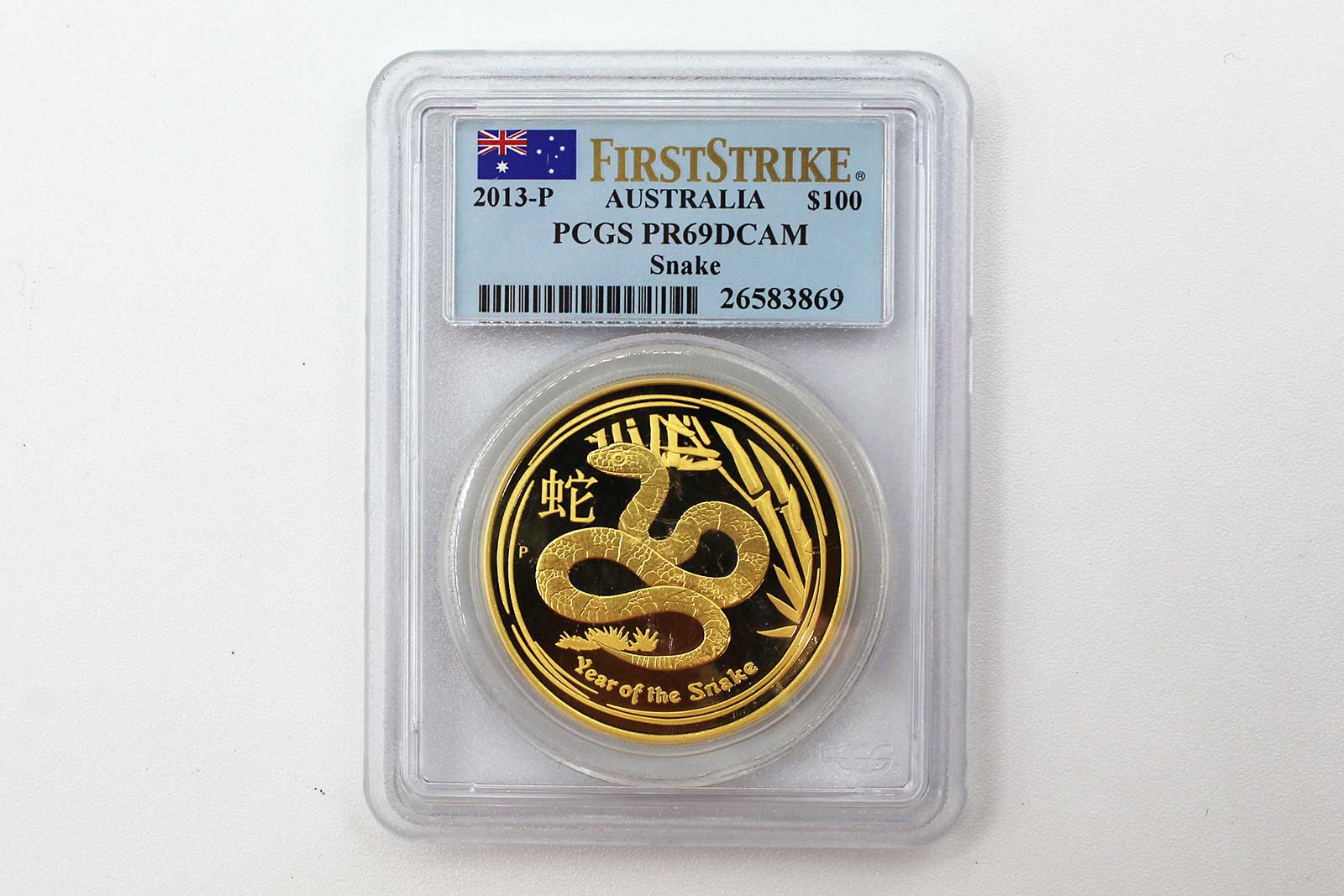 2013-P Australia 1oz Gold Year of the Snake PR69DCAM PCGS. First Strike. Lunar Series II. Certified by PCGS (one of the top two coin grading services). PCGS encapsulation authenticates and protects the condition of the coin.