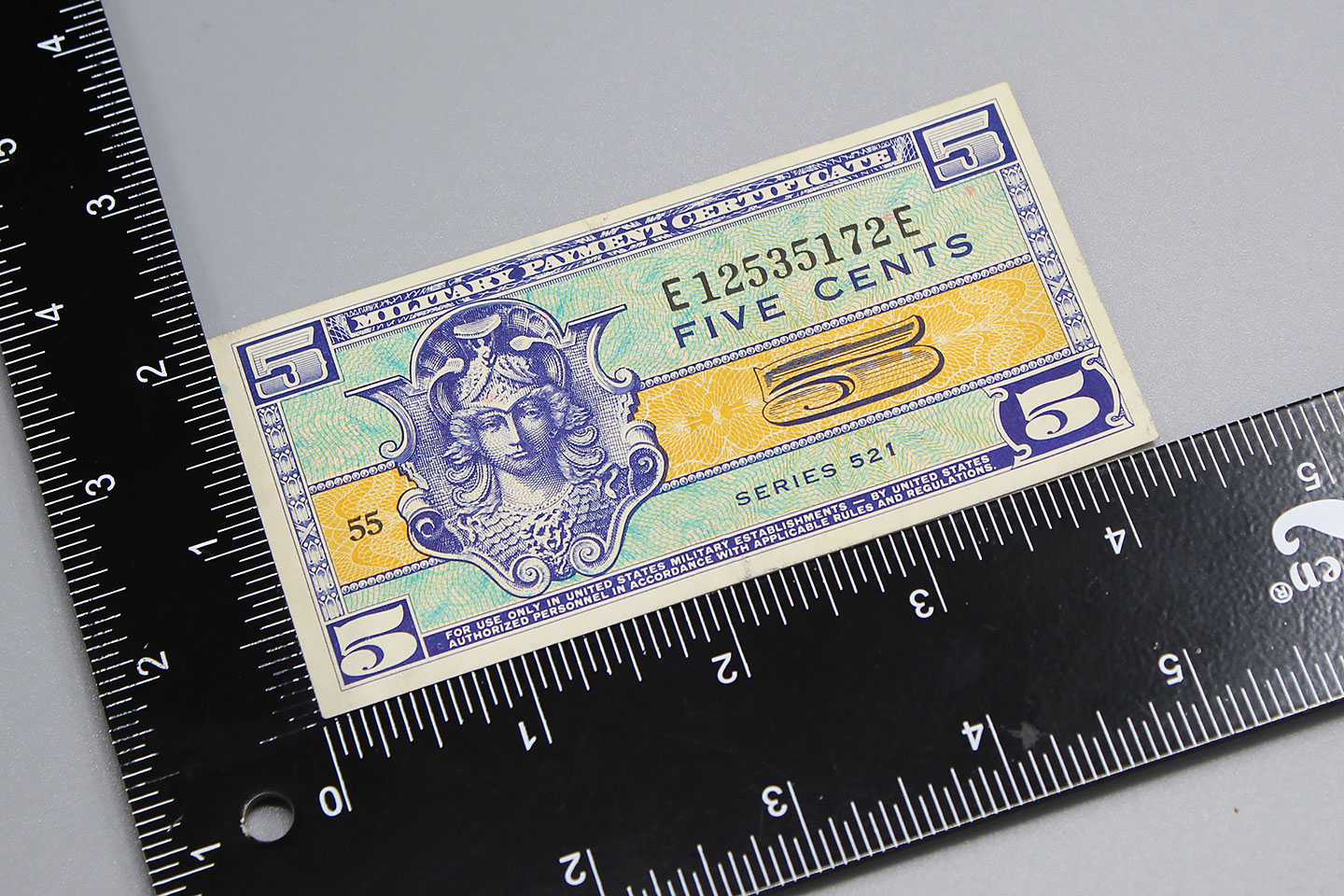 1954 Korea War 5 Cent Military Payment Certificate (MPC). Series 521. Size approximately 4 1/4 inches X 2 1/8 inches. Worn and circulated condition. Priced Each. I have several of these as pictured. Price Each. You will get one of the ones pictured or similar condition to ones pictured.