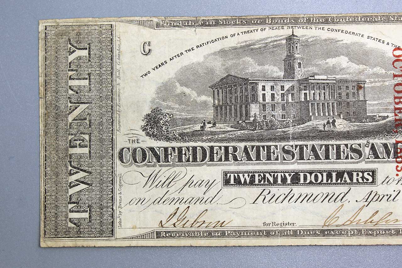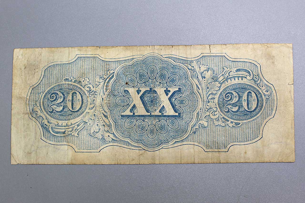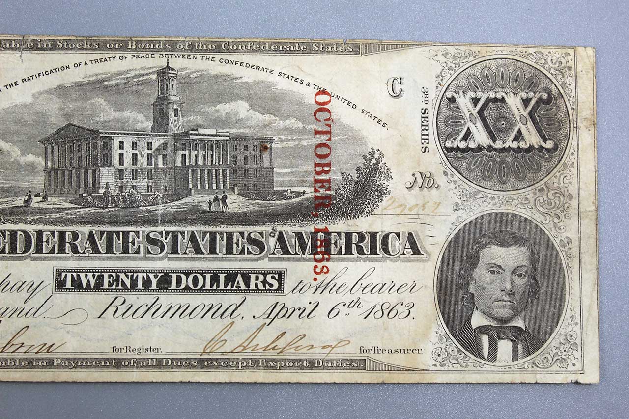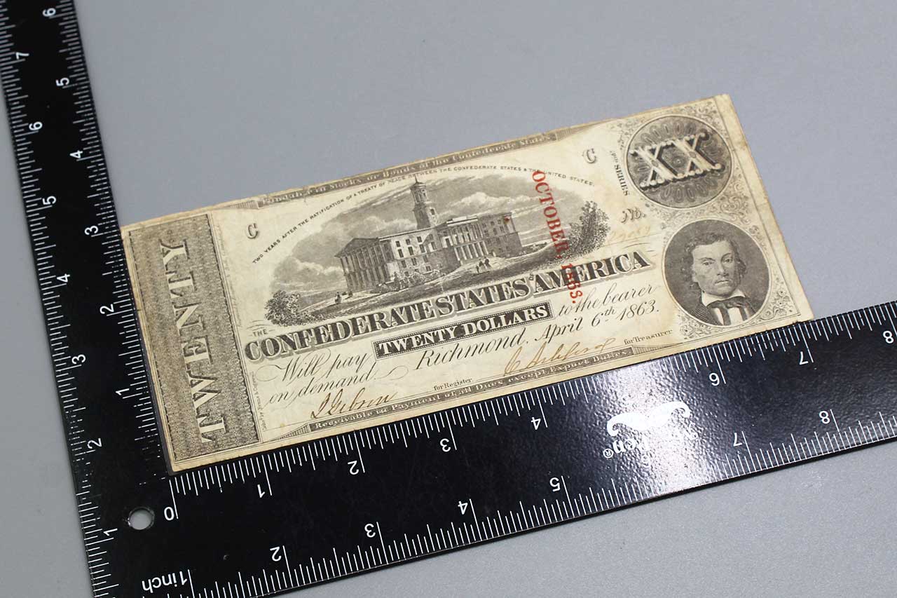 American Civil War CSA Confederate 1864 Twenty ($20) Bank Note. Currency is dated Richmond April 6, 1863 and numbered which is very faded, however, appears to be No. 27052. Also, red ink stamped October 1863. Hand Signed. Worn, stained, and circulated condition.