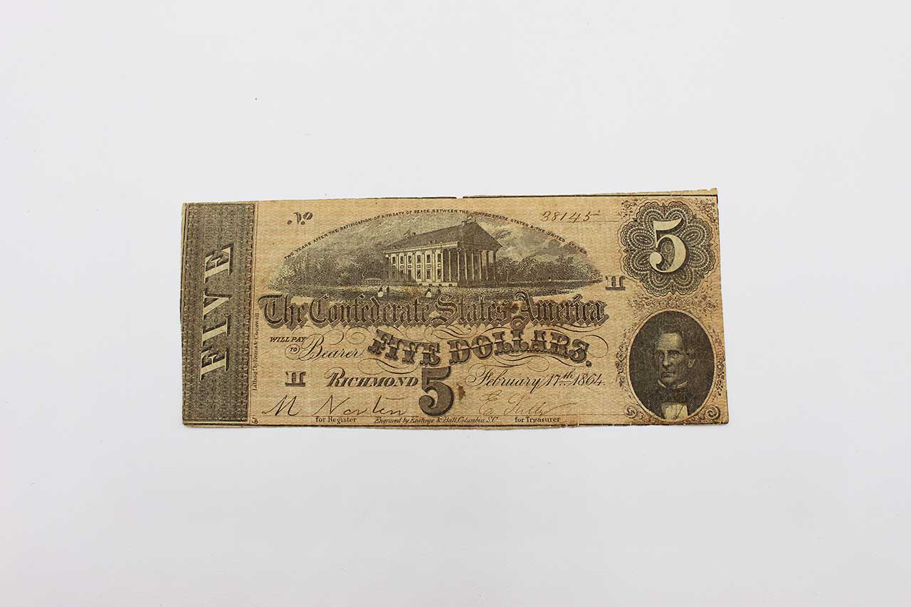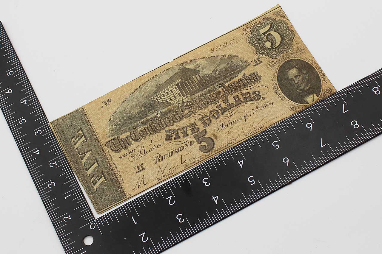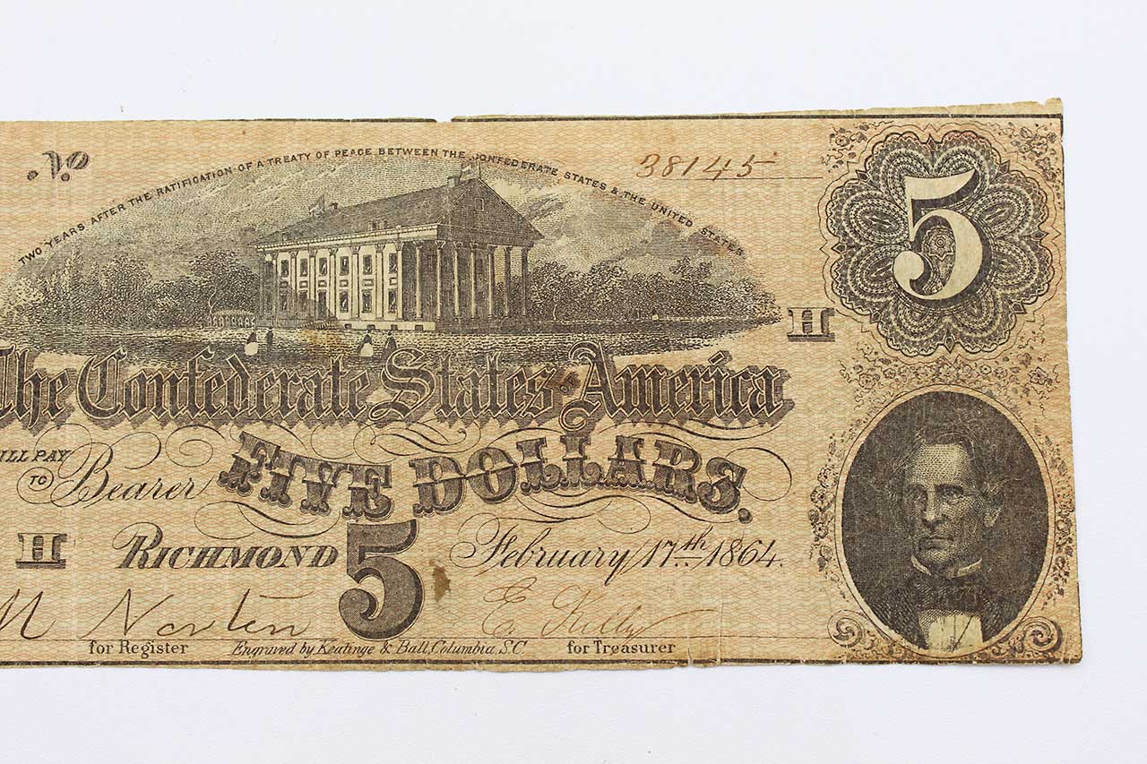 American Civil War CSA Confederate 1864 Five ($5) Note. Currency is dated February 17, 1864 and Numbered appears to be No. 38145. Hand Signed. Worn and circulated condition.