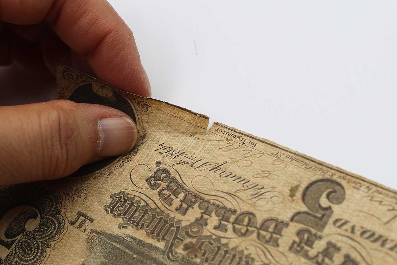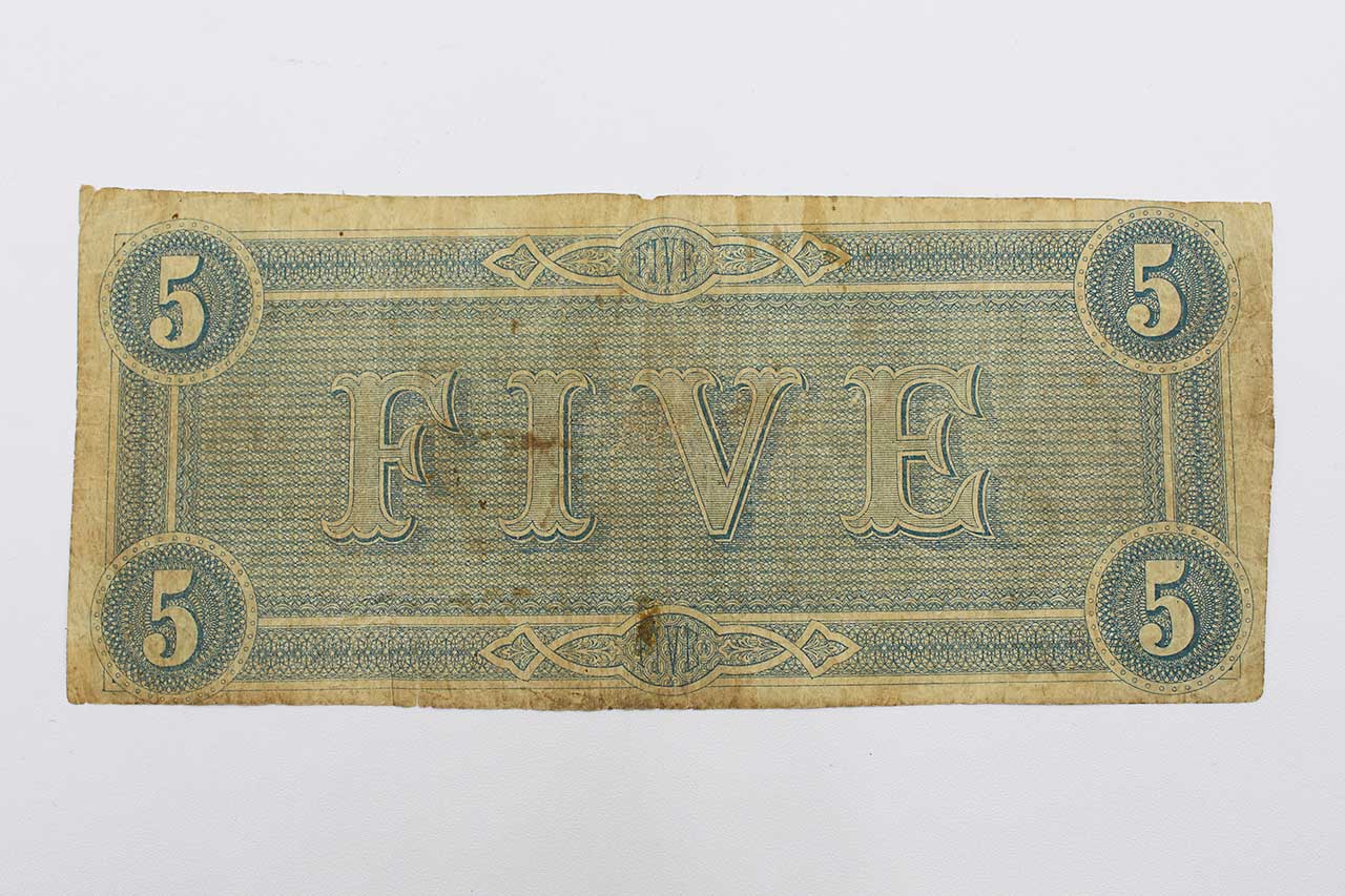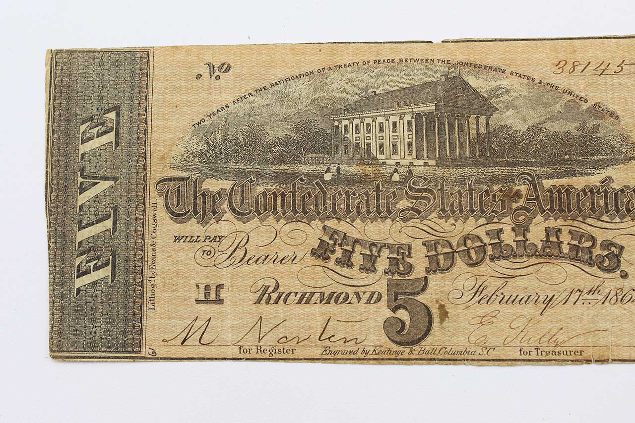 American Civil War CSA Confederate 1864 Five ($5) Note. Currency is dated February 17, 1864 and Numbered appears to be No. 38145. Hand Signed. Worn and circulated condition.