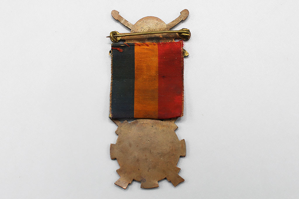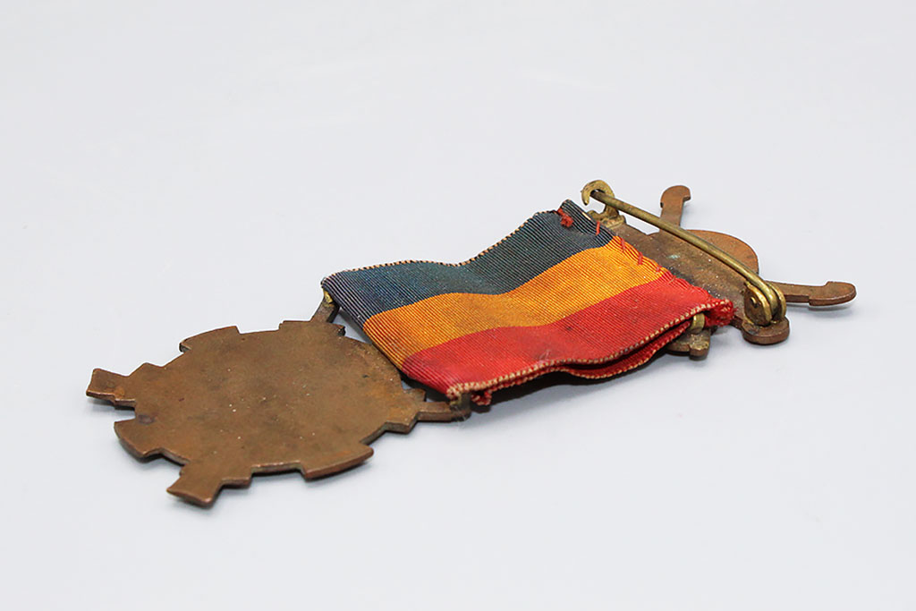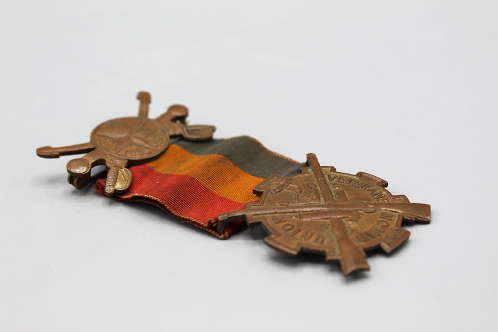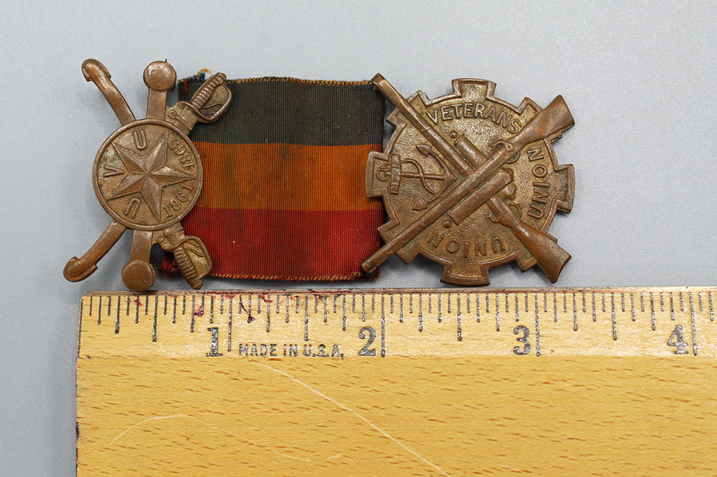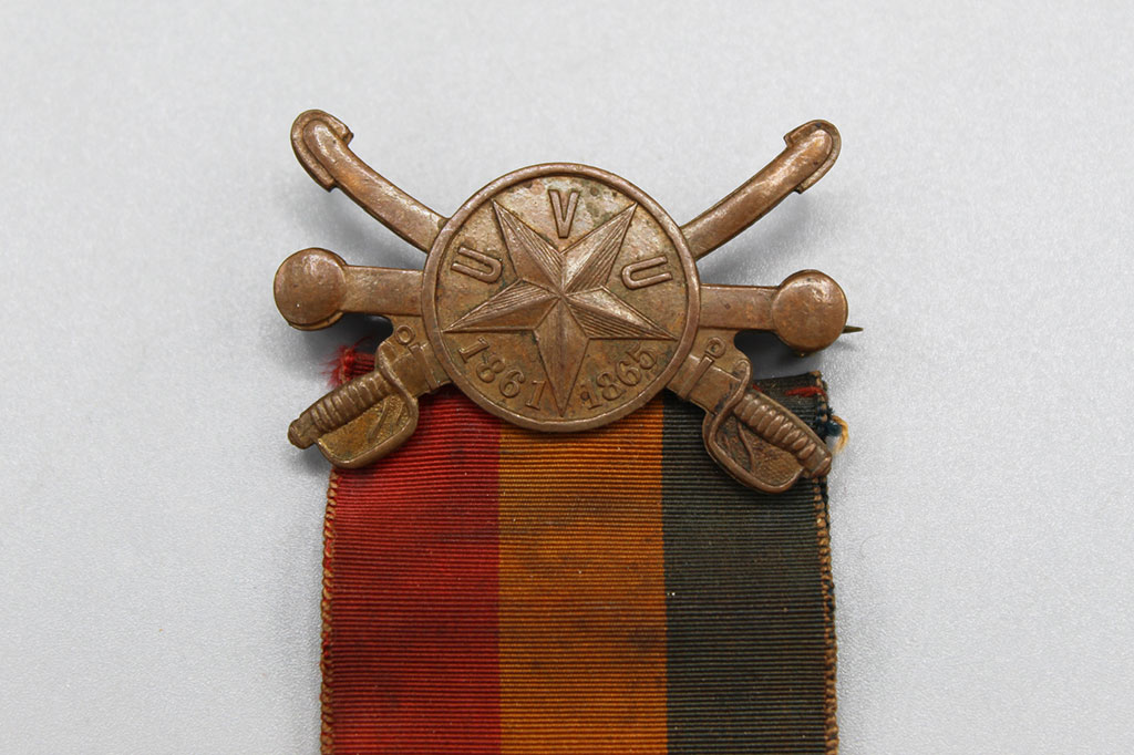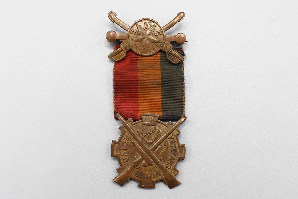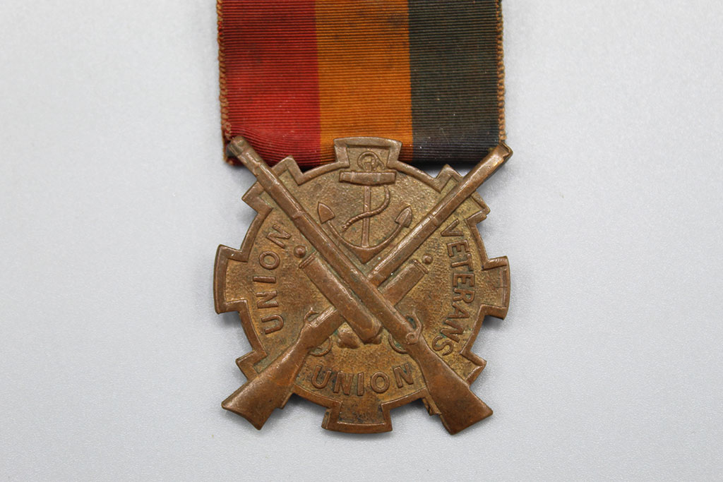 A scarce, early issue Union 1861-1865 Union of Union Veterans Medal measuring approx. 3.50″ long. This medal has the original red, yellow, blue panel ribbon which has hand sewn stitching on the backside.