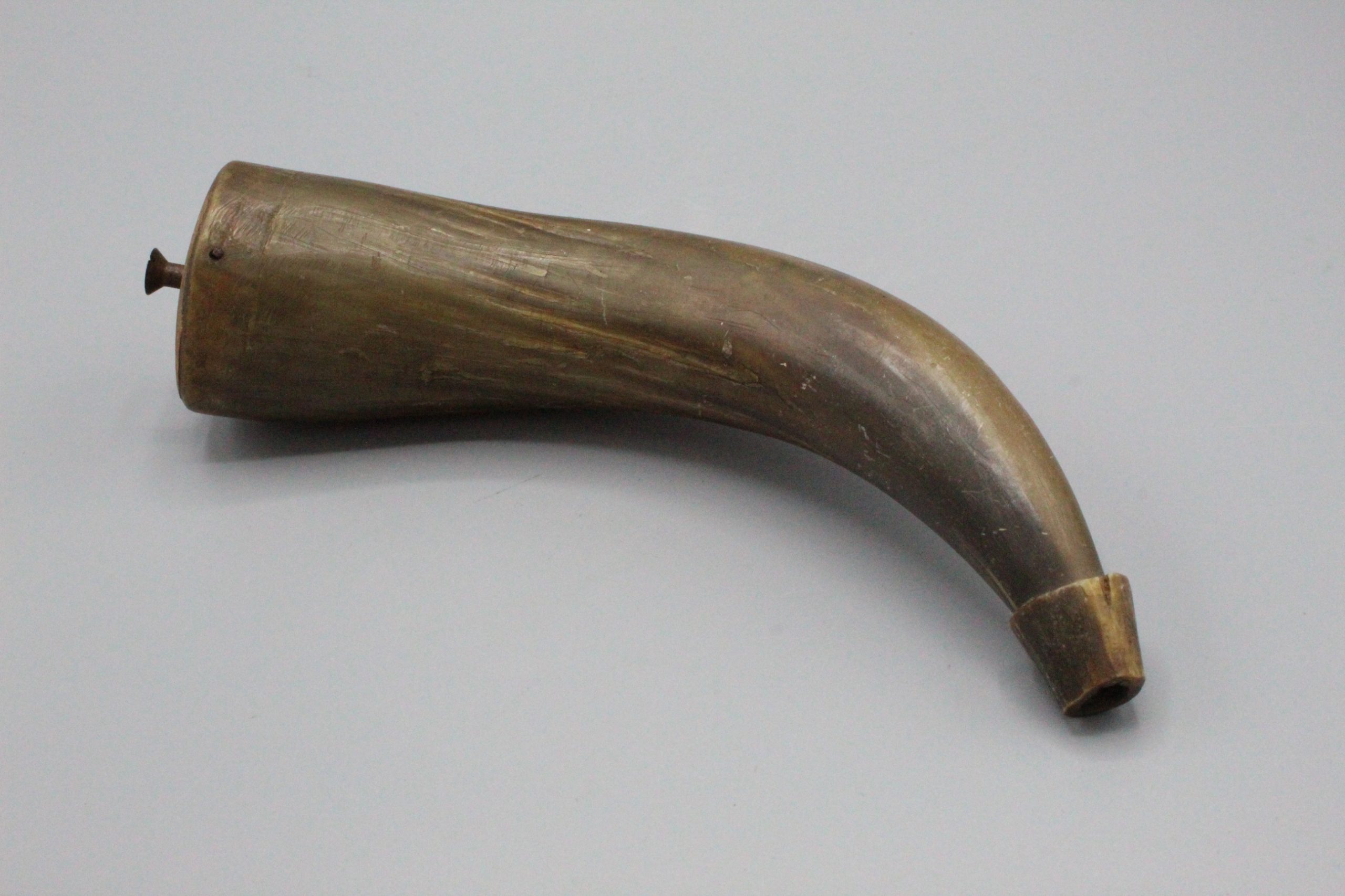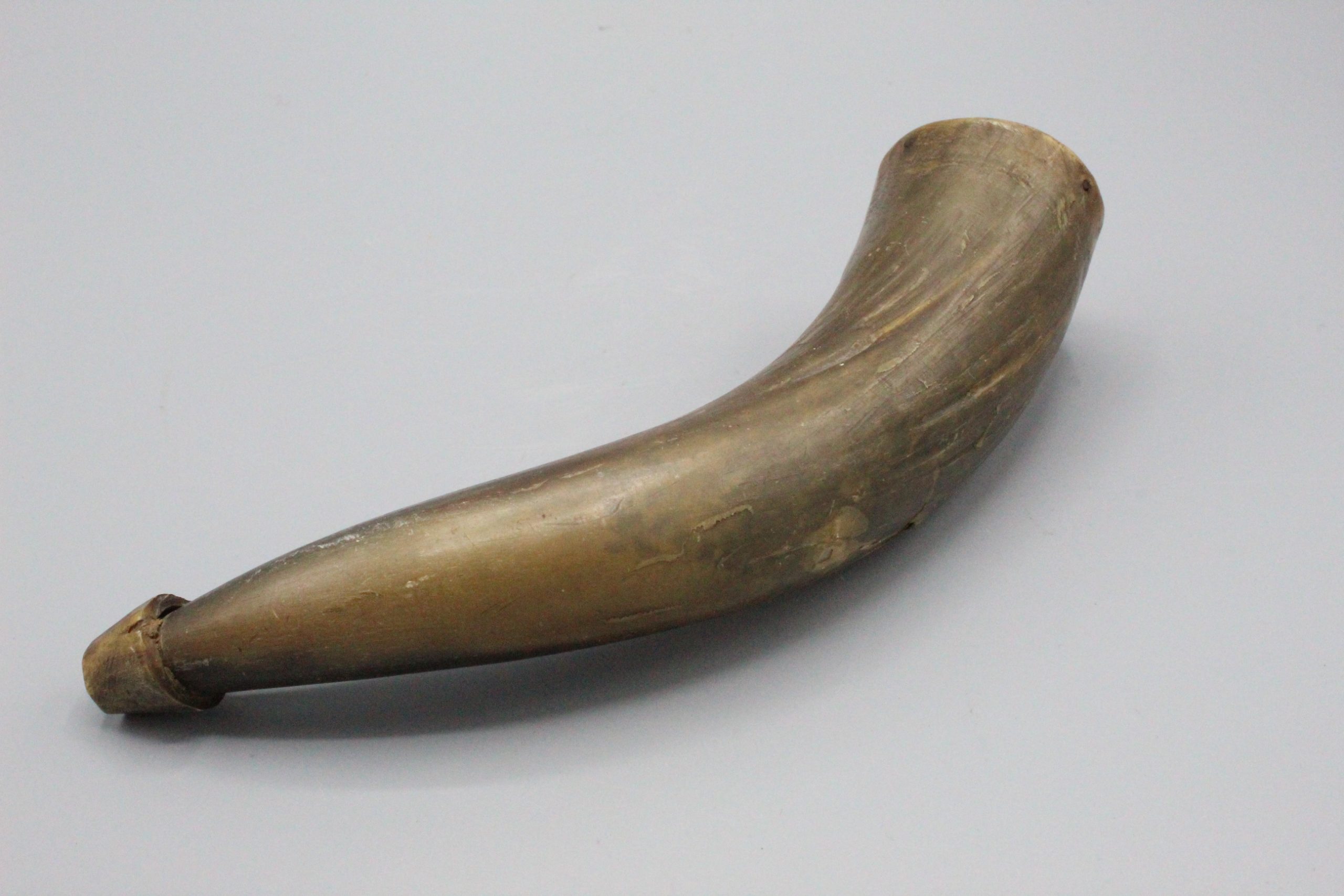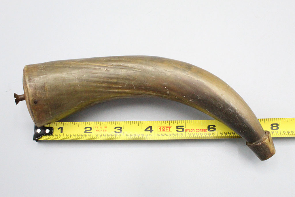American circa. 1800s Powder horn (most likely around civil war era), about 8 inches in size. There are two holes and cracks along the horn. Very worn condition.