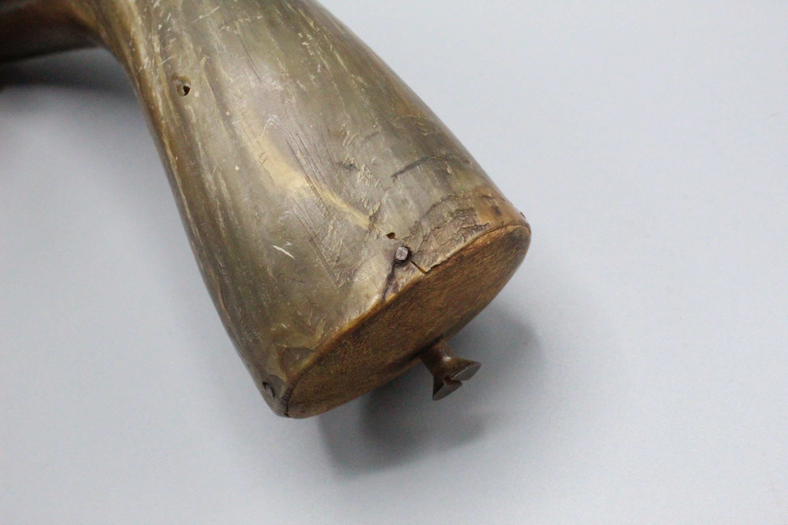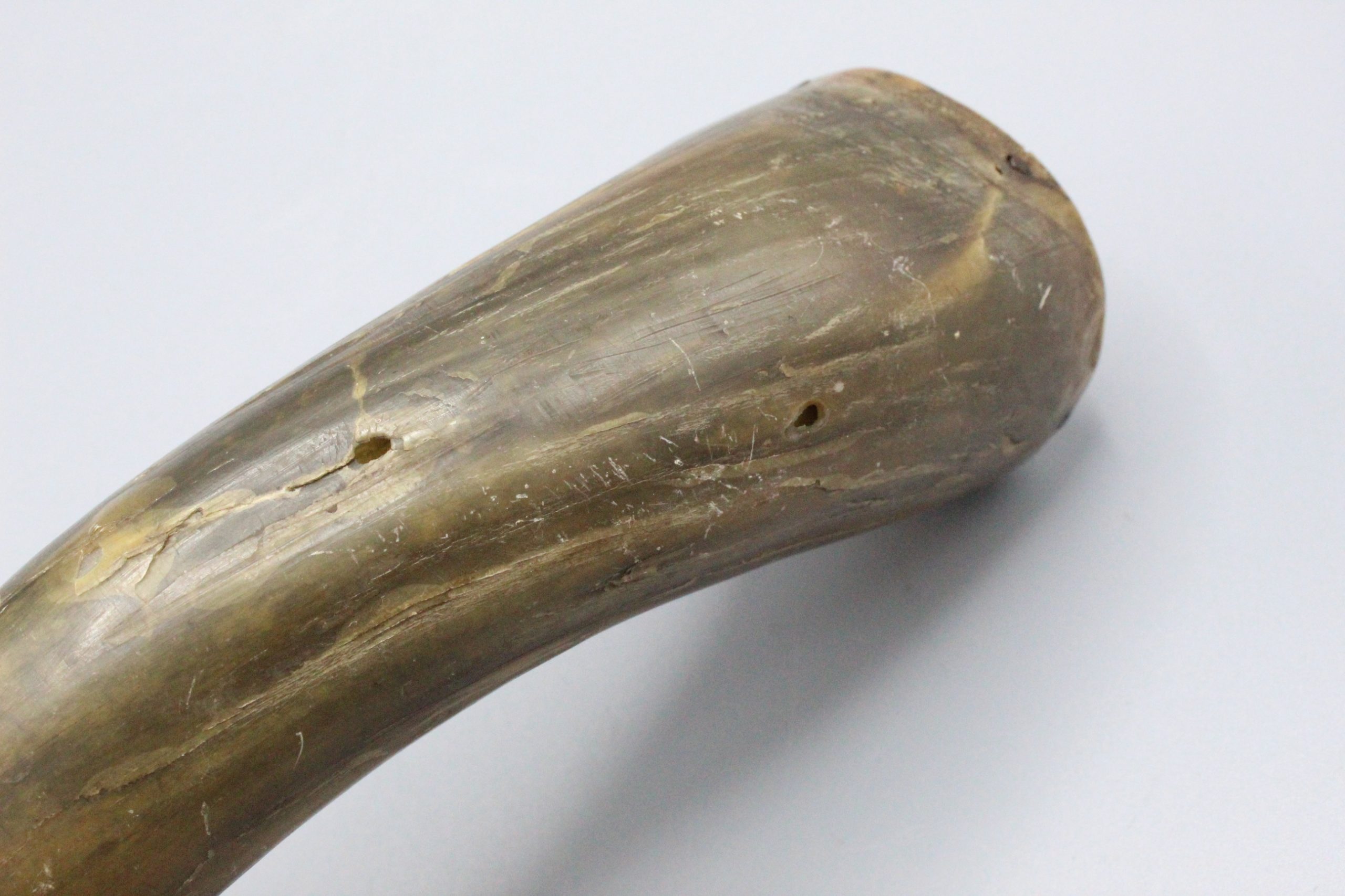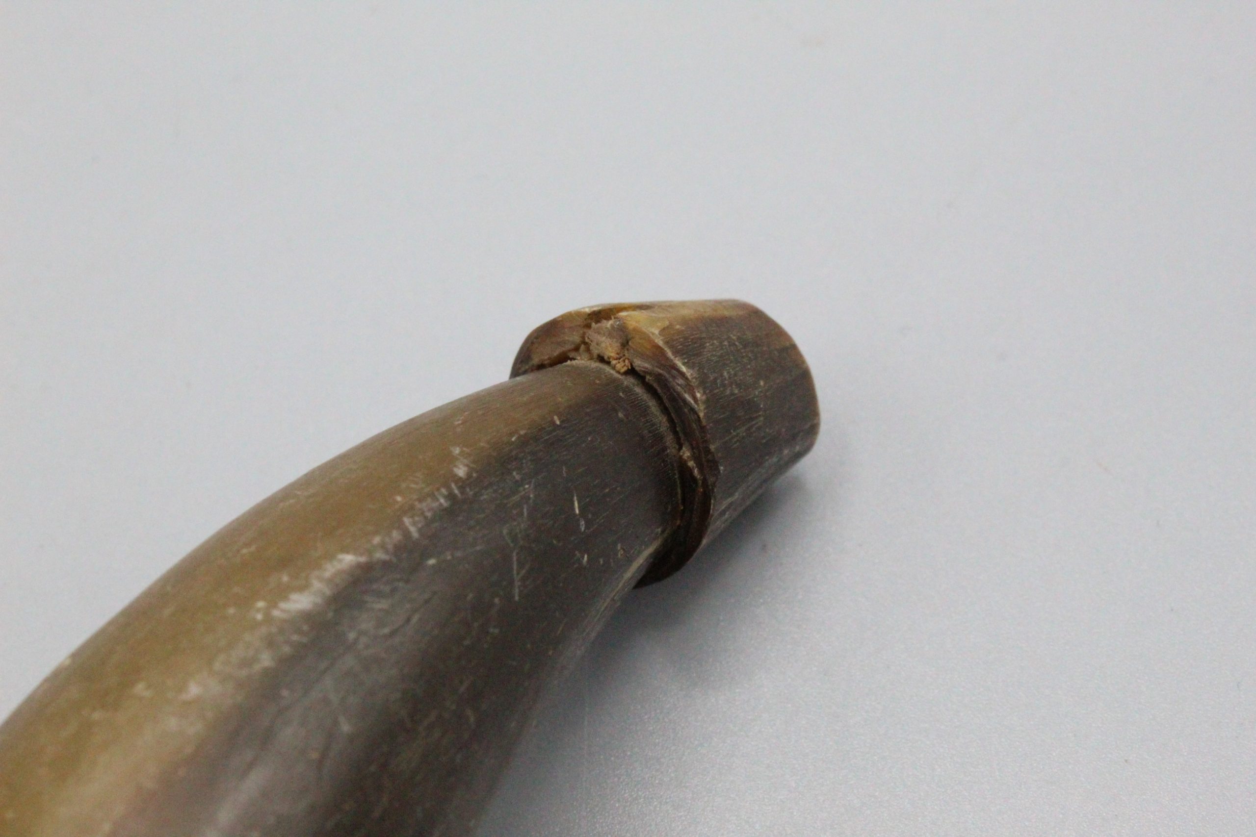 American circa. 1800s Powder horn (most likely around civil war era), about 8 inches in size. There are two holes and cracks along the horn. Very worn condition.