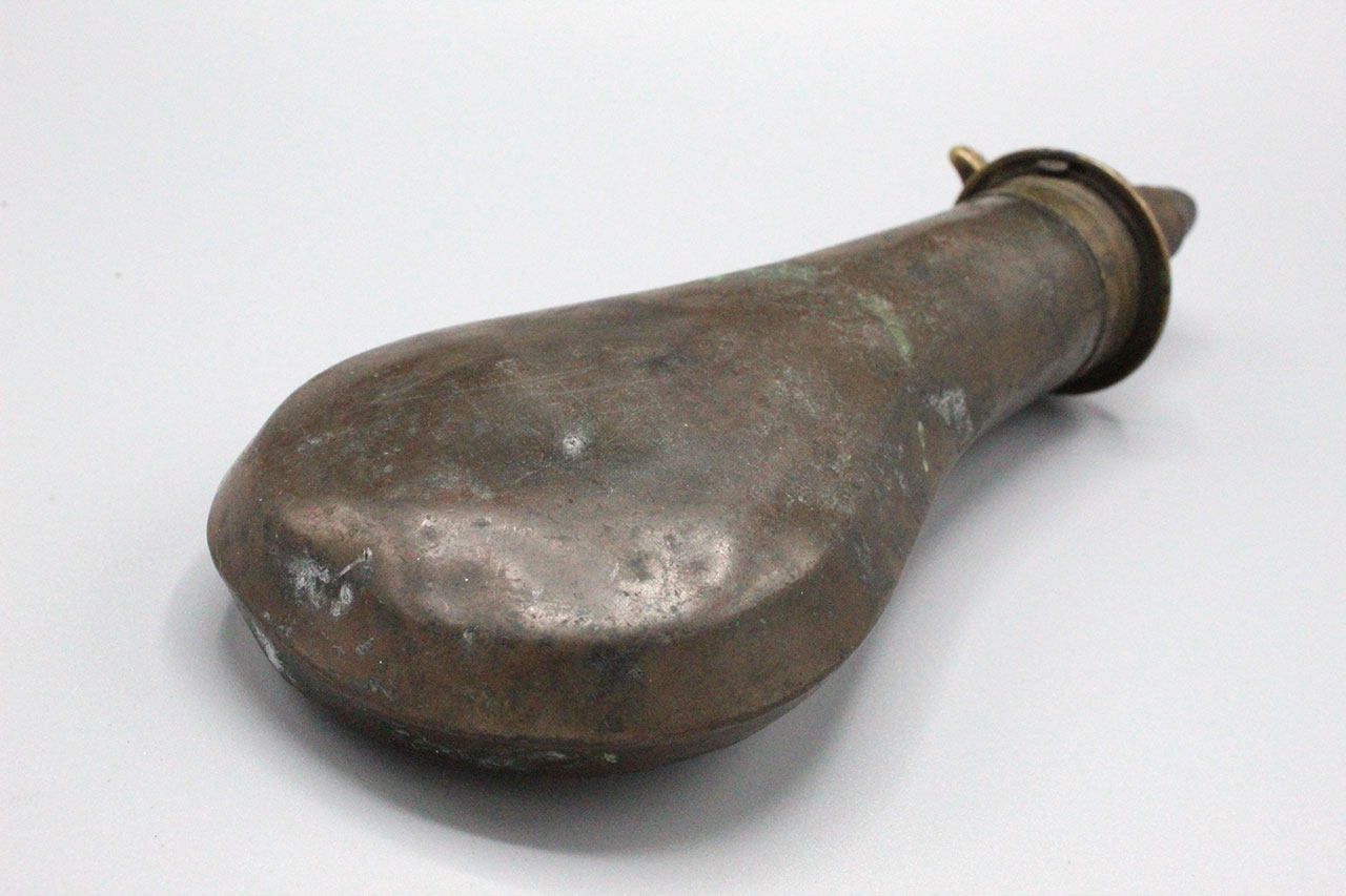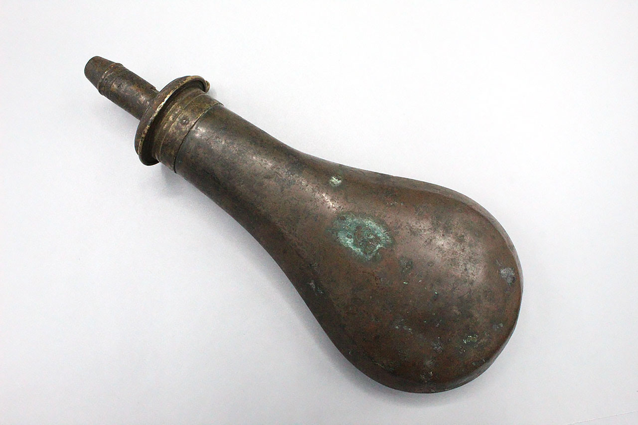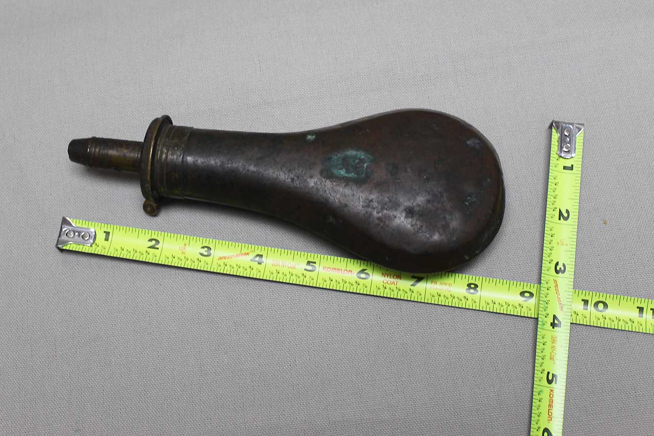 United States 1850s-1860s Powder Flask. Copper based flask with brass top with adjustable charger. Plain design which is typically seen on the earlier flasks. Marker marked on top, however, difficult to make out. Worn condition.