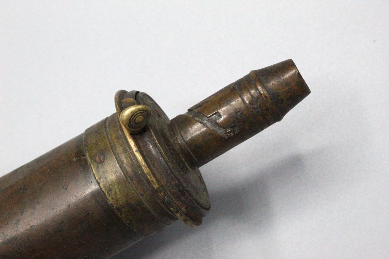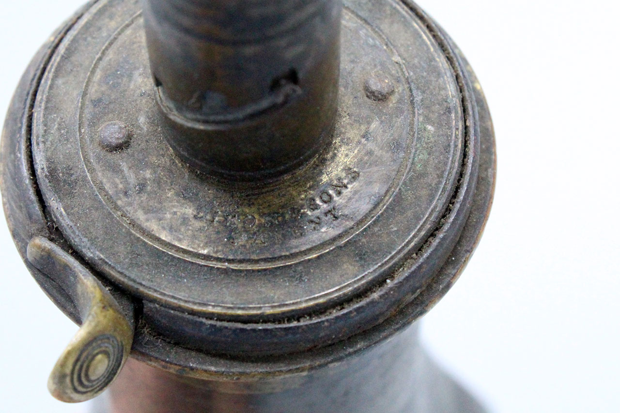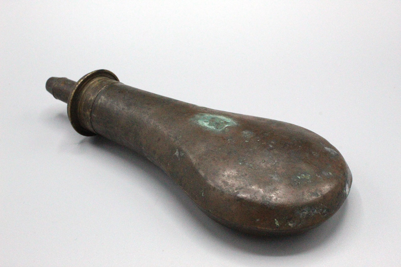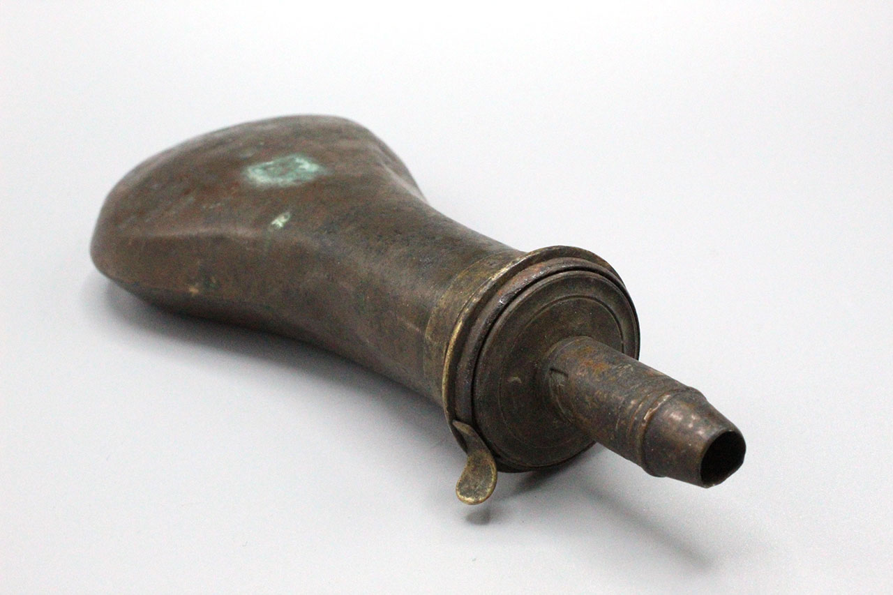 United States 1850s-1860s Powder Flask. Copper based flask with brass top with adjustable charger. Plain design which is typically seen on the earlier flasks. Marker marked on top, however, difficult to make out. Worn condition.