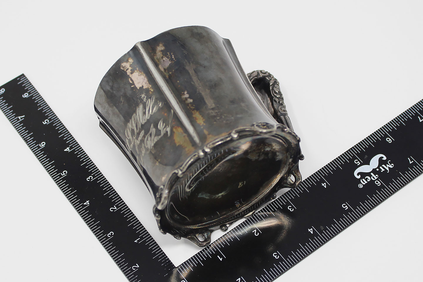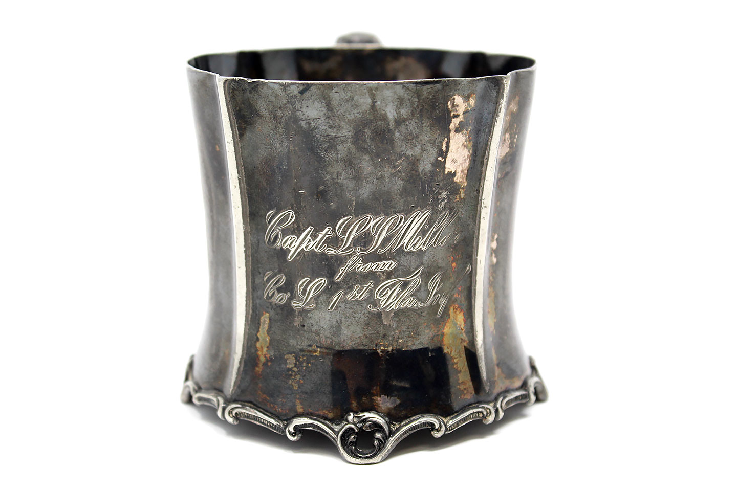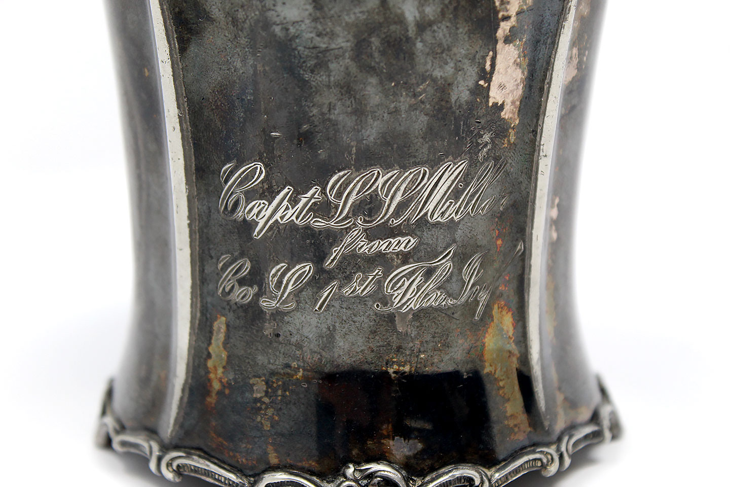 U.S. Presentation Silver Cup. Most likely silver plated. Marker marked on bottom of cup with 1883 in logo that should date to late 1800s (post American Civil War / Indian wars era, most likely a Civil War re-union cup). Inscribed to a Captain L.P. Miller Co. L from 1st Florida Infantry.